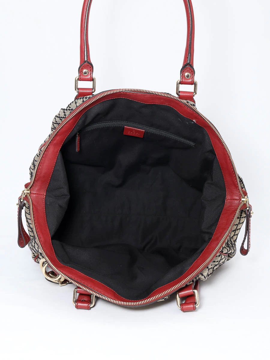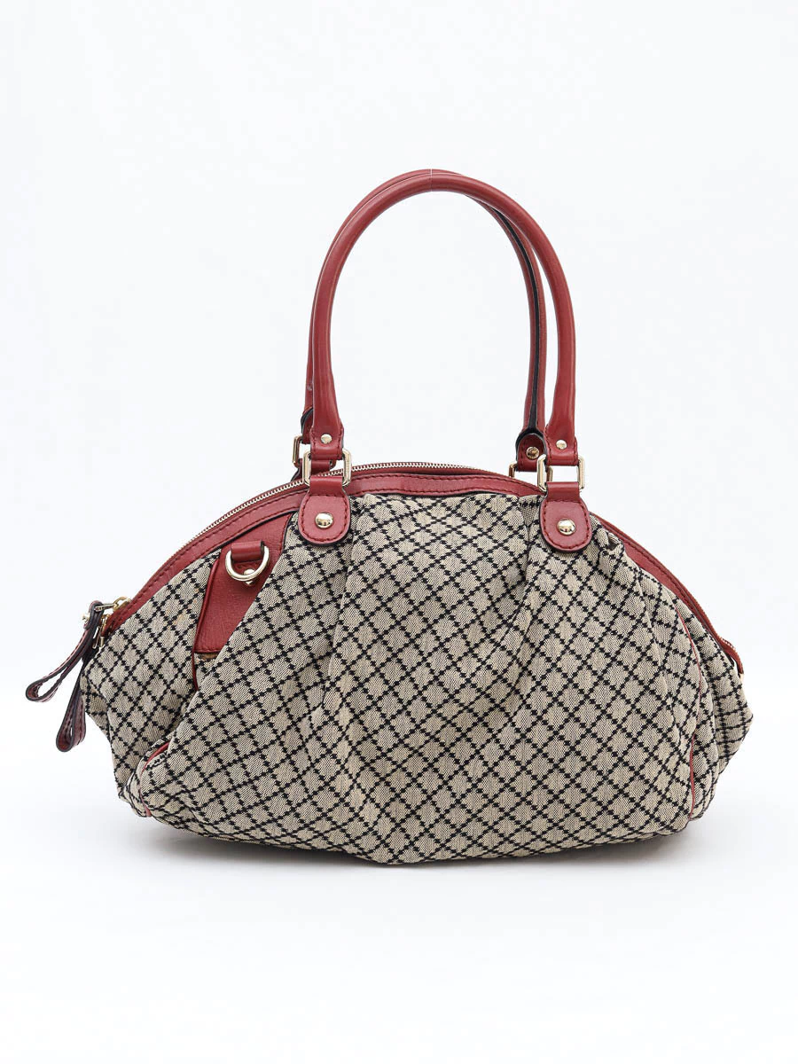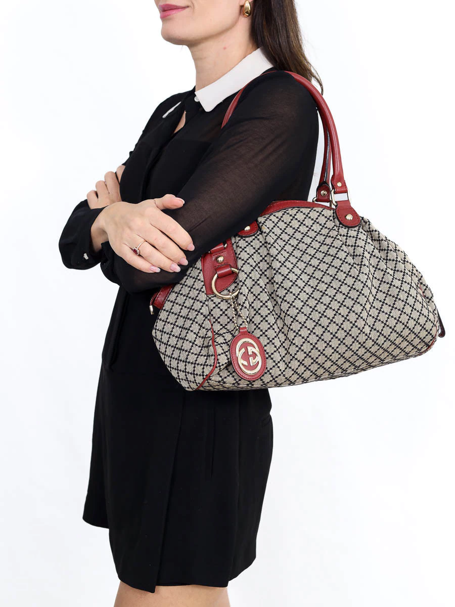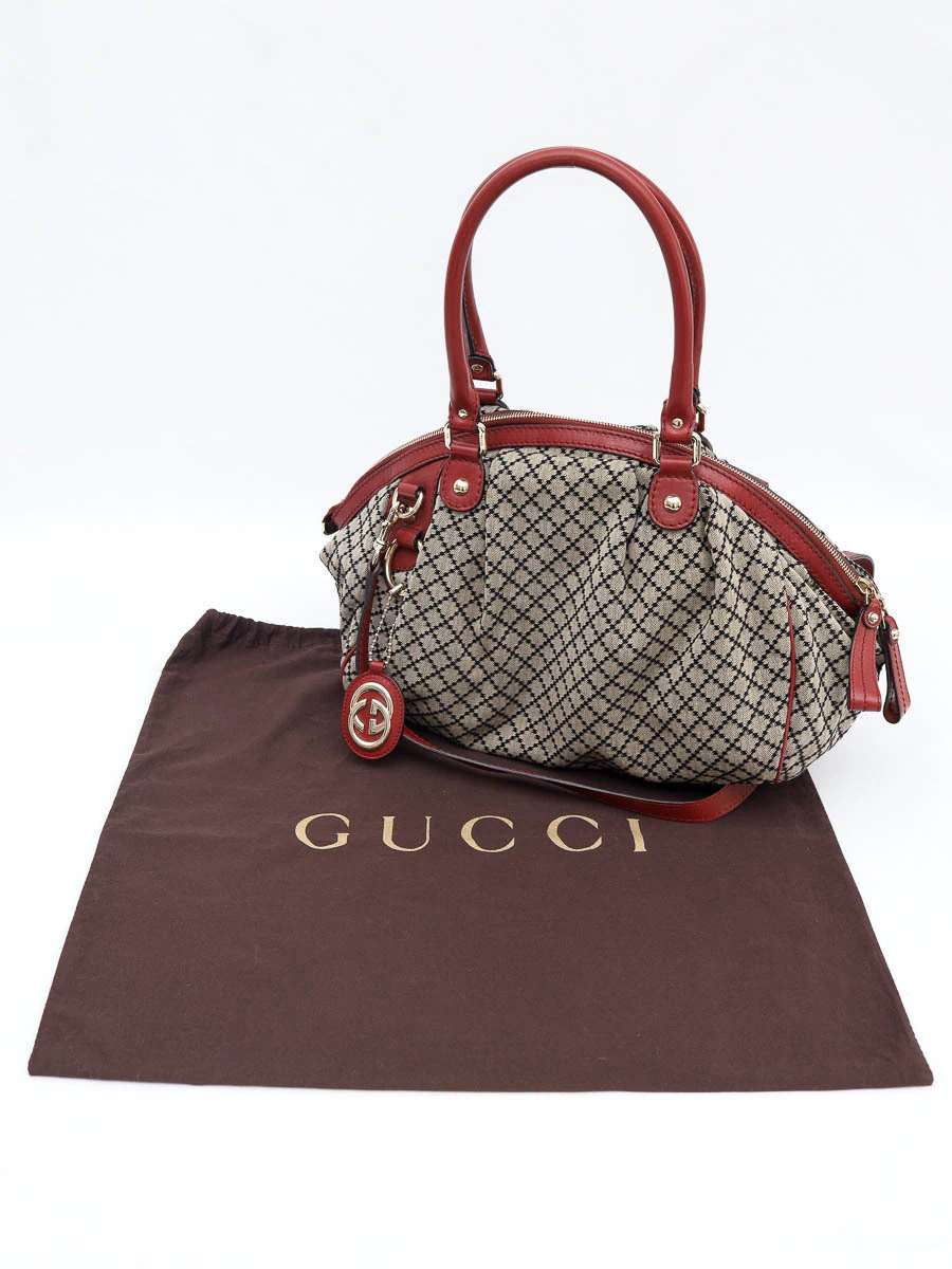 Esta chique e sofisticada Bolsa Gucci Sukey Diamond no tamanho médio, produzida em tecido com estampa "Diamond" é um grande sucesso de vendas da marca. Confortável, muito leve e espaçosa, o modelo apresenta uma alça de ombro e detalhes em couro na cor vermelho terra, um belíssimo pingente da Gucci com logotipo GG e detalhes plissados no canvas e uma alça longa removível.