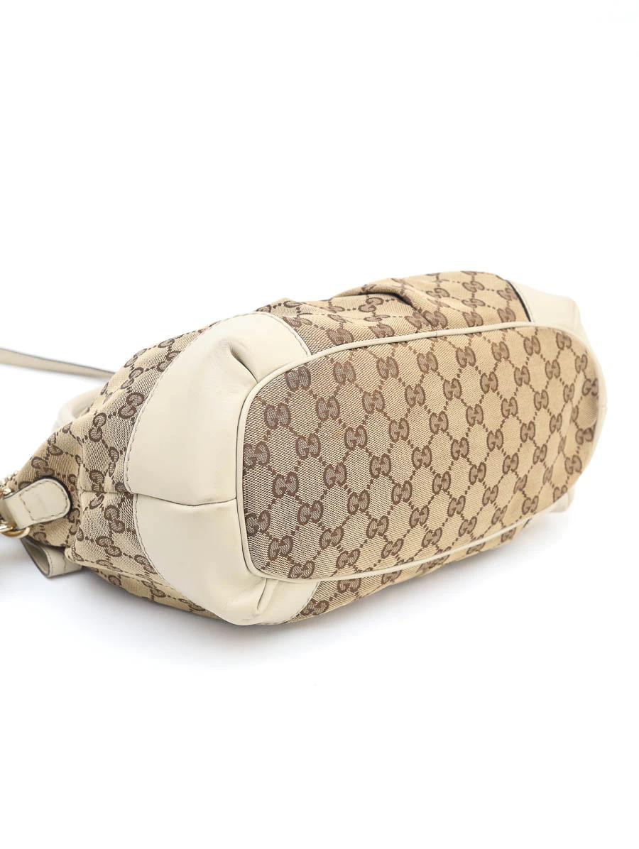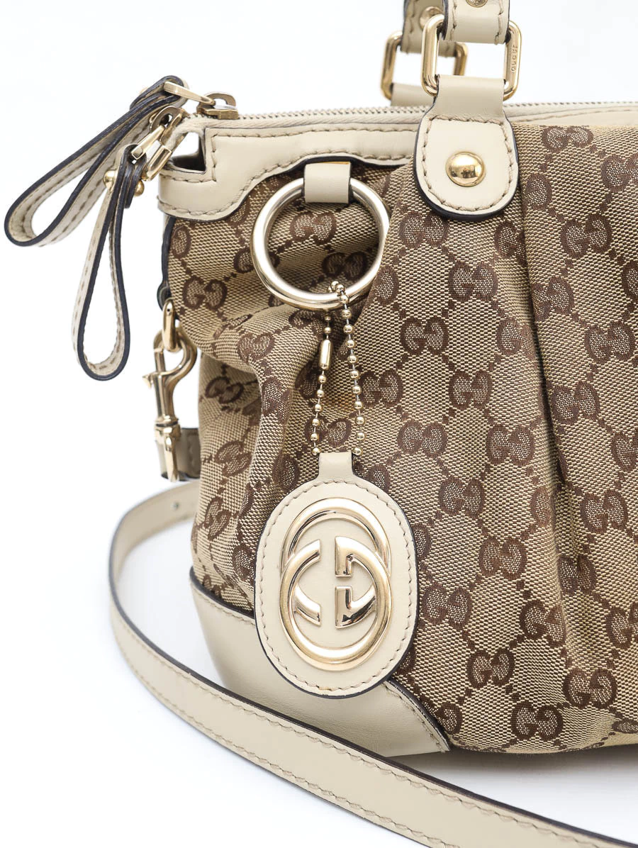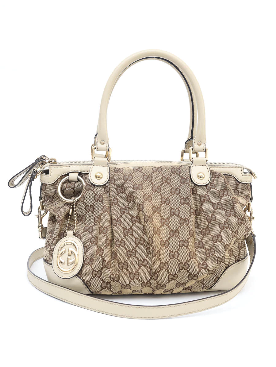 Esta elegante e sofisticada Bolsa Gucci Sukey é confeccionada em tecido resistente com a icônica estampa GG nas clássicas cores ébano e bege. O modelo conta com metais prateados, que acrescentam um toque refinado à peça, duas alças de ombro e uma alça longa removível. Extremamente confortável, leve e espaçosa, a bolsa possui alça de ombro e acabamentos em couro bege, além de um charmoso pingente com o logotipo GG e delicados detalhes plissados no tecido, que garantem um visual ainda mais sofisticado e atemporal.