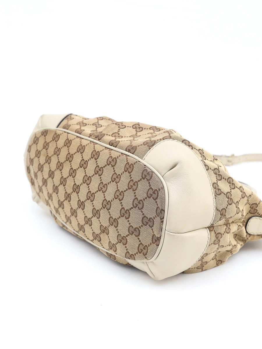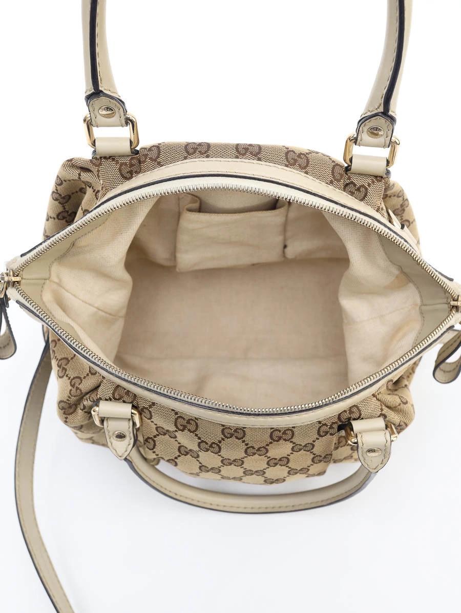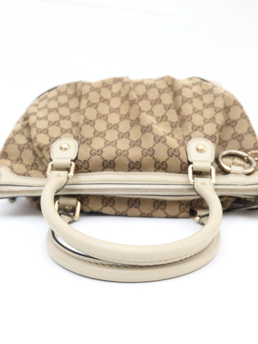 Esta elegante e sofisticada Bolsa Gucci Sukey é confeccionada em tecido resistente com a icônica estampa GG nas clássicas cores ébano e bege. O modelo conta com metais prateados, que acrescentam um toque refinado à peça, duas alças de ombro e uma alça longa removível. Extremamente confortável, leve e espaçosa, a bolsa possui alça de ombro e acabamentos em couro bege, além de um charmoso pingente com o logotipo GG e delicados detalhes plissados no tecido, que garantem um visual ainda mais sofisticado e atemporal.