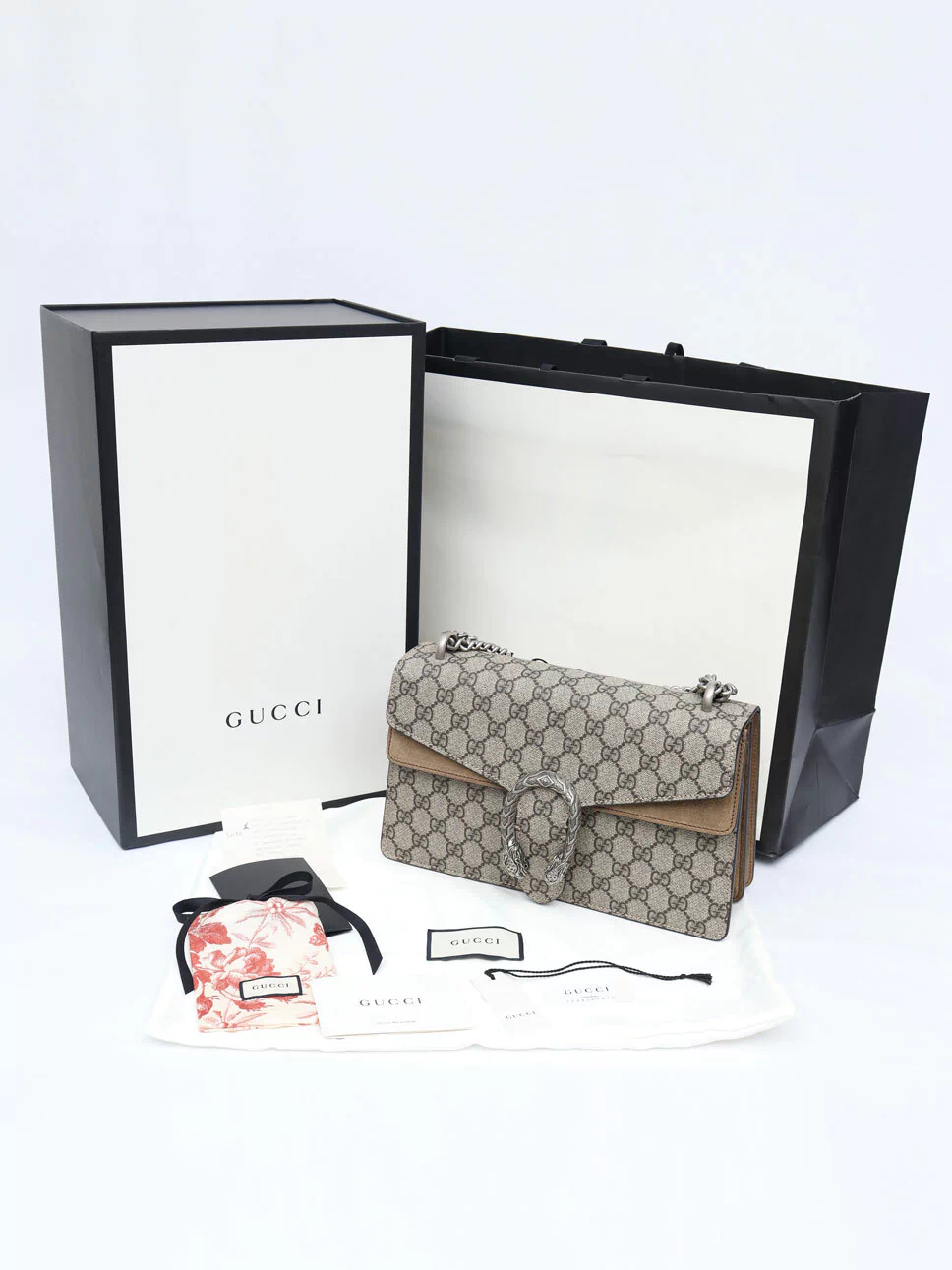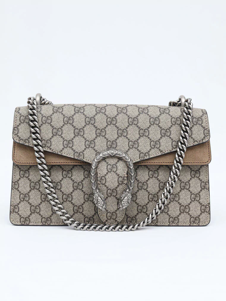 A Bolsa Autêntica Gucci Supreme Dionysus Small Shoulder é um verdadeiro sucesso da marca, elegante e luxuosa. Produzida em material canvas com estampa GG Supreme e lindo acabamento em camurça, apresenta um maravilhoso adorno em metal na abertura da bolsa com cabeças de tigres (referência ao deus grego Dionísio), abertura com fecho oculto, interior com dois compartimentos abertos e um compartimento com zíper. A alça de corrente deslizante pode ser usada mais longa ou com as correntes duplas. Não perca esse achado impecável!