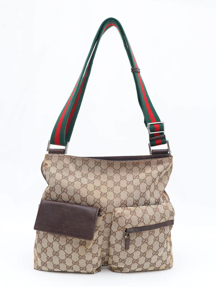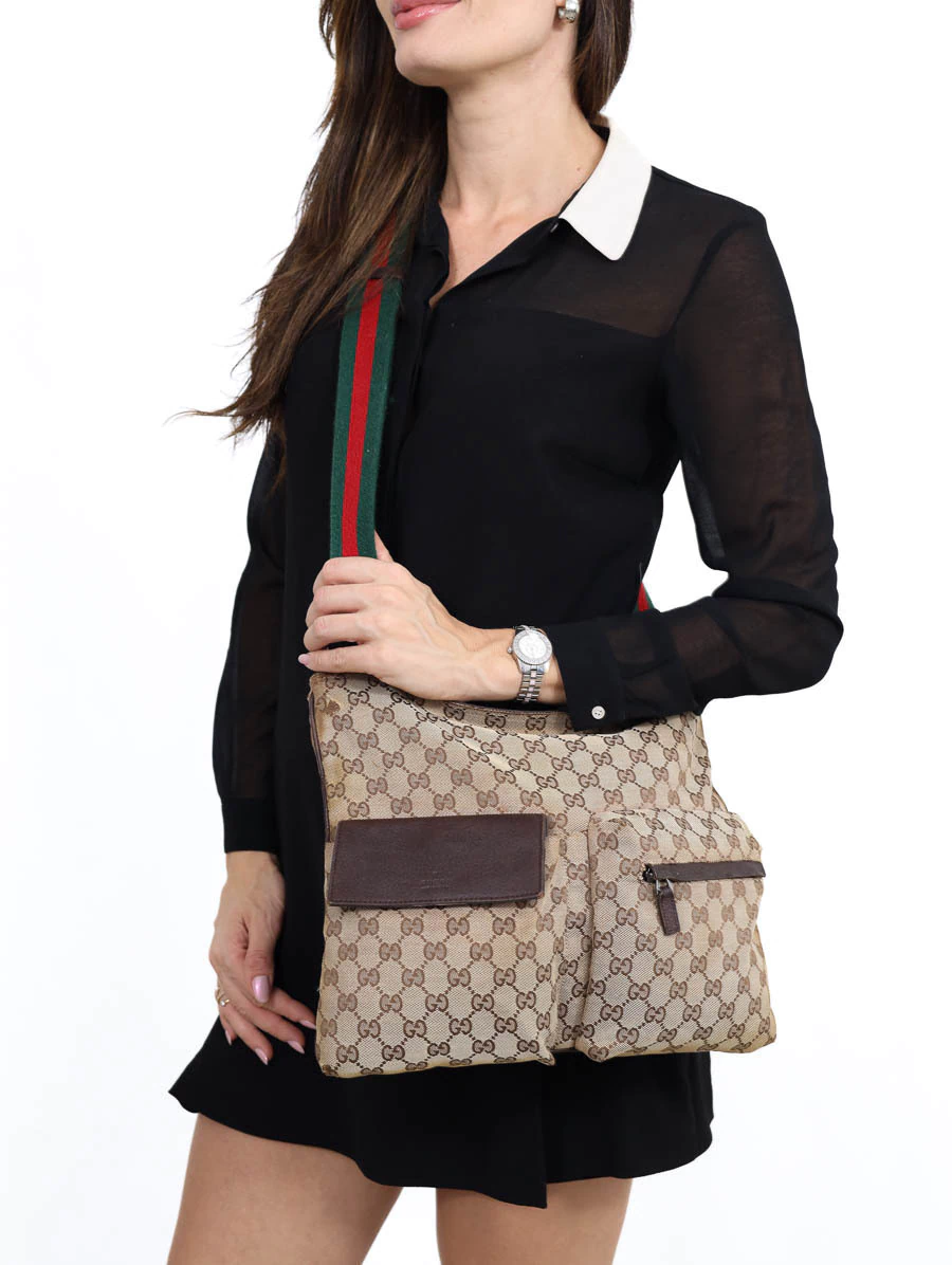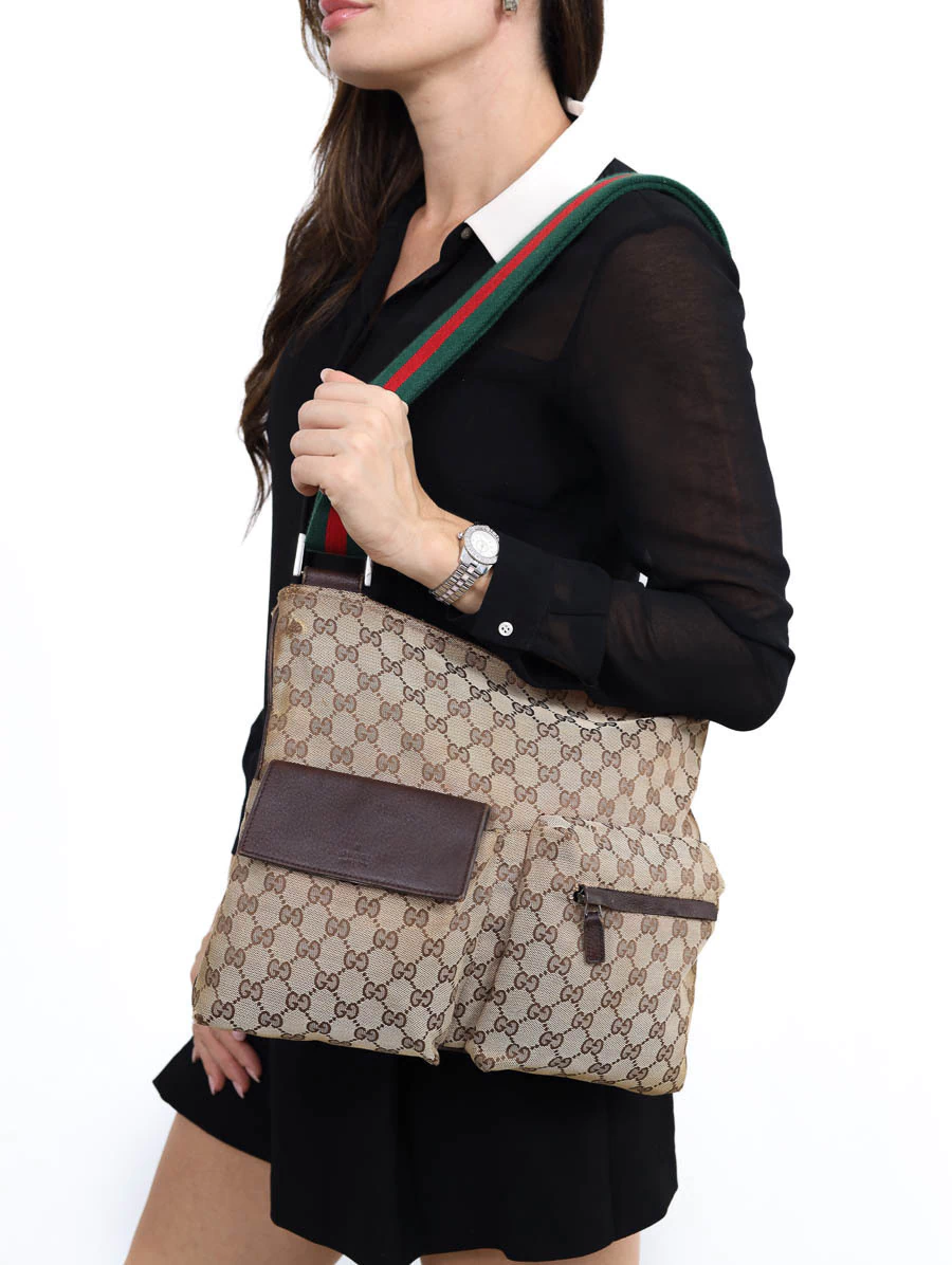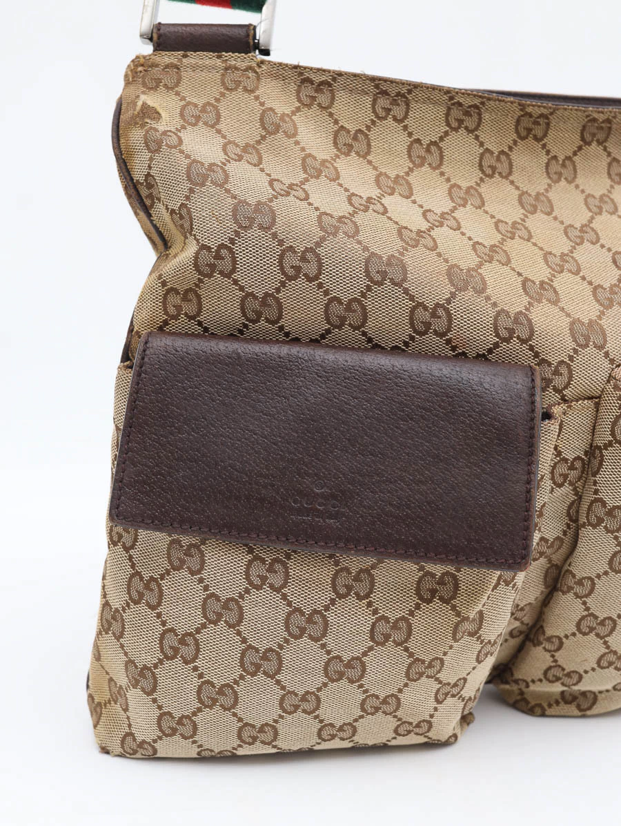 Bolsa Gucci Vintage produzida em tecido canvas com detalhes em couro marrom. Apresenta alça faixa web nas cores verde e vermelho, com regulagem através de fivela, podendo ser ajustada desde uma alça de ombro até uma alça crossbody. Possui abertura por zíper e compartimento único com um bolso com zíper e um bolso pequeno, e dois bolsos com fechamento na parte externa.