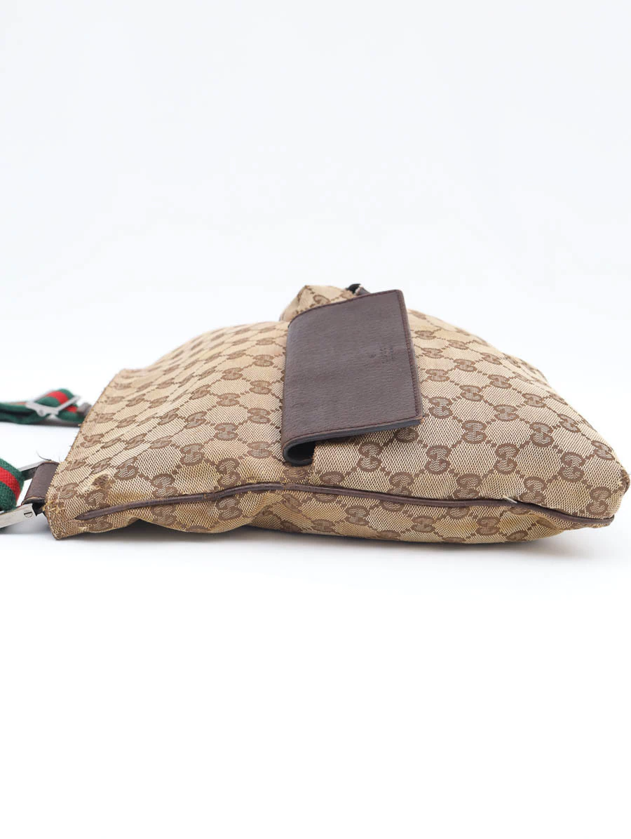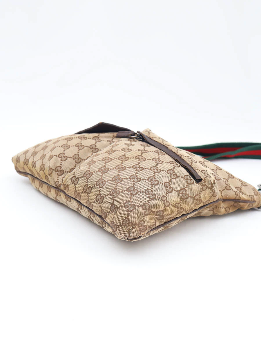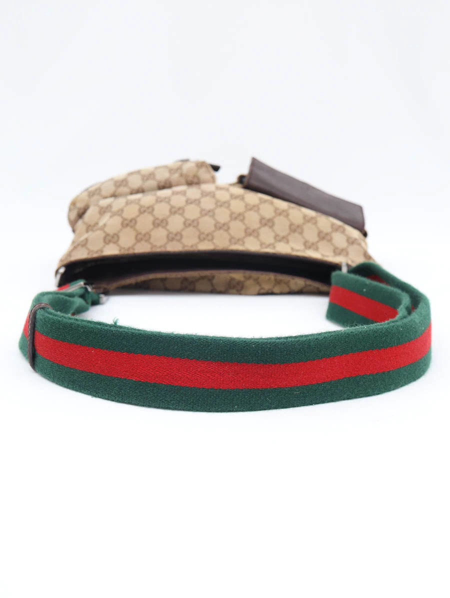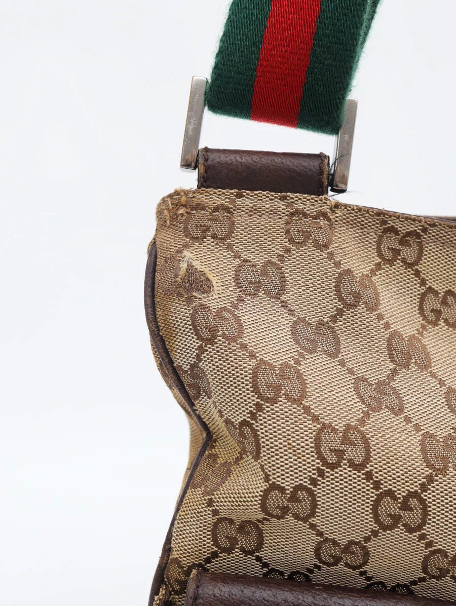 Bolsa Gucci Vintage produzida em tecido canvas com detalhes em couro marrom. Apresenta alça faixa web nas cores verde e vermelho, com regulagem através de fivela, podendo ser ajustada desde uma alça de ombro até uma alça crossbody. Possui abertura por zíper e compartimento único com um bolso com zíper e um bolso pequeno, e dois bolsos com fechamento na parte externa.