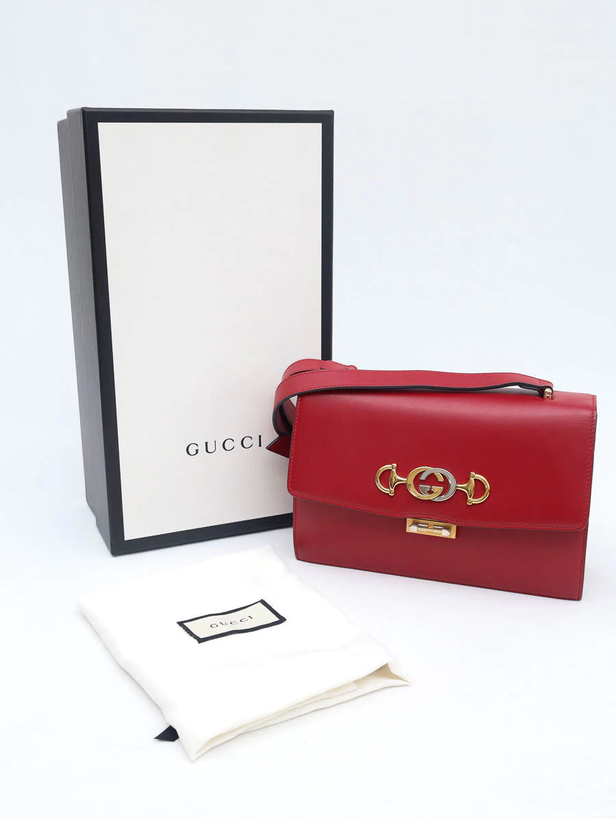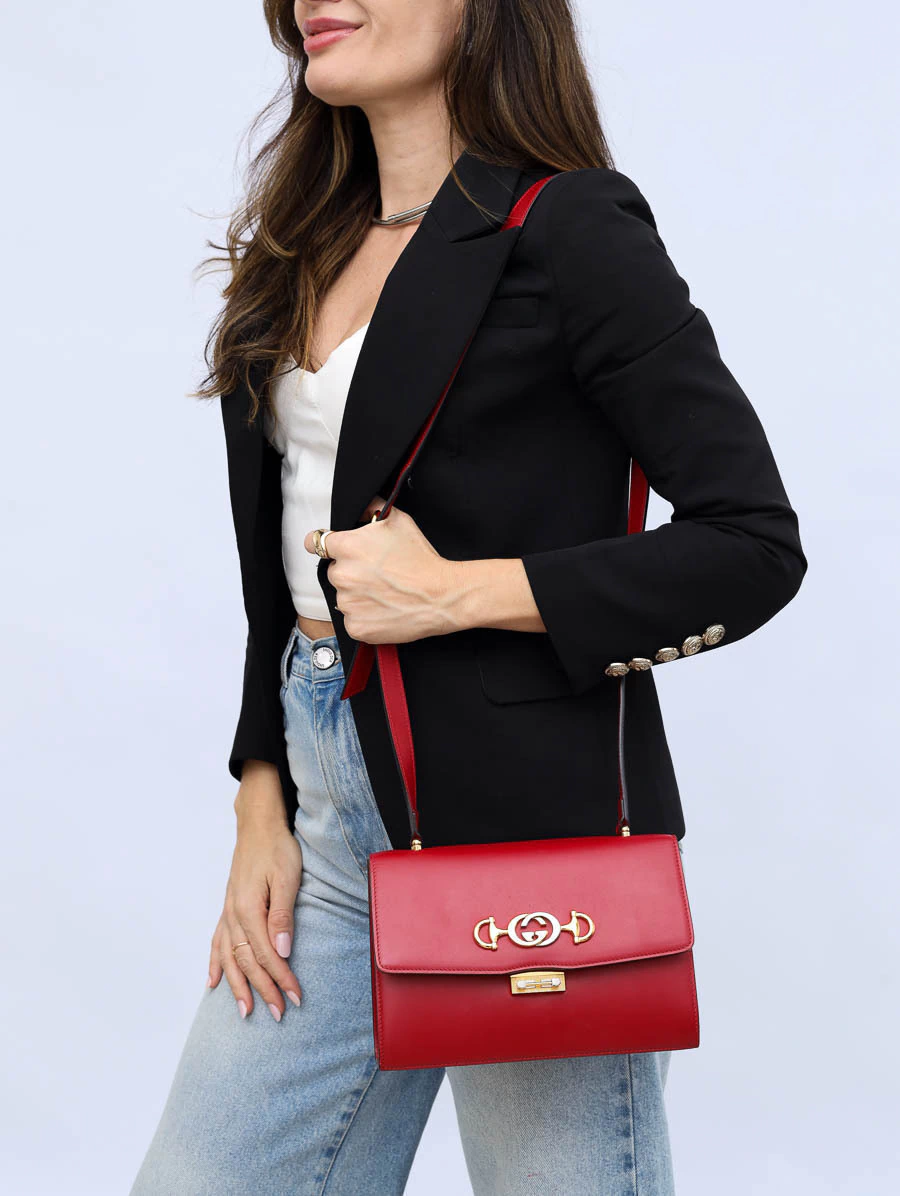 Bolsa original Gucci Zumi Shoulder Bag em couro vermelho, com o icônico detalhe Horsebit combinado ao monograma GG em metal dourado e prateado. Modelo elegante, estruturado e contemporâneo, perfeito para compor produções sofisticadas.