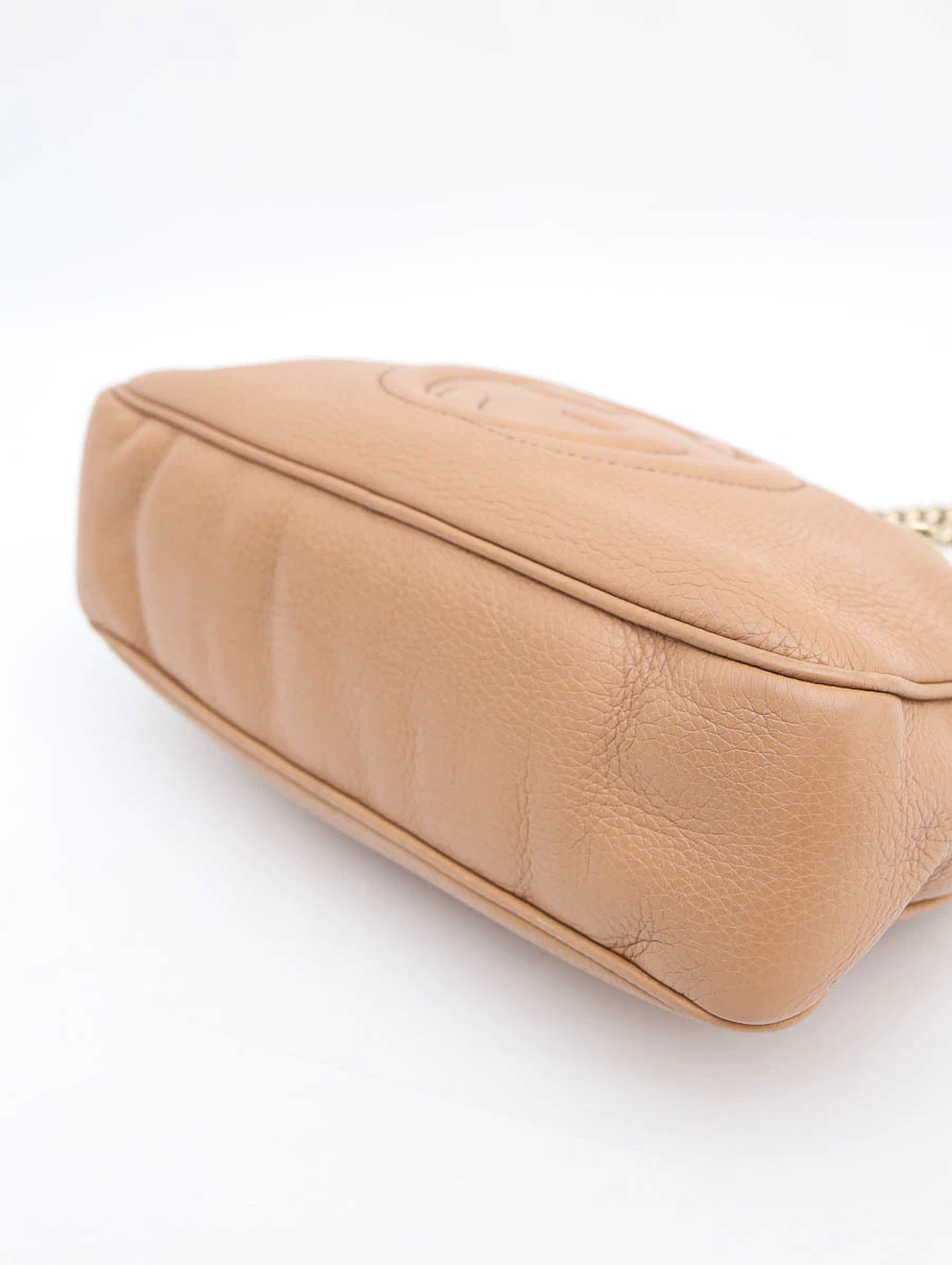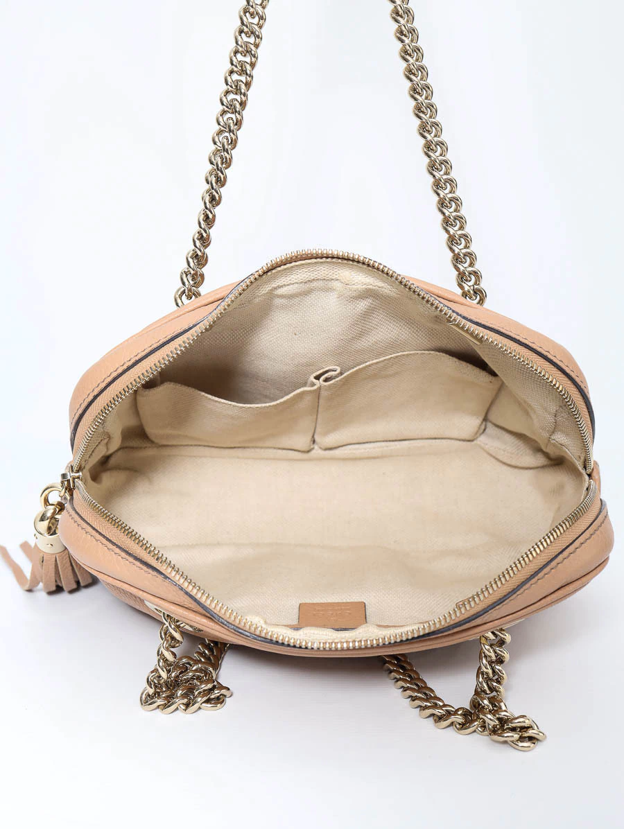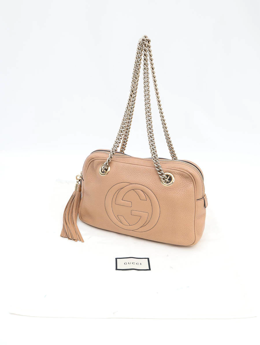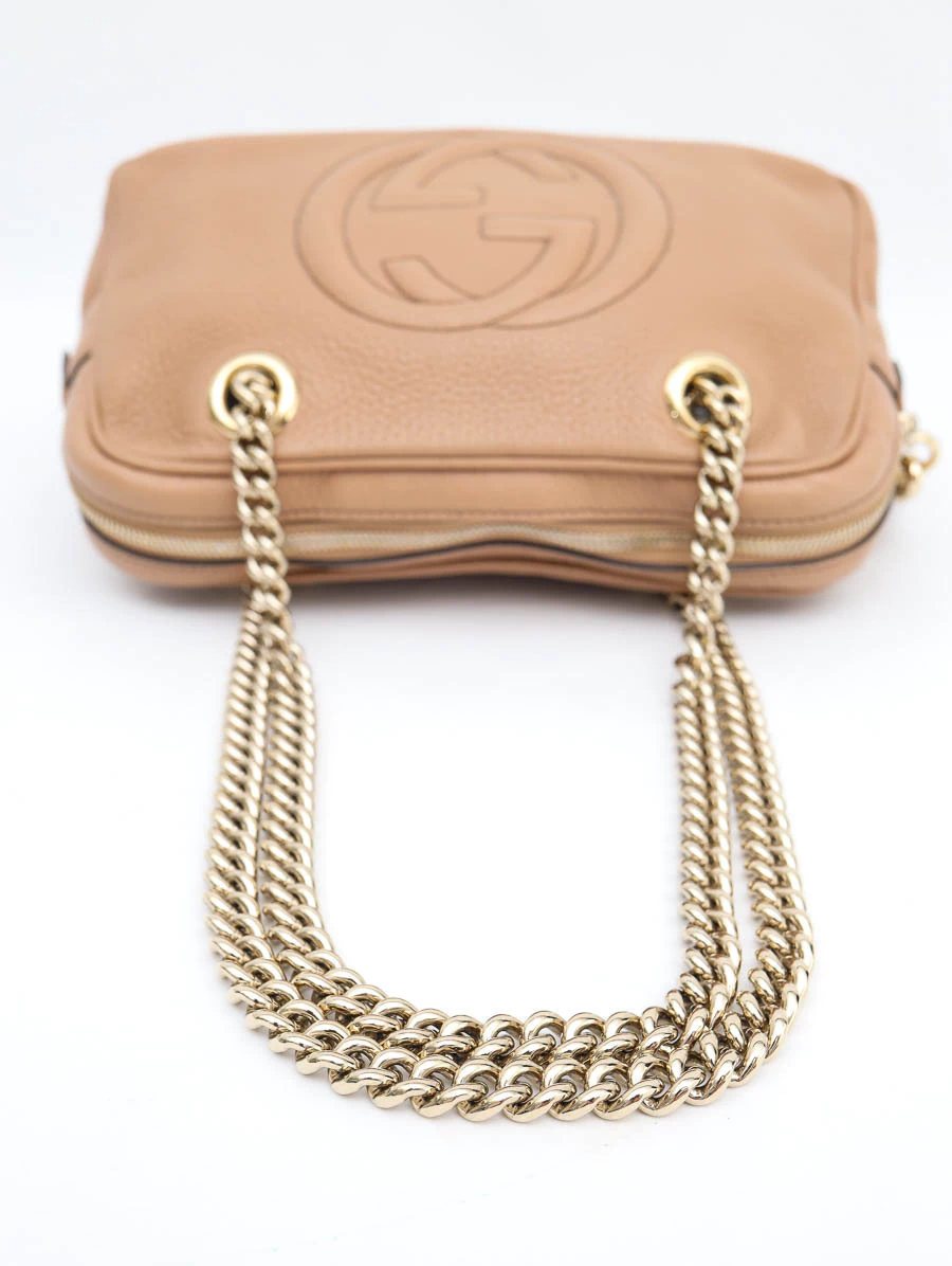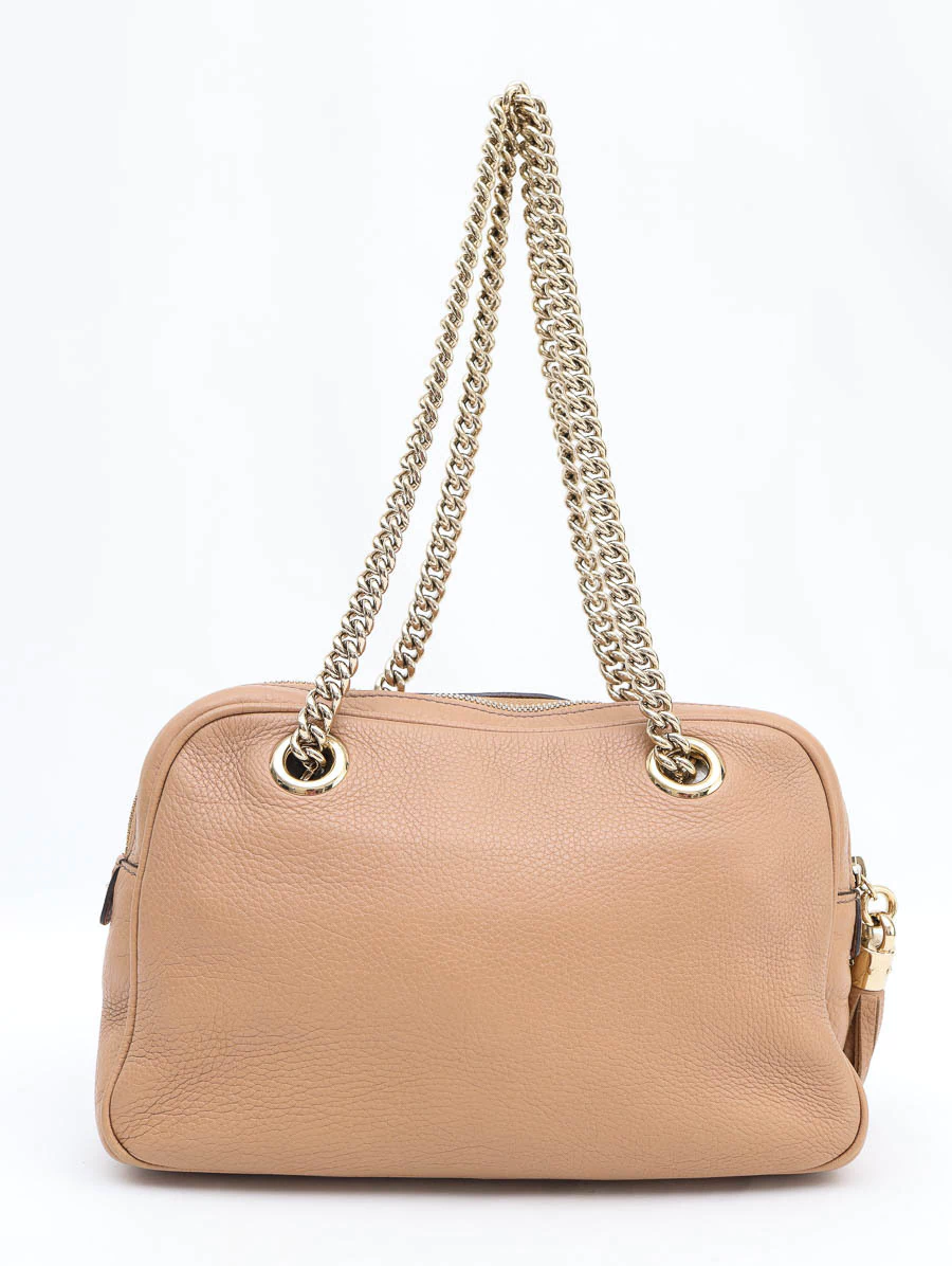 Bolsa Gucci Soho Chain Shoulder Média produzida em couro na cor bege. Apresenta alças de ombro em correntes douradas, abertura por zíper e compartimento único com três bolsos, dois bolsos abertos e um bolso com zíper.