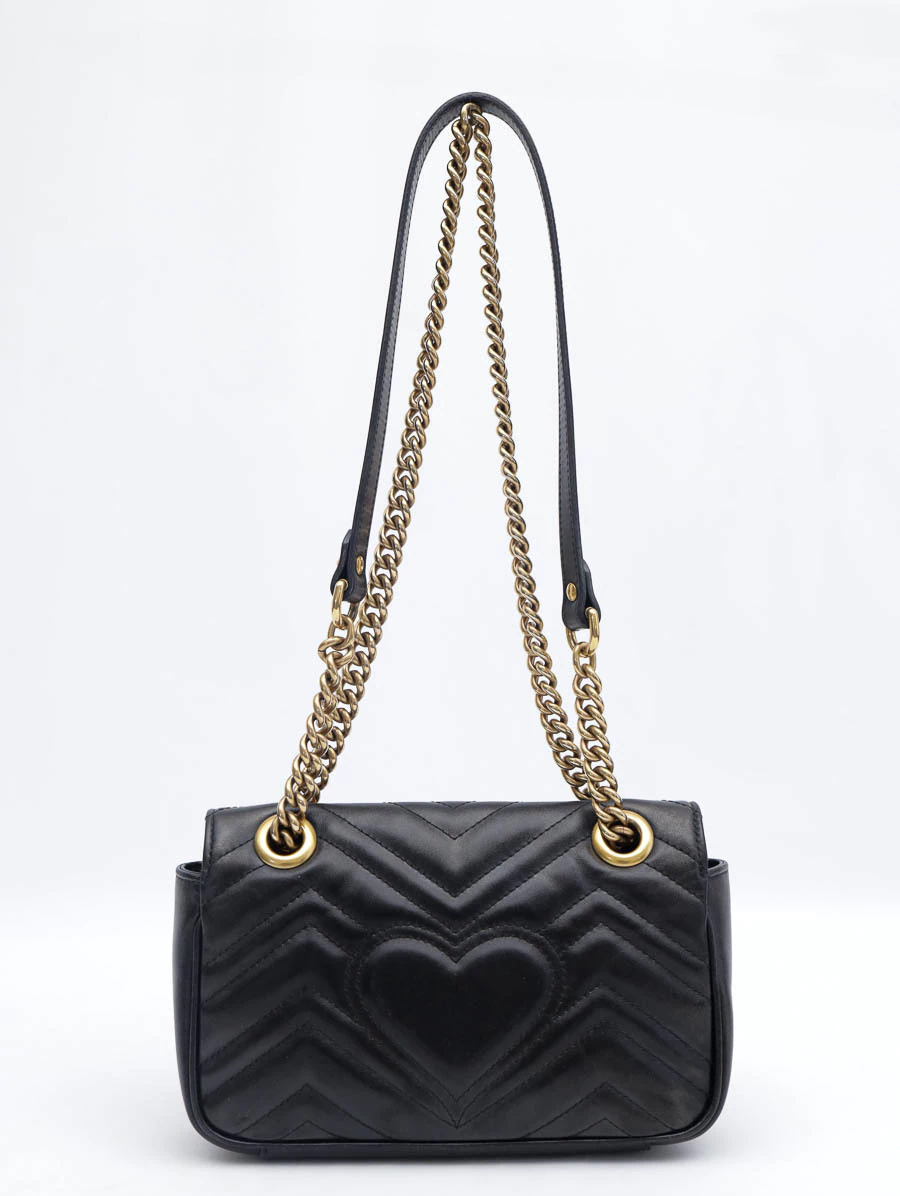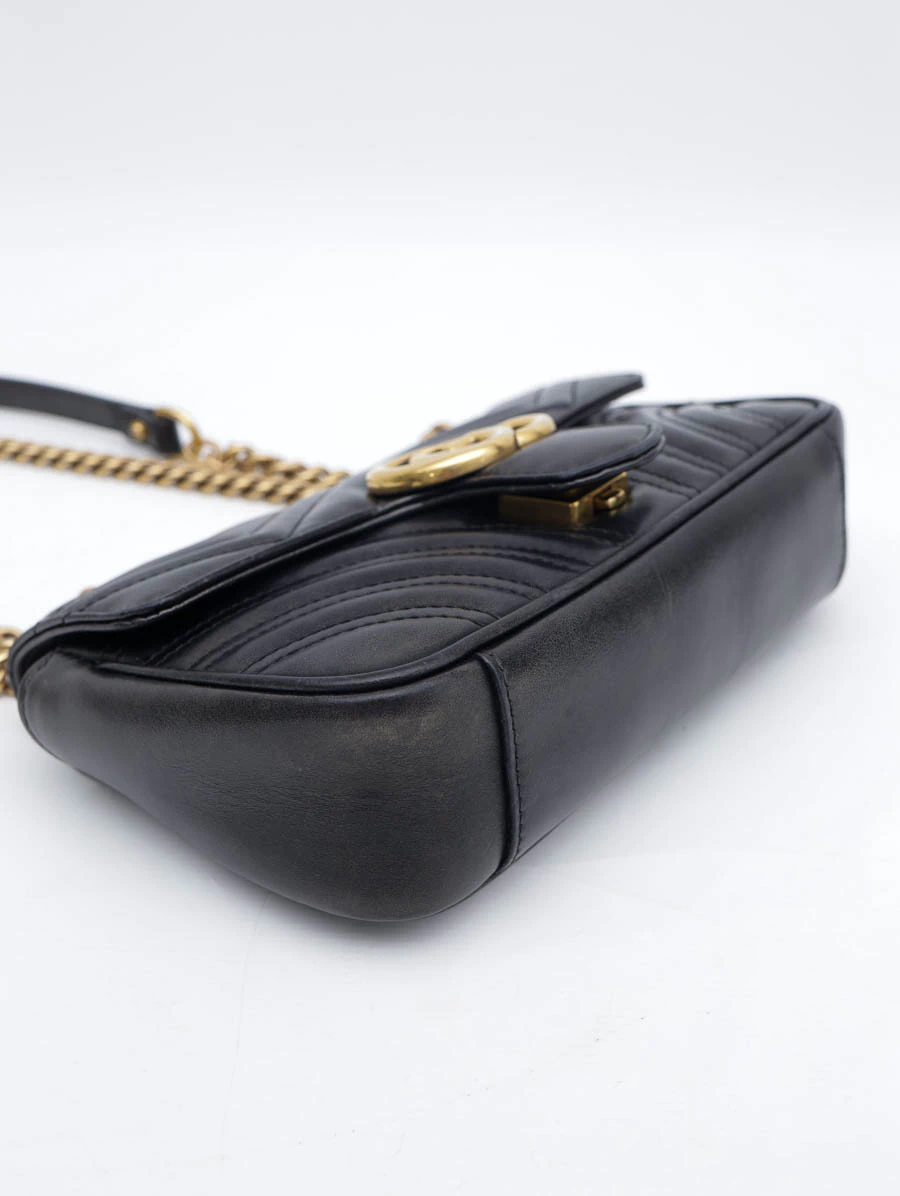 Bolsa Original Gucci GG Marmont Matelassê Miniproduzida em couro na cor preta com metais dourados. Apresenta alça longa em correntes, aba flap e compartimento único com um bolso aberto.