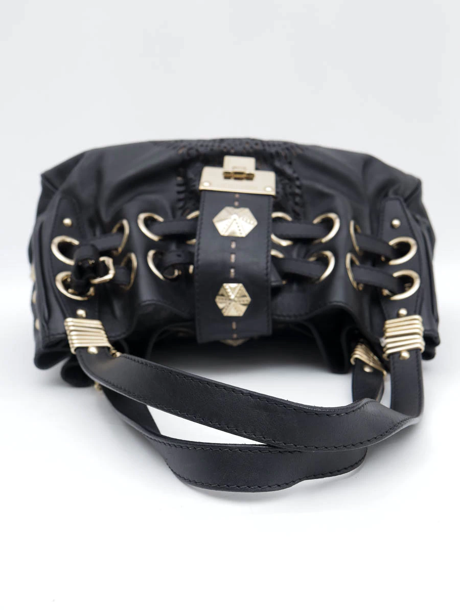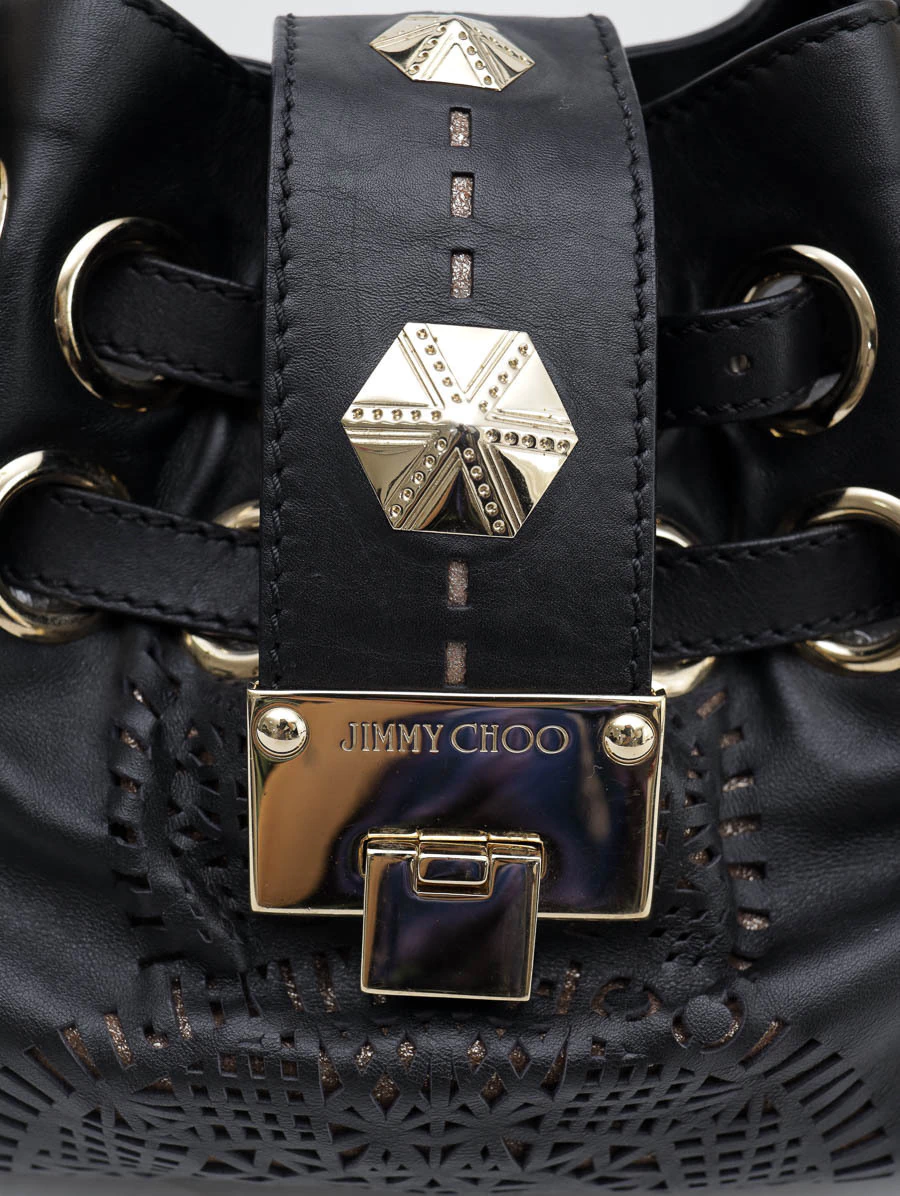 Bolsa Original Jimmy Choo Ramona Preta produzida em couro na cor preta com metais dourados. Apresenta alça de ombro, abertura por fecho de encaixe, compartimento único espaçoso com tres bolsos abertos e um bolso com zíper.
