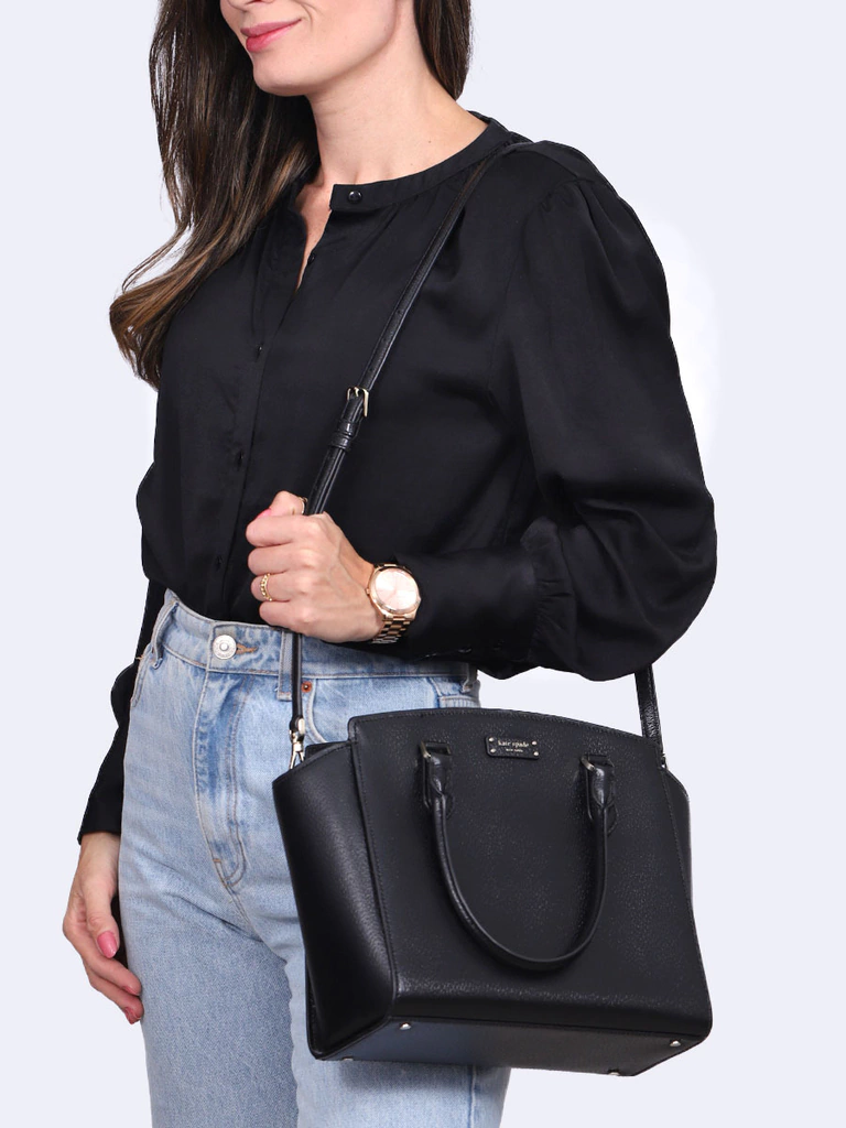 Bolsa Kate Spade Black Tote produzida em couro estruturado na cor preto, com alça longa removível com ajuste de comprimento e abertura superior com zíper. Apresenta um espaçoso interior com dois bolsos internos.