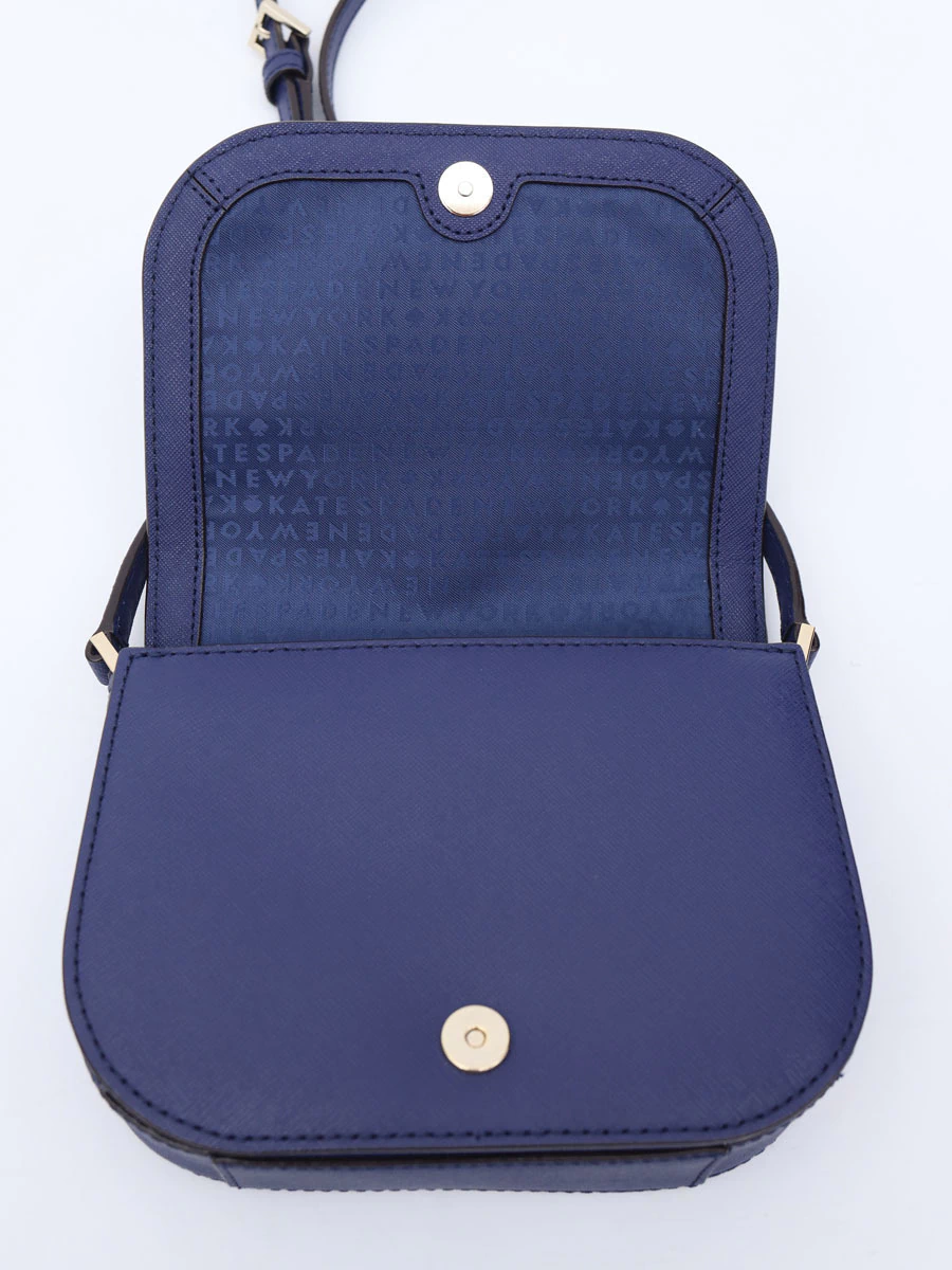 Bolsa Autêntica Kate Spade Crossbody Fringe Azul produzida em couro Saffiano na cor azul, com alça longa crossbody com ajuste de comprimento e abertura através de aba flap. Apresenta interior com capacidade para armazenar um celular plus size, documentos pessoais e cartão de crédito, chaves e um batom.
