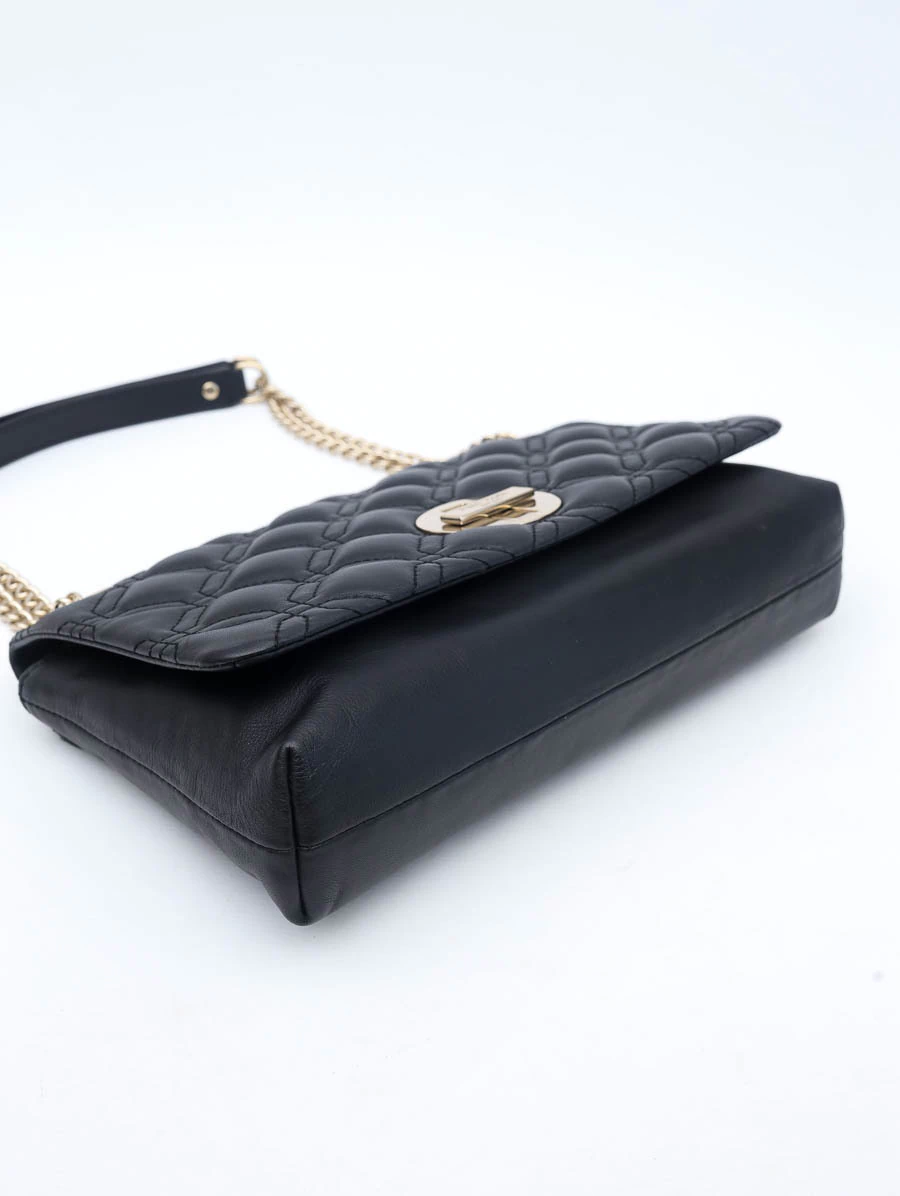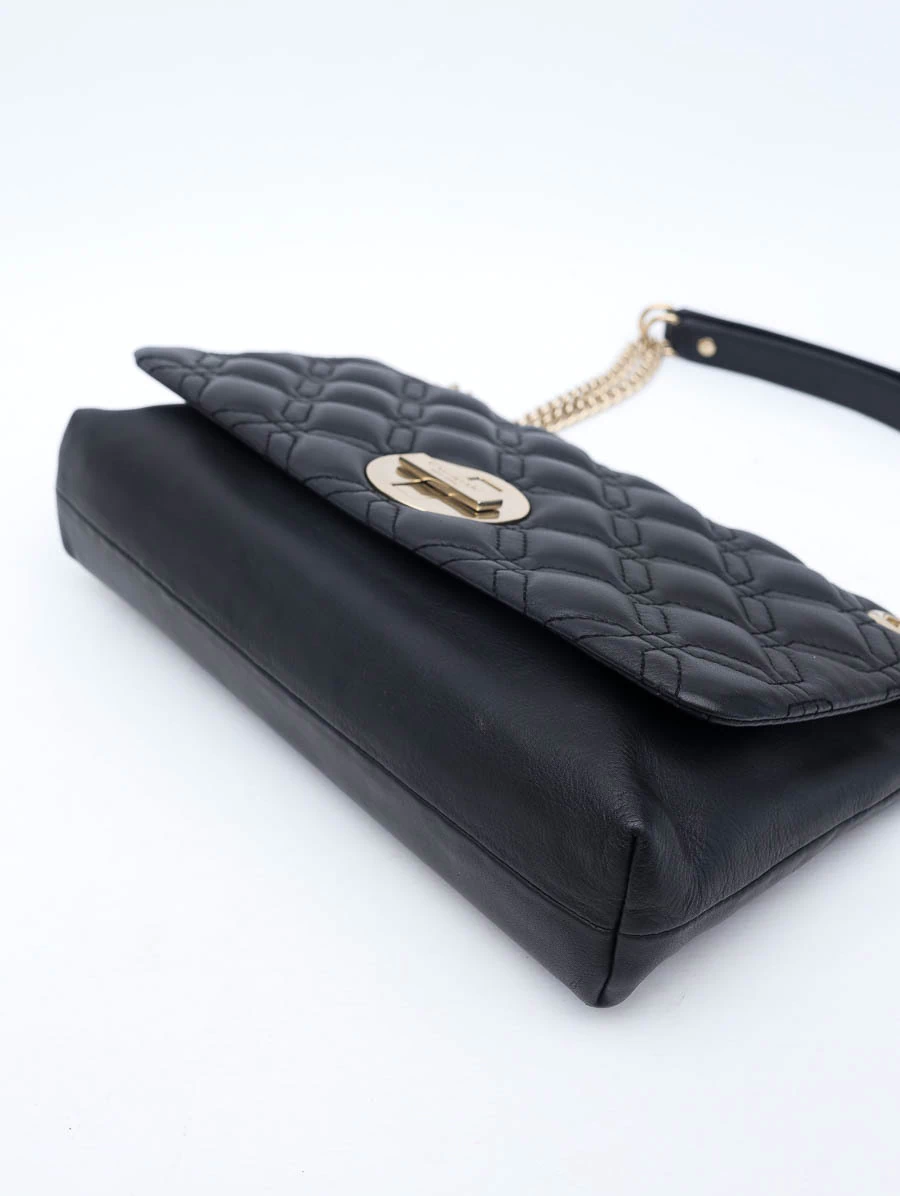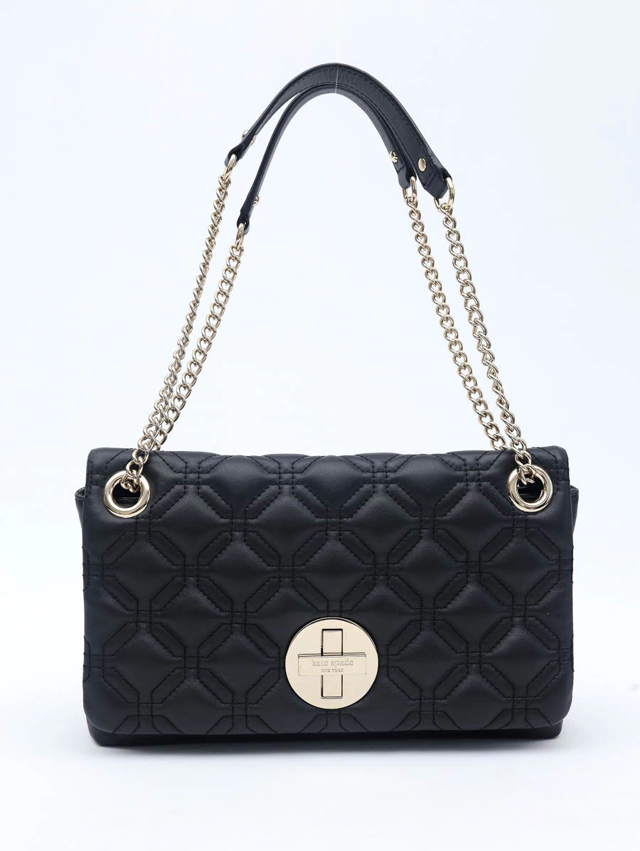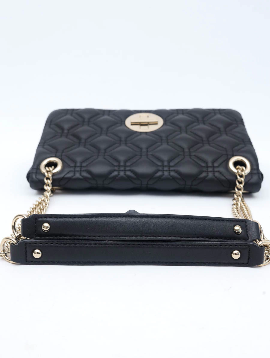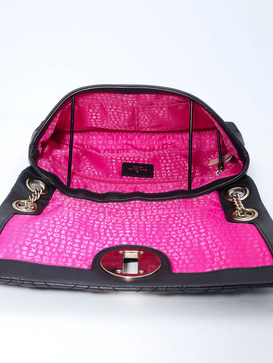 A Bolsa Original Kate Spade Cynthia é um exemplo de sofisticação e elegância. Produzida em couro preto acolchoado, apresenta um trabalho em pespontos geométricos que destaca seu design único e moderno. Os metais dourados adicionam um toque de luxo, complementado pelo fecho giratório e aba flap. Com tamanho médio, a bolsa oferece versatilidade com alças ajustáveis, permitindo seu uso como alça longa ou mais curta. O interior em nylon pink é vibrante e funcional, oferecendo três bolsos para organização prática.