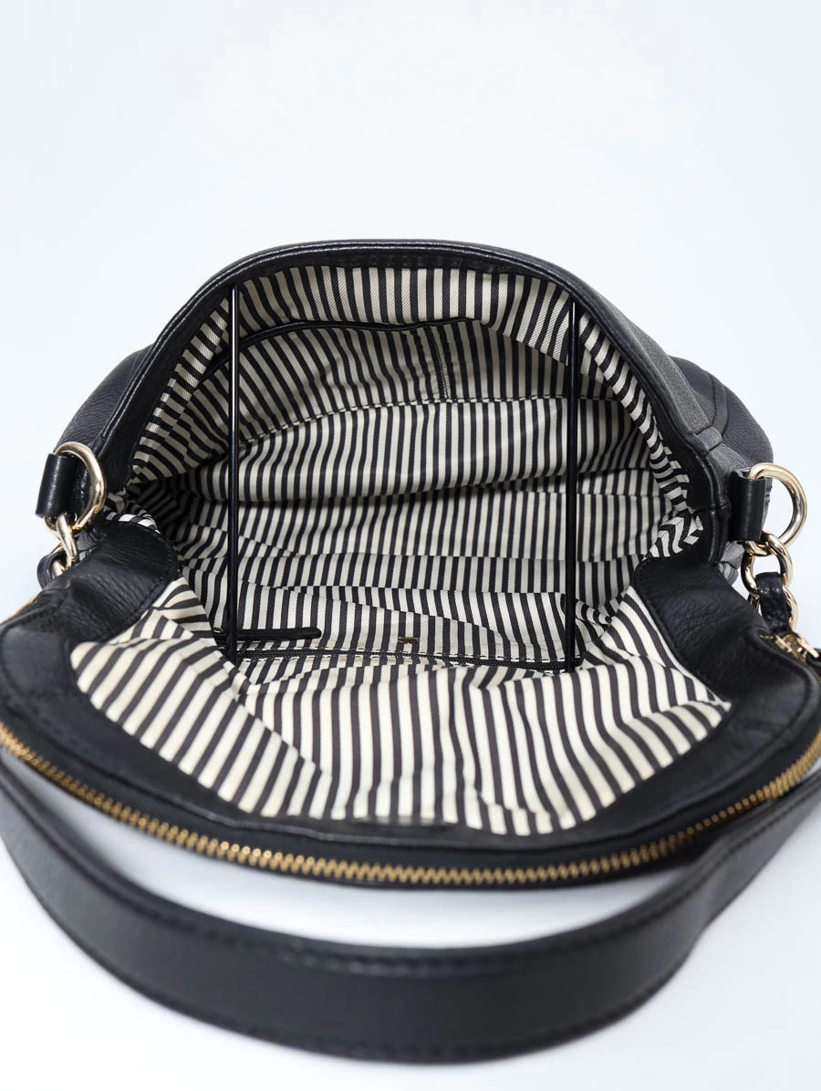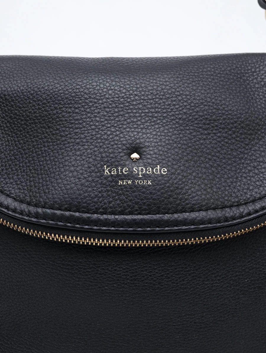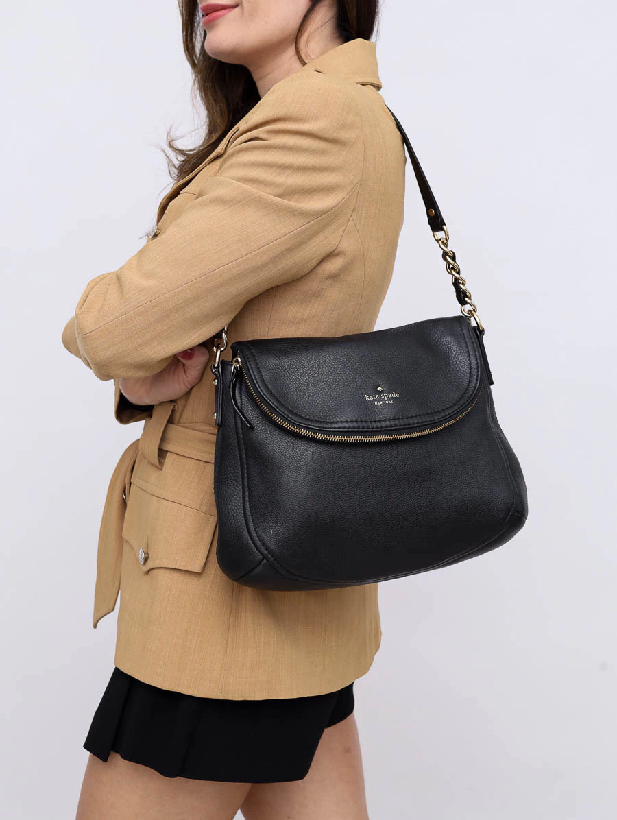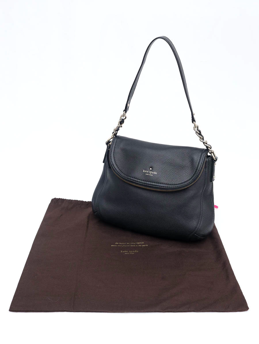 Bolsa Seminova Original Kate Spade Penny produzida em couro texturizado na cor preta e ferragens douradas. Apresenta alças de ombro com detalhes em corrente, dois compartimentos sendo um com abertura por fecho magnético e o outro por zíper, interior em tecido estampado e três bolsos sendo um com zíper.