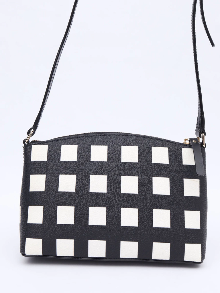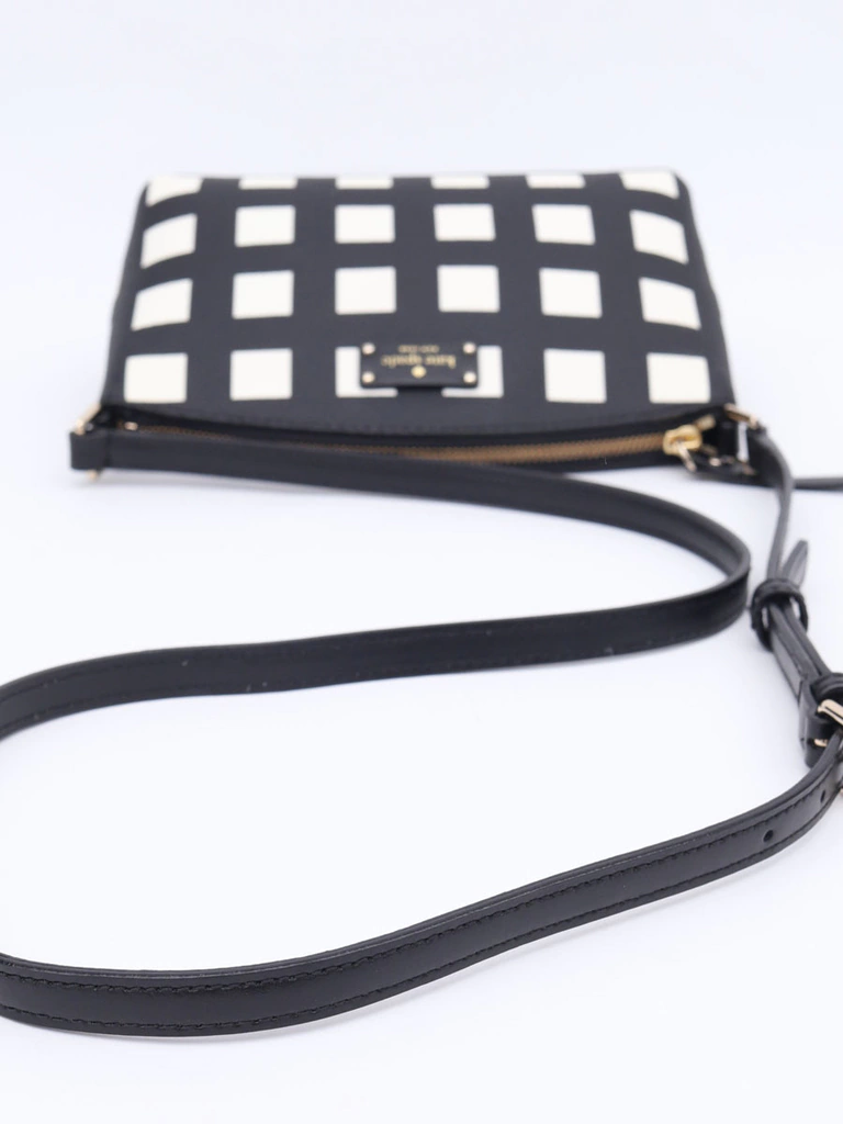 Bolsa Autêntica Kate Spade Preta e Branca Crossbody produzida em material canvas de alta durabilidade com estampa quadriculada preta e branca e metais prata com brilho. Apresenta alça longa em couro com ajuste de comprimento, base em couro, abertura superior com zíper com puxador em couro e interior em nylon com um bolso com capacidade para armazenar um celular tamanho plus size, uma carteira, chaves e pequena maquiagem.