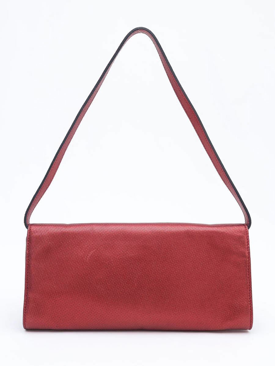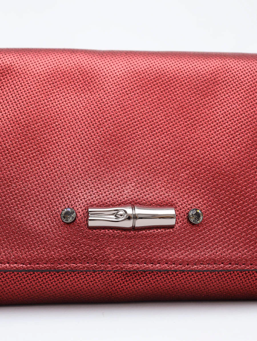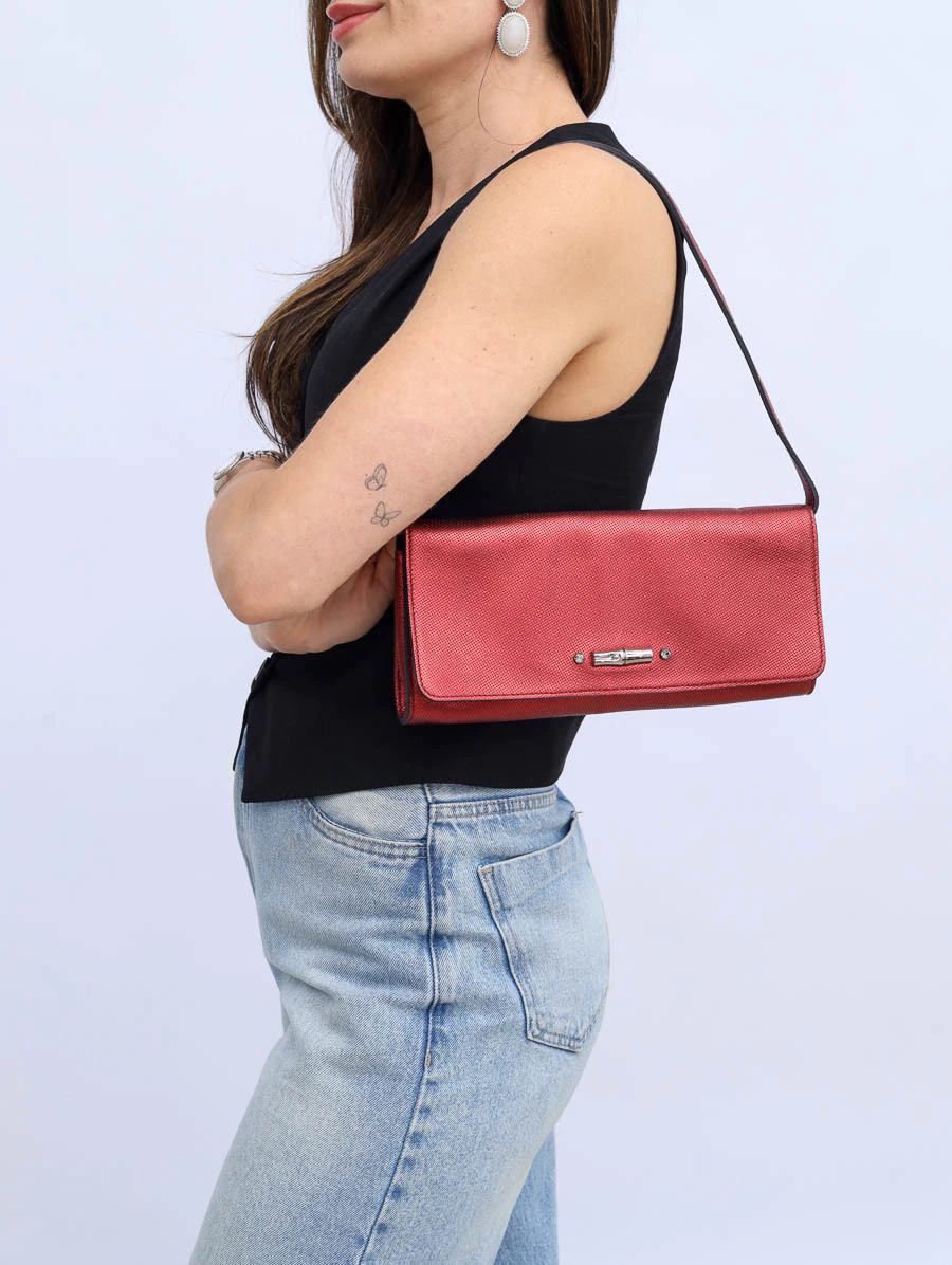 Bolsa Longchamp Le Roseau Flap produzida em couro metalizdo na cor vermelha e ferragens prateadas. Apresenta alça de ombro única, abertura frontal por fecho magnético e compartimento único com bolso com fechamento por zíper.