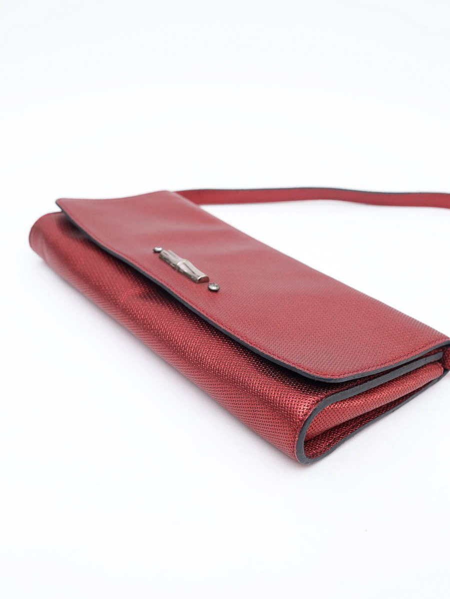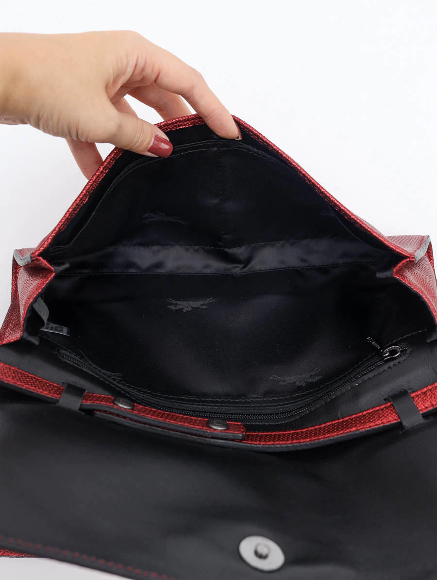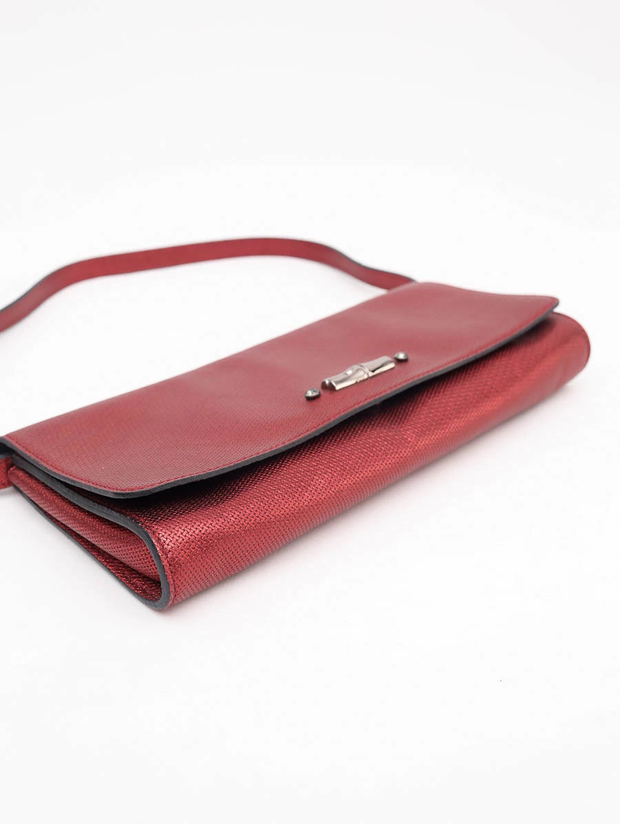 Bolsa Longchamp Le Roseau Flap produzida em couro metalizdo na cor vermelha e ferragens prateadas. Apresenta alça de ombro única, abertura frontal por fecho magnético e compartimento único com bolso com fechamento por zíper.