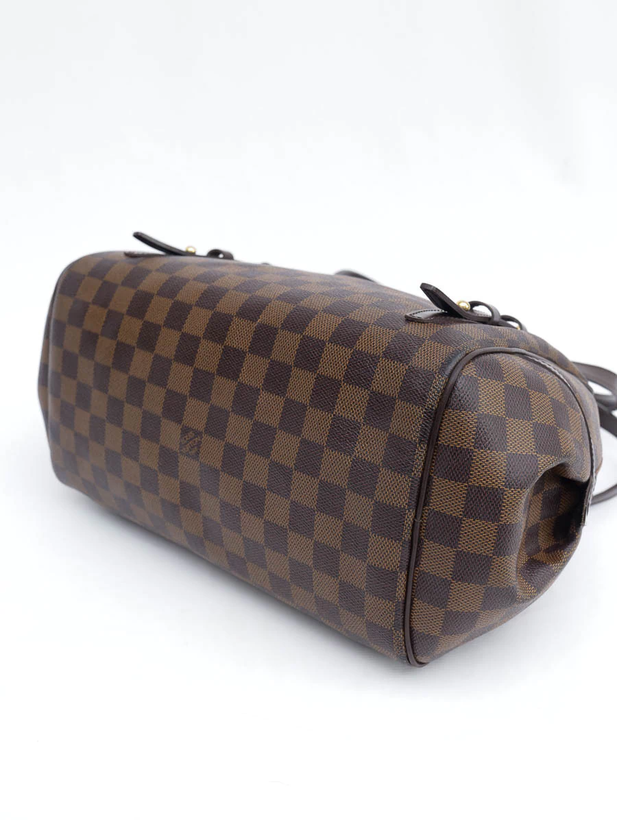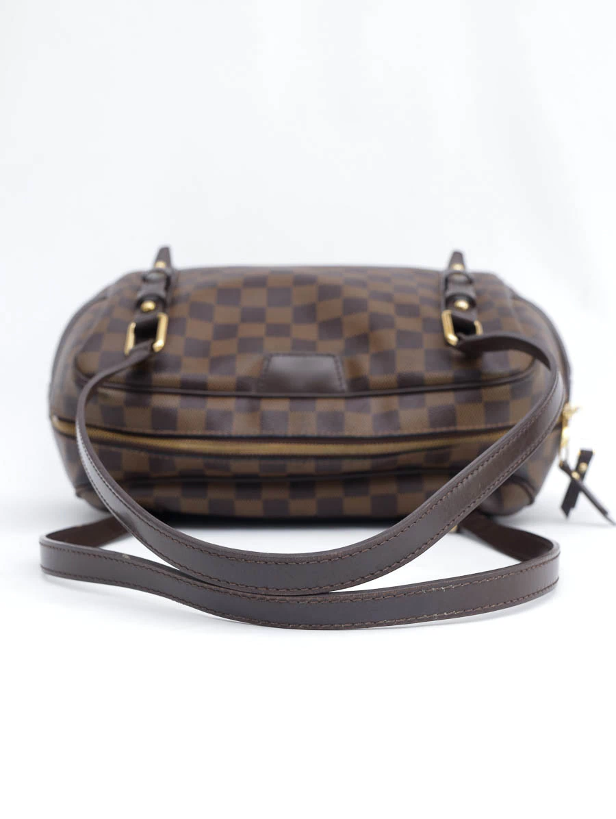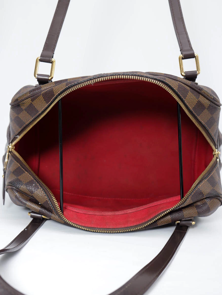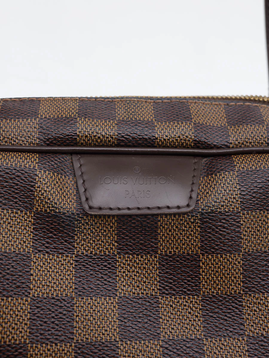 Bolsa Original Louis Vuitton produzida em canvas na estampa Damier Ébene e detalhes em couro marrom. Apresenta alças de ombro, abertura por zíper e compartimento único com um bolso interno aberto.