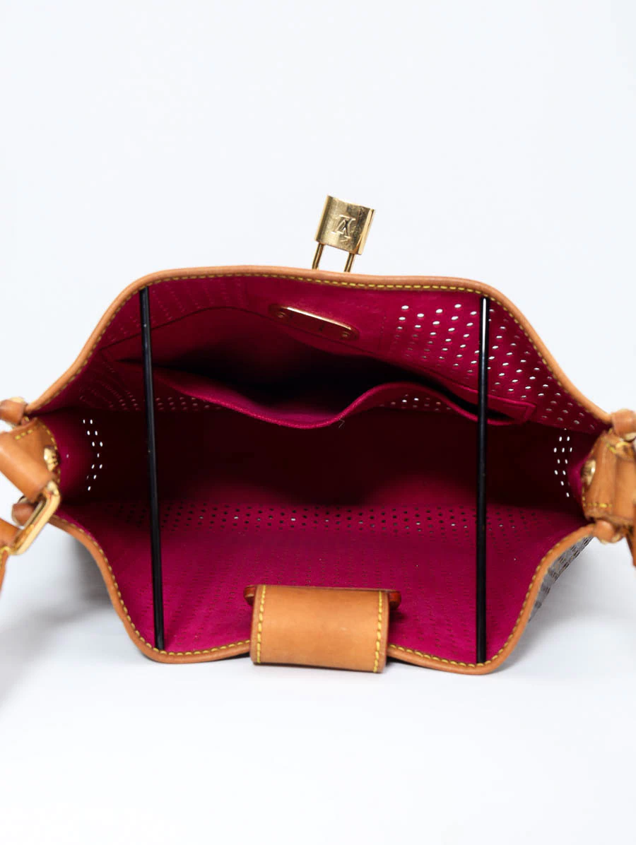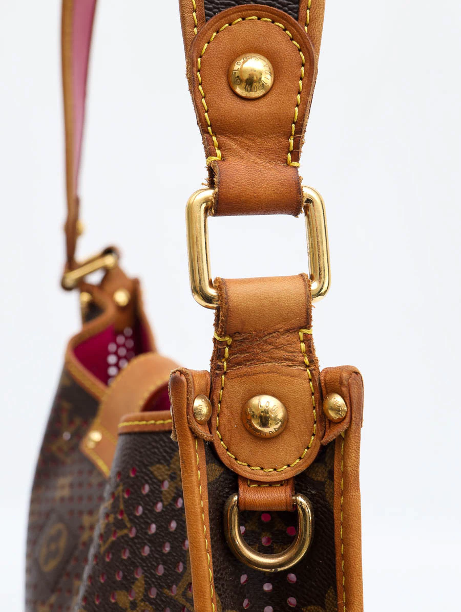 Bolsa Original Louis Vuitton Musette Perforated produzida em canvas monograma com detalhes em couro marrom e rosa. Apresenta alça longa, abertura por fecho de encaixe e compartimento único com um bolso aberto e um bolso na parte externa.