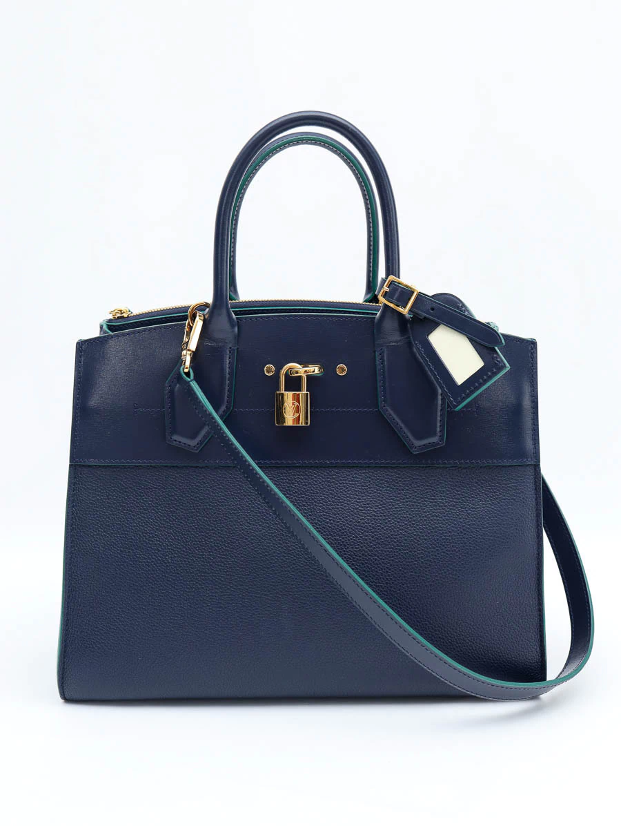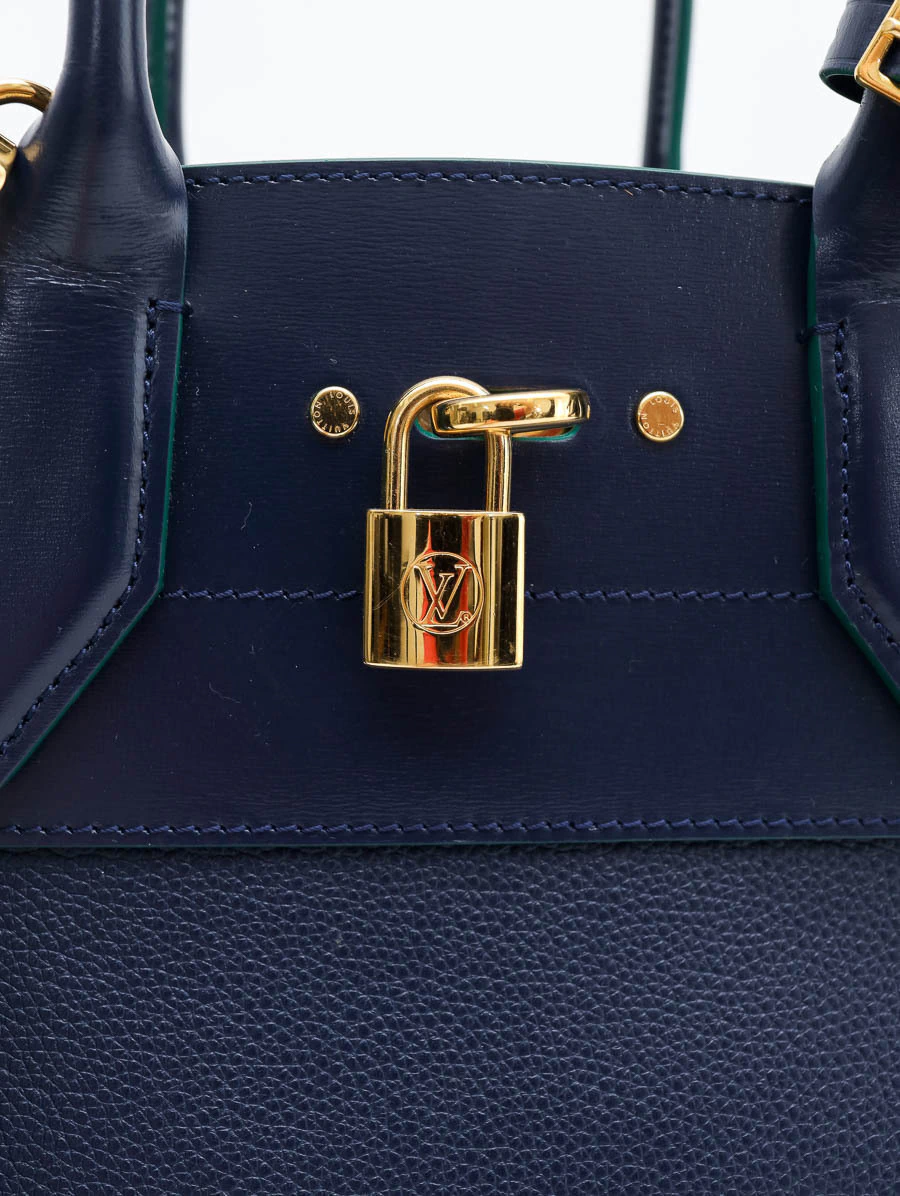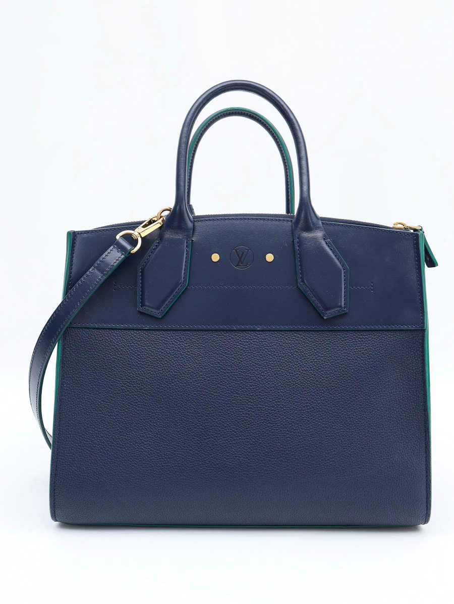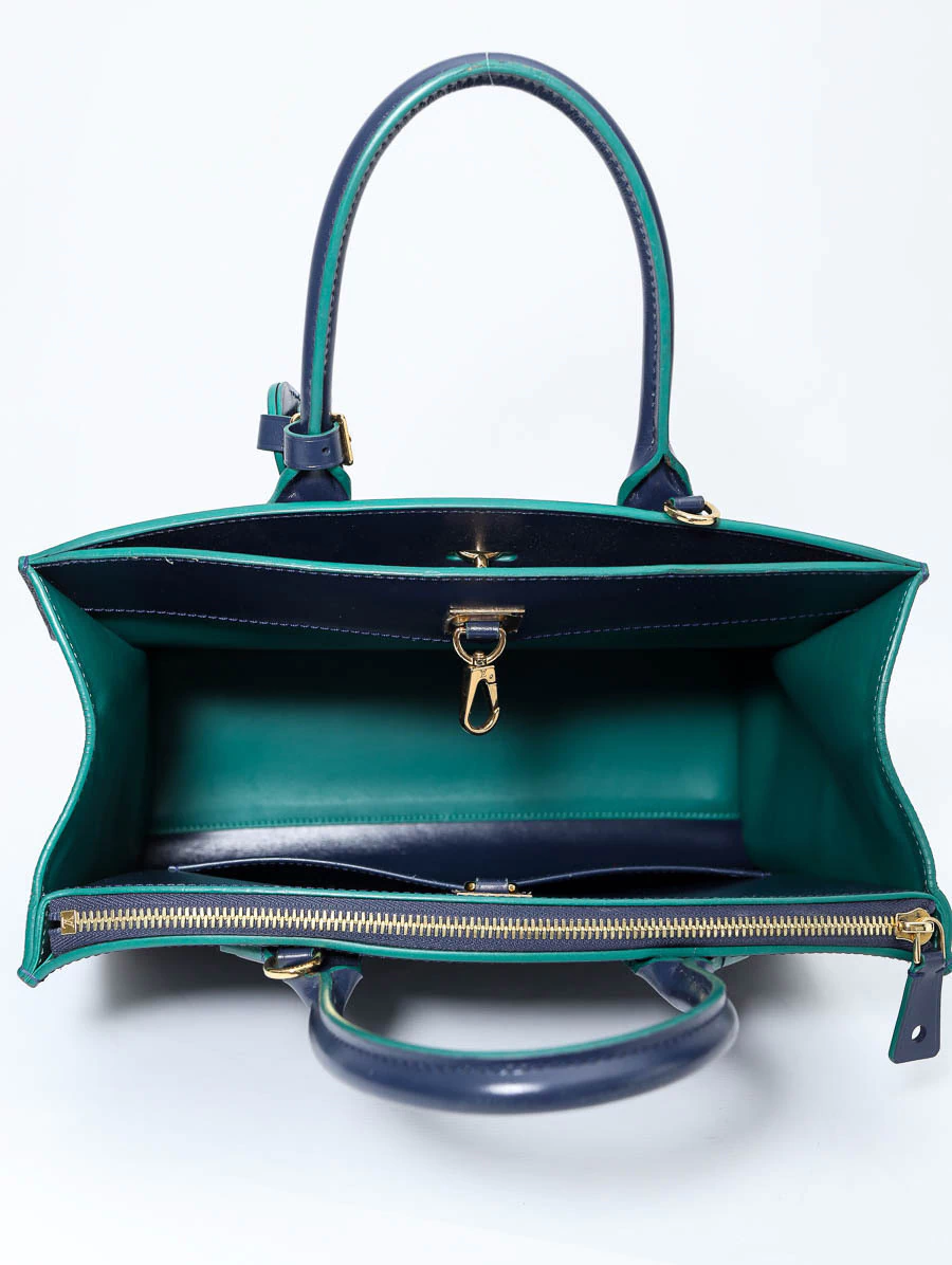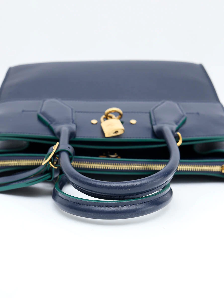 Bolsa Original Louis Vuitton Steamer MMproduzida em couro na cor azul marinho e detalhes na cor verde. Apresenta compartimento único, abertura por fecho de encaixe, dois bolsos pequenos na parte interna e dois bolsos grandes, sendo um bolso com zíper e um bolso aberto com fecho por cadeado.