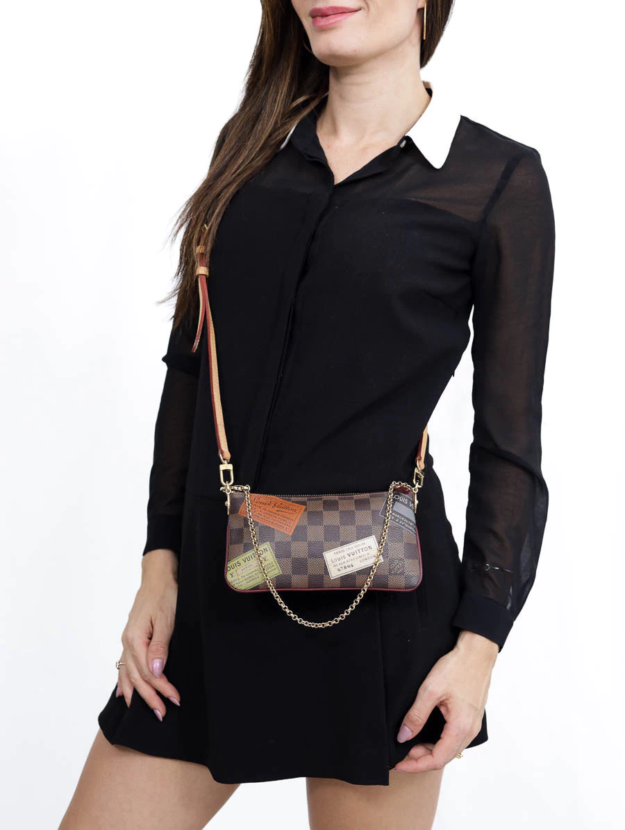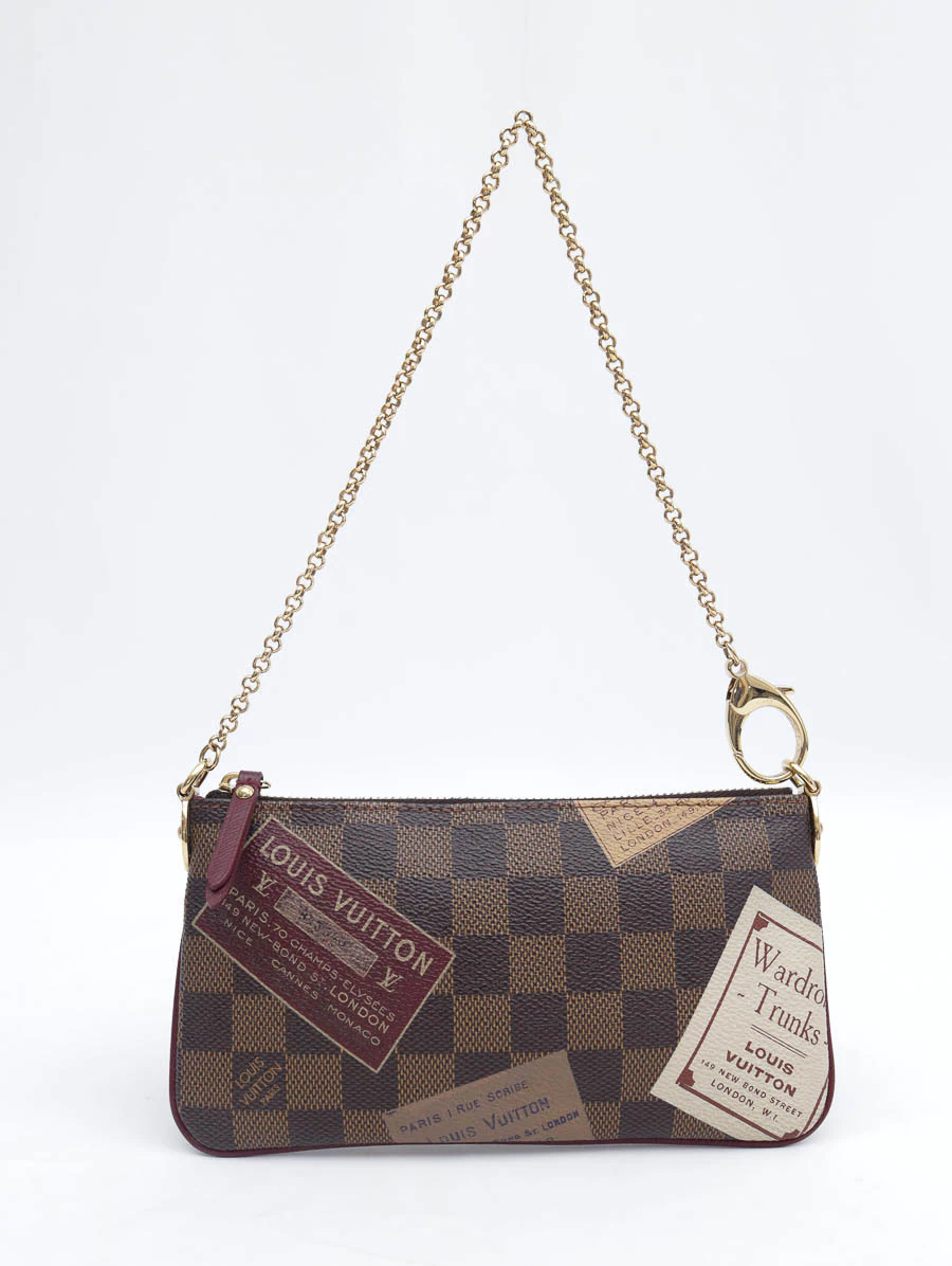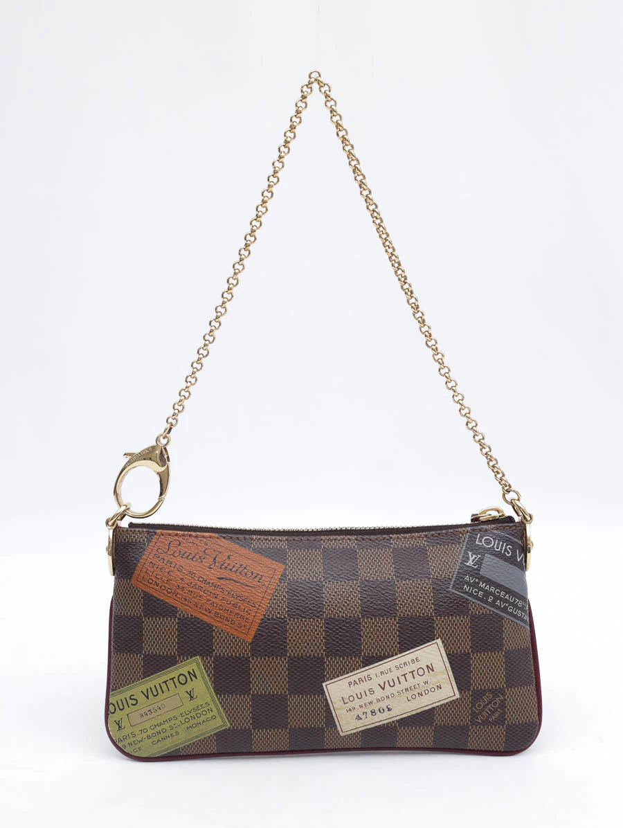 Pochette Original Louis Vuitton Milla MM Biscuit produzida em canvas com estampa damier ébene. Apresenta uma alça curta em corrente removível por mosquetão dourado em um dos lados e uma alça longa em couro, detalhe em estampa de placas escritas em tons de vinho, cinza, bege, marrom e verde. couro na cor rosa com metais dourados. Possui fechamento por zíper e compartimento único com um bolso aberto.