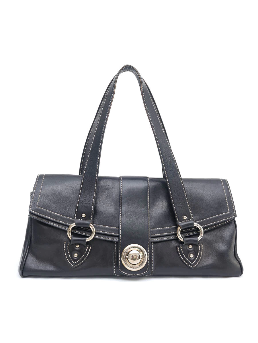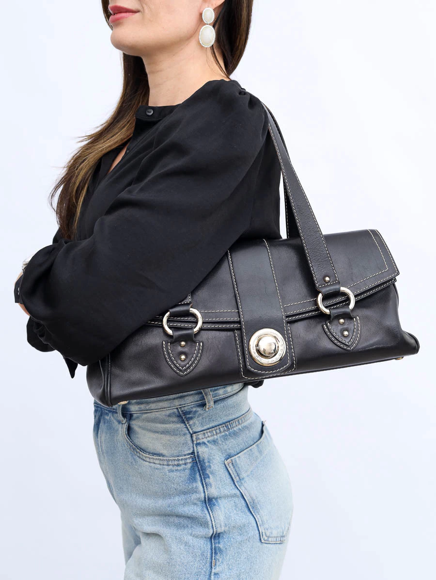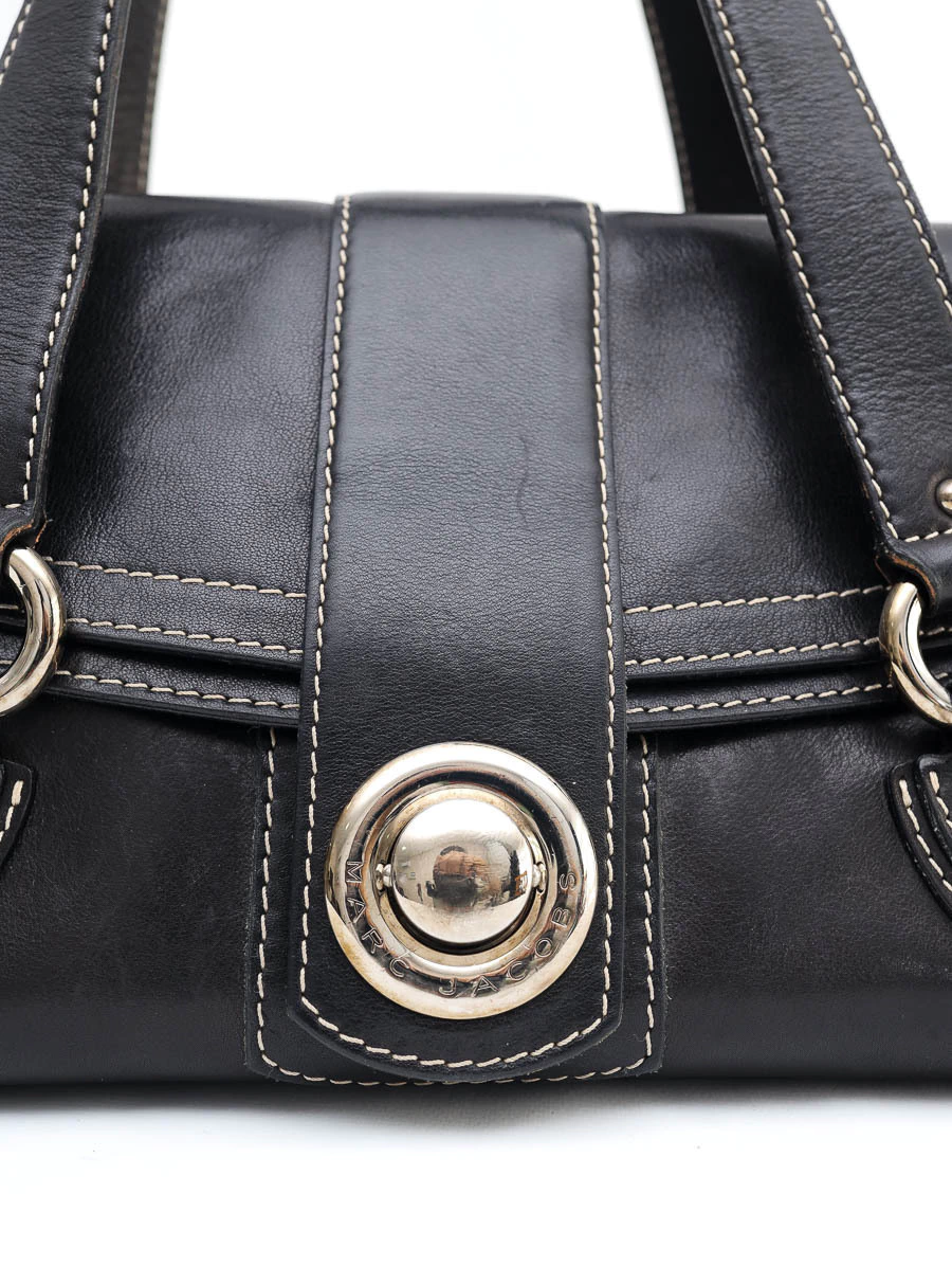 A Bolsa Marc Jacobs é uma peça que une elegância clássica com um toque contemporâneo, perfeita para compor looks sofisticados no dia a dia. Confeccionada em couro preto macio, ela se destaca pelos pespontos brancos contrastantes e pelos detalhes em metais prateados, incluindo fivelas e fecho giratório frontal. O design e as alças médias oferecem praticidade e conforto no uso, além de um visual refinado e atemporal. Internamente, a peça conta com bom espaço para organização dos itens essenciais, ideal para acompanhar a rotina com estilo.