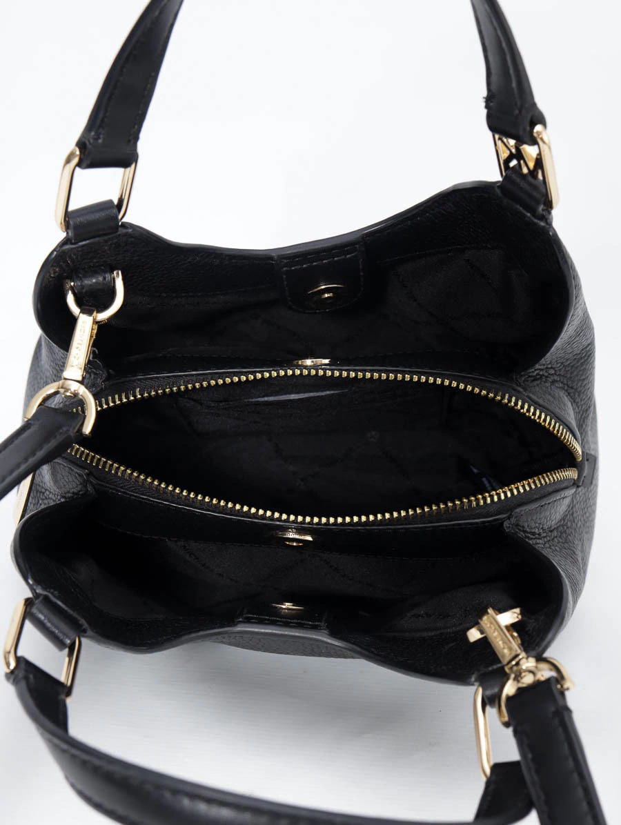 Bolsa Seminova Original Michael Kors Arlo Preta é uma linda opção de bolsa pequena e muito charmosa. Produzida em couro granulada e ferragens douradas, apresenta alça longa removível com ajustes de comprimento, interior com três compartimentos, sendo dois deles com fechamento magnético e um central com zíper.