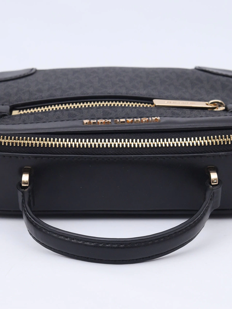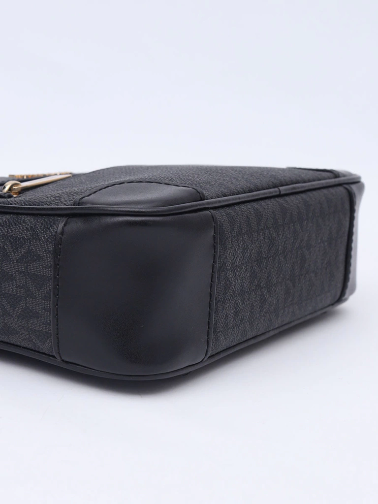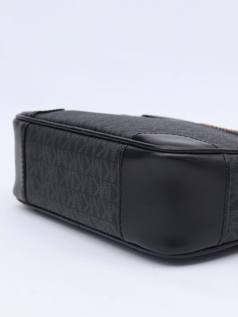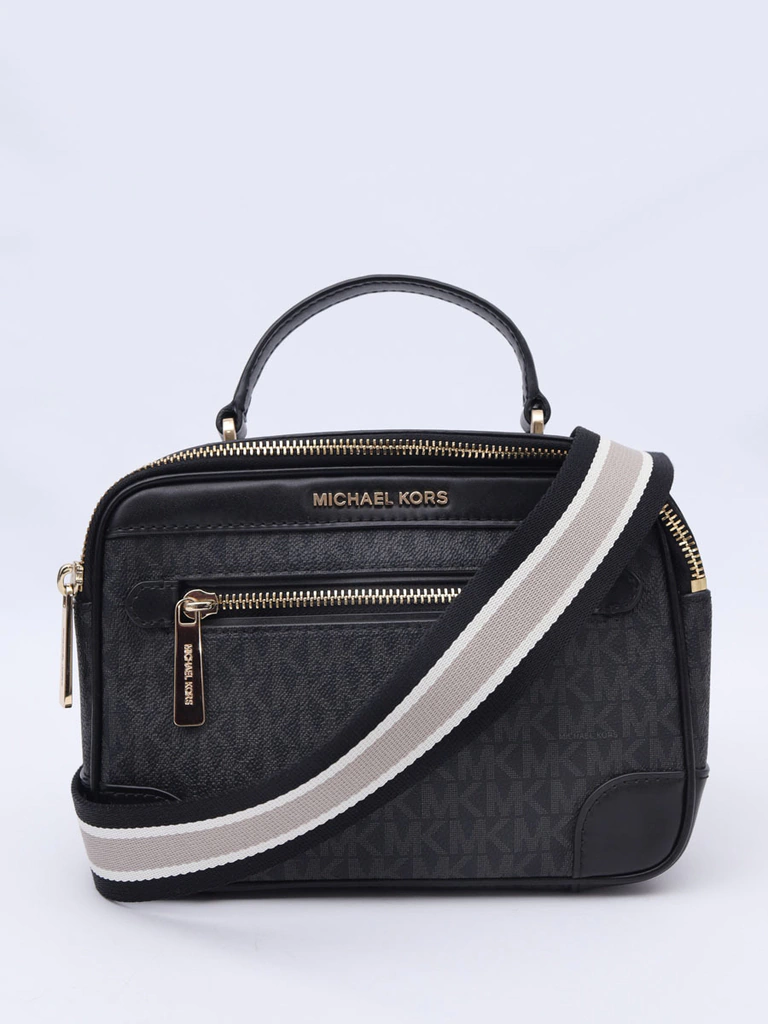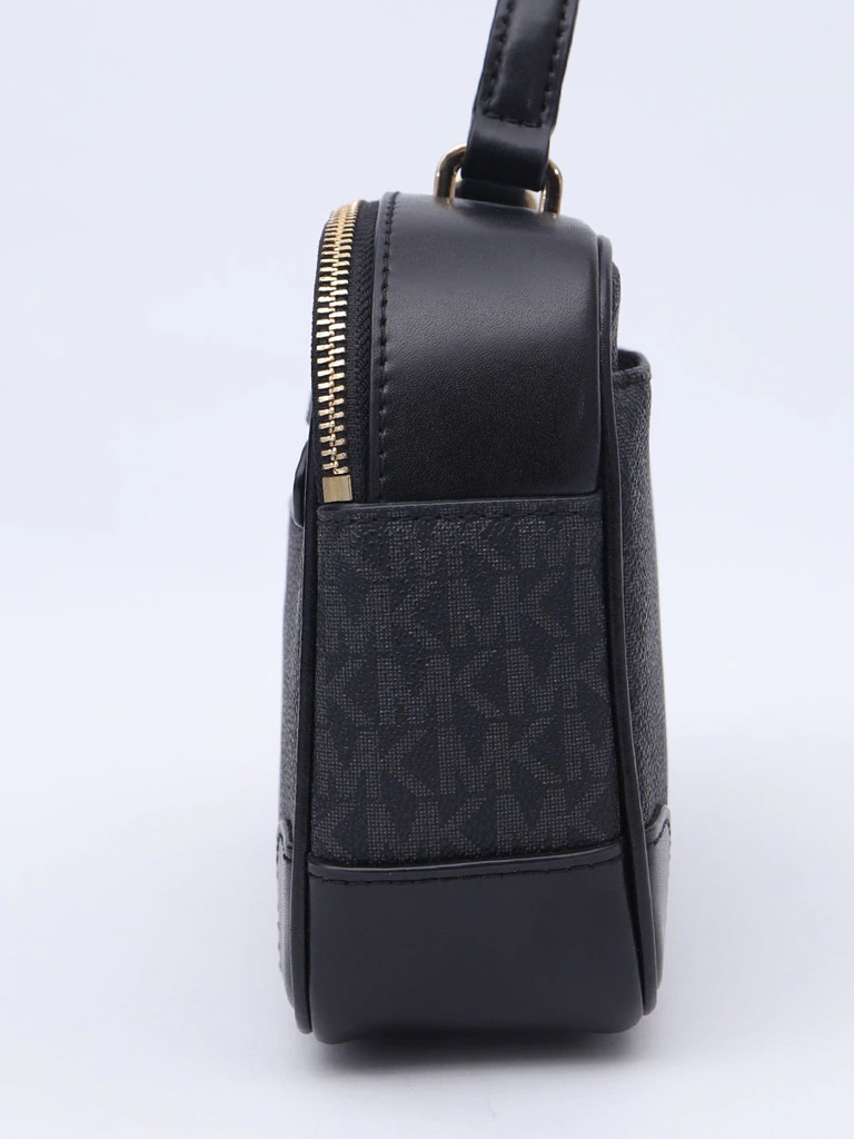 Bolsa Autêntica Michael Kors Camera Bag Bandoleira produzida em canvas sintético com estampa clássica MK e detalhes em couro liso preto. Apresenta alça longa removível com ajuste de comprimento nas cores cinza, branco e preto, uma pequena alça de mão, um bolso frontal, um bolso na parte de trás e interior em nylon com dois bolsos.