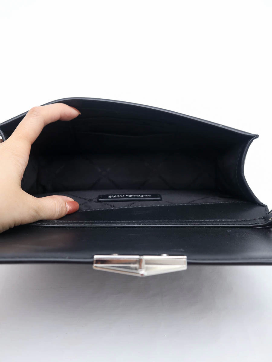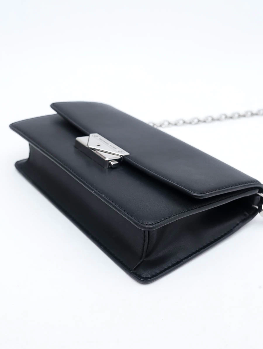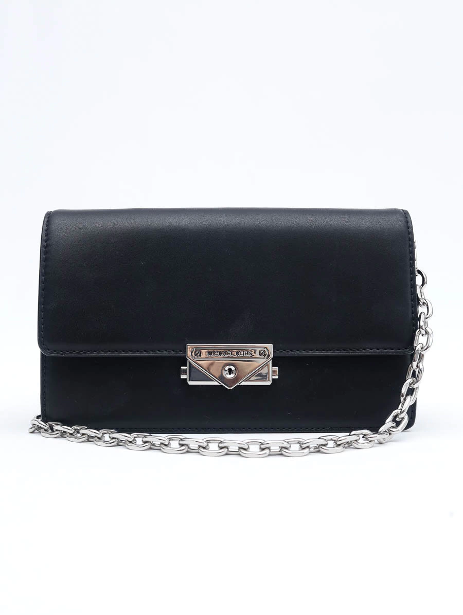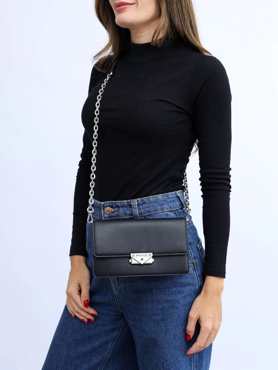 A Bolsa Michael Kors Cece é a personificação da elegância moderna. Feita em couro preto de alta qualidade, destaca-se pelo design estruturado e minimalista, com fechamento frontal adornado por uma charmosa placa metálica prateada gravada com o logo da marca.