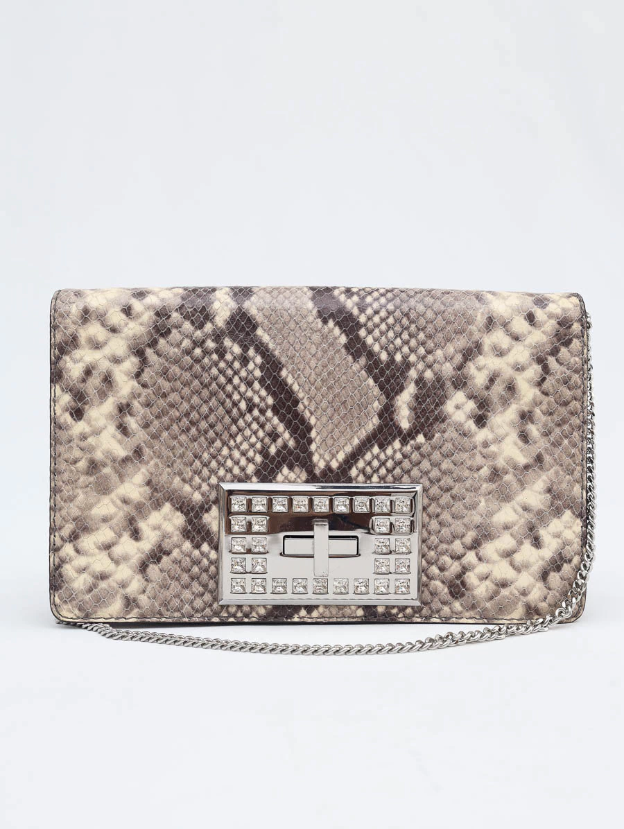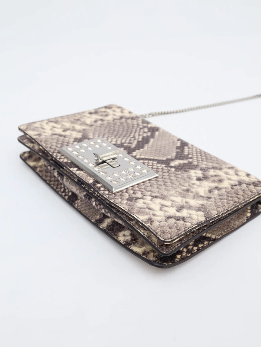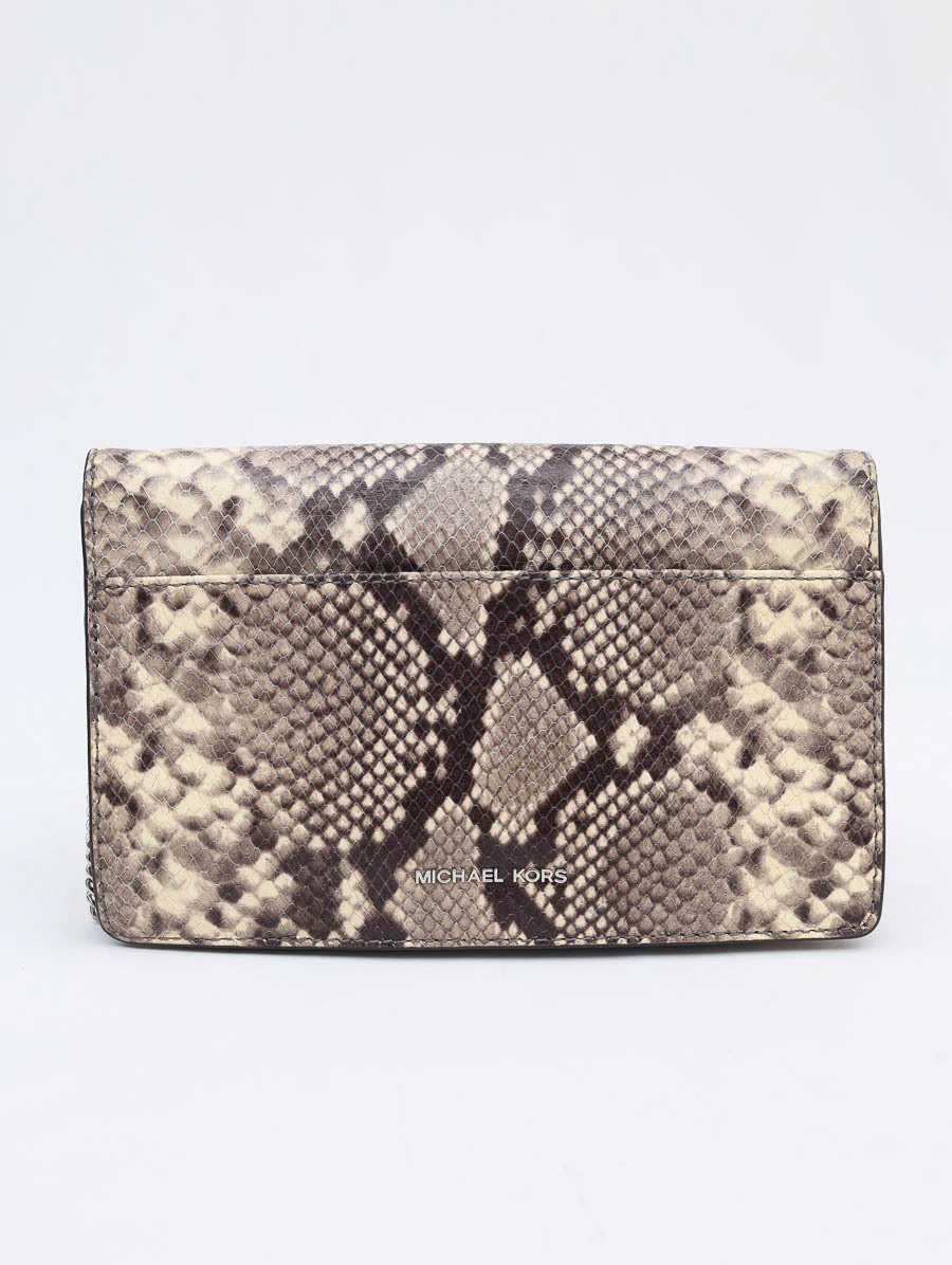 Bolsa Michael Kors Ellie feita em couro com estampa de píton e detalhes em metais prateados e brilhantes com fechamento frontal. Possui compartimento interno único com bolso com fechamento por zíper e seis slots para cartão, além de uma alça em corrente.