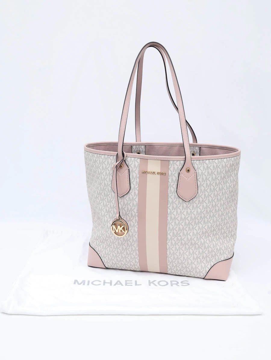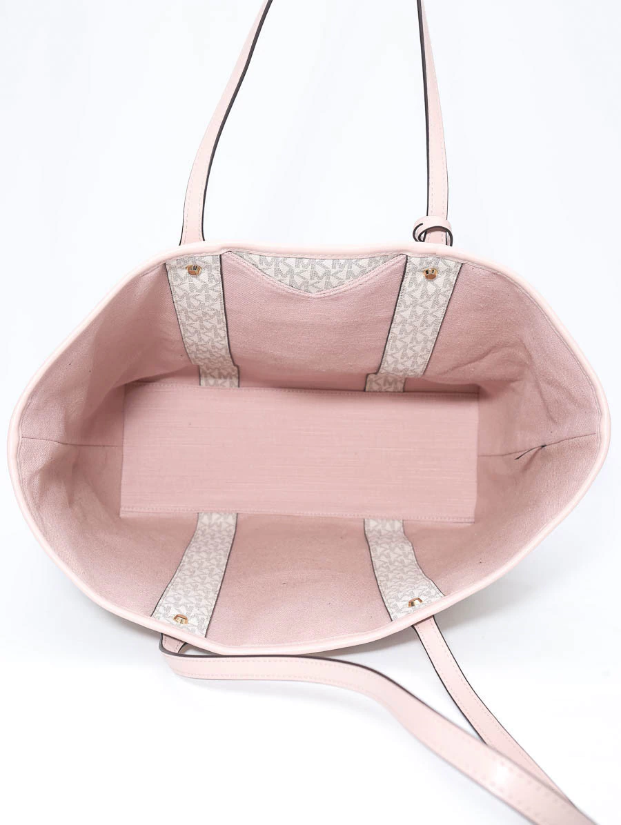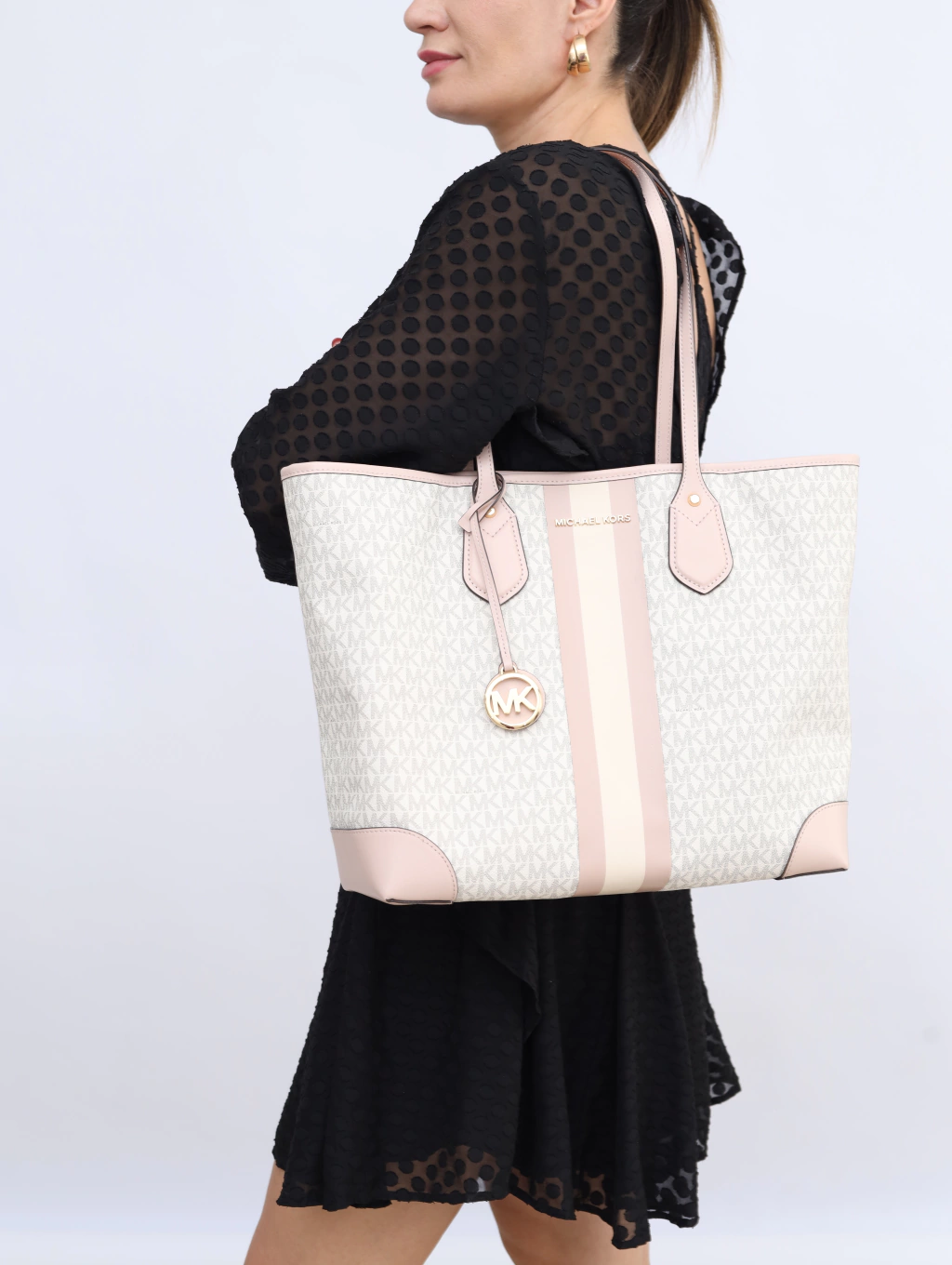 Bolsa Seminova Original Michael Kors Eva Tote é a definição de sofisticação e estilo. Produzida em canvas de alta qualidade, esta peça encantadora apresenta detalhes em couro cor de rosa e metais dourados que a tornam única. Com uma faixa central em rosa e branca, suas alças de ombro oferecem conforto e praticidade para o dia a dia. O design elegante é complementado por bordas em rosa claro, um delicado pingente e o logotipo da marca em dourado, garantindo que você se destaque em qualquer ocasião. O interior conta com um compartimento único, ideal para organizar seus pertences com facilidade.