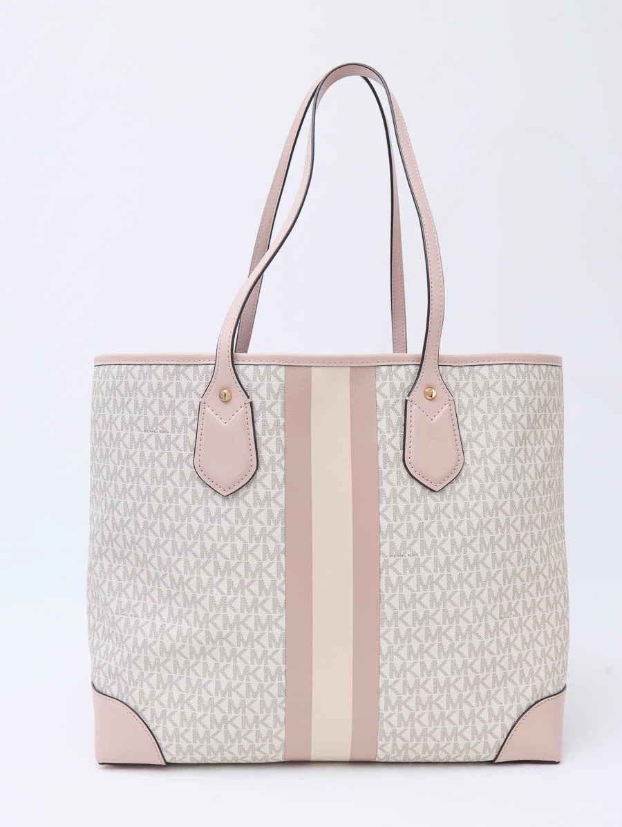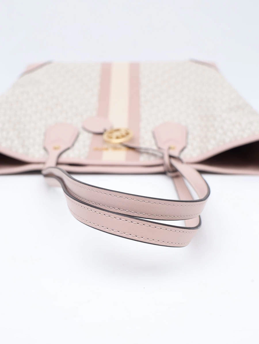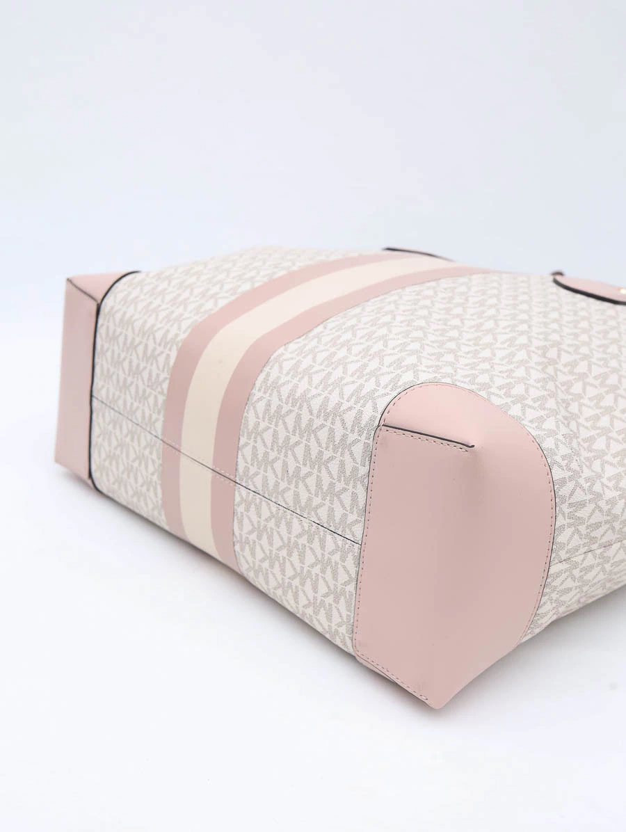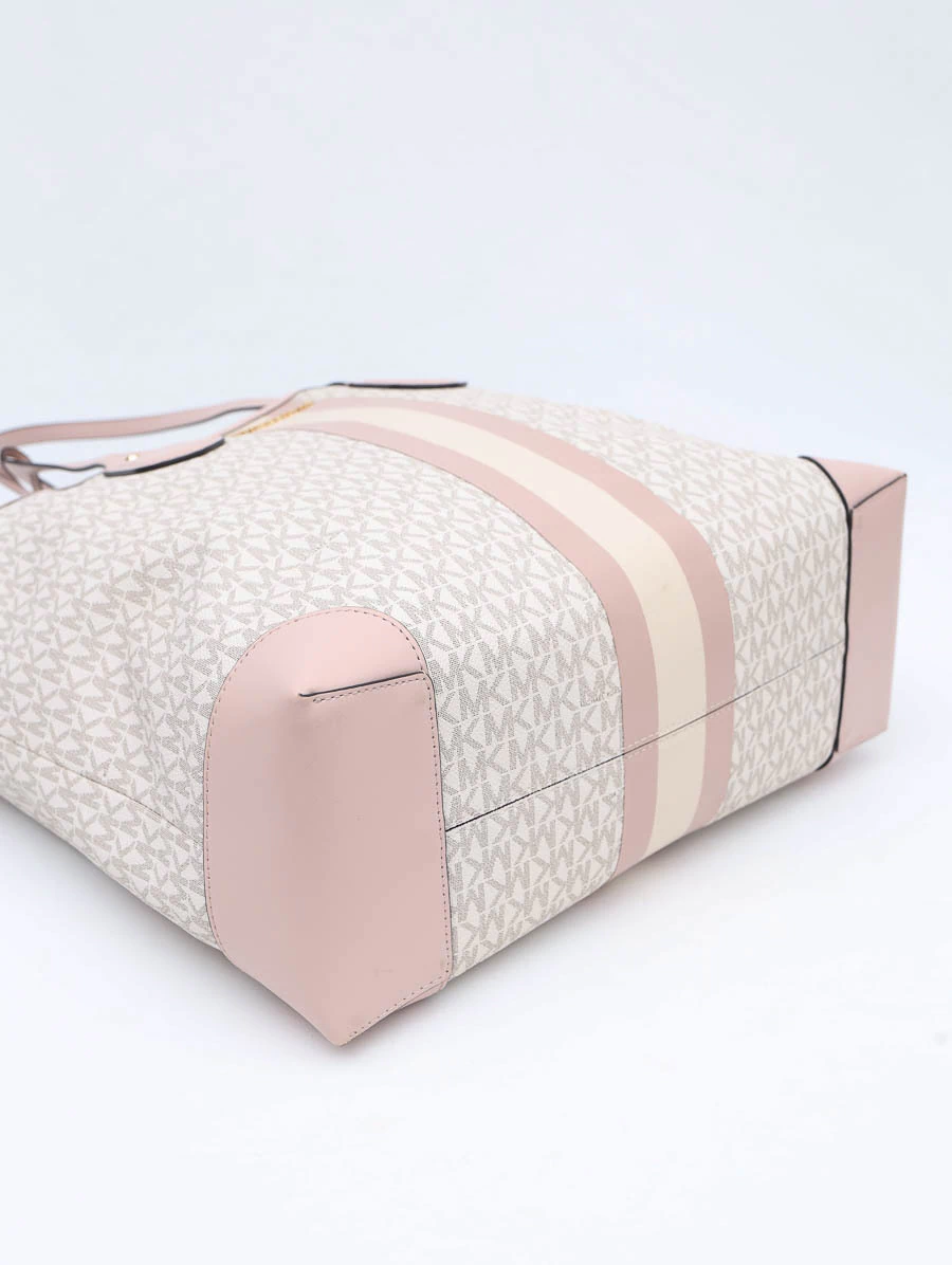 Bolsa Seminova Original Michael Kors Eva Tote é a definição de sofisticação e estilo. Produzida em canvas de alta qualidade, esta peça encantadora apresenta detalhes em couro cor de rosa e metais dourados que a tornam única. Com uma faixa central em rosa e branca, suas alças de ombro oferecem conforto e praticidade para o dia a dia. O design elegante é complementado por bordas em rosa claro, um delicado pingente e o logotipo da marca em dourado, garantindo que você se destaque em qualquer ocasião. O interior conta com um compartimento único, ideal para organizar seus pertences com facilidade.