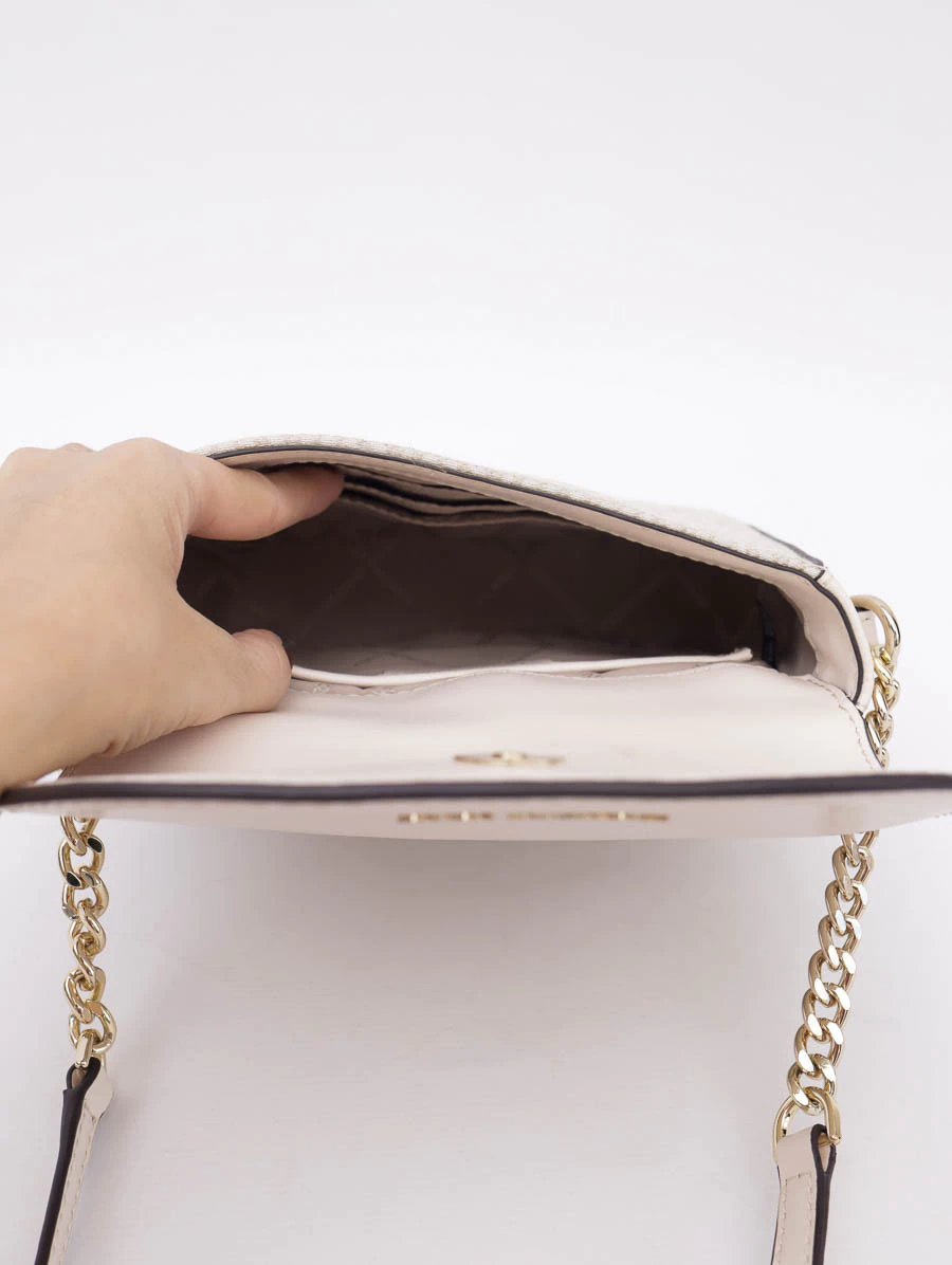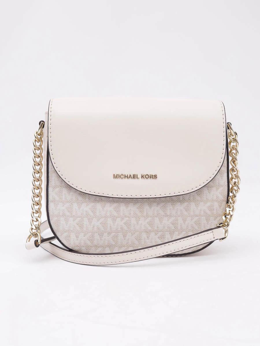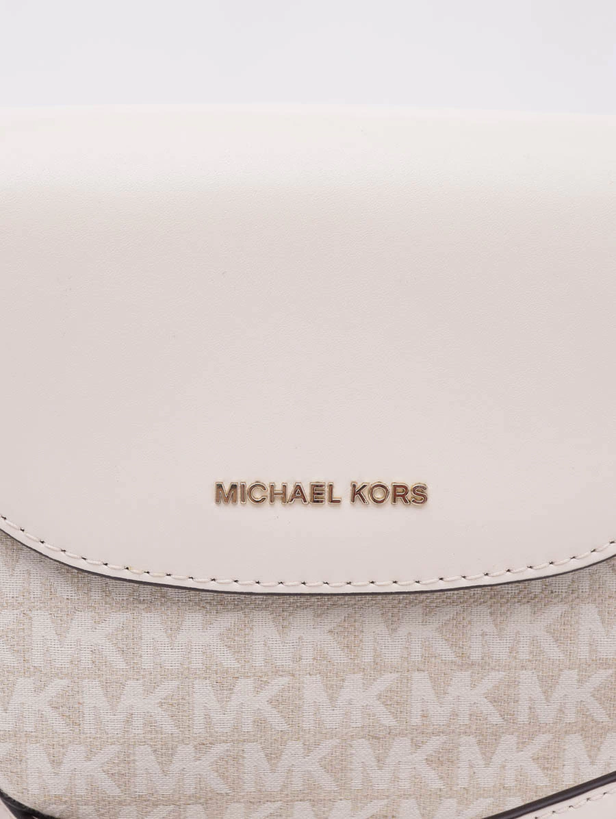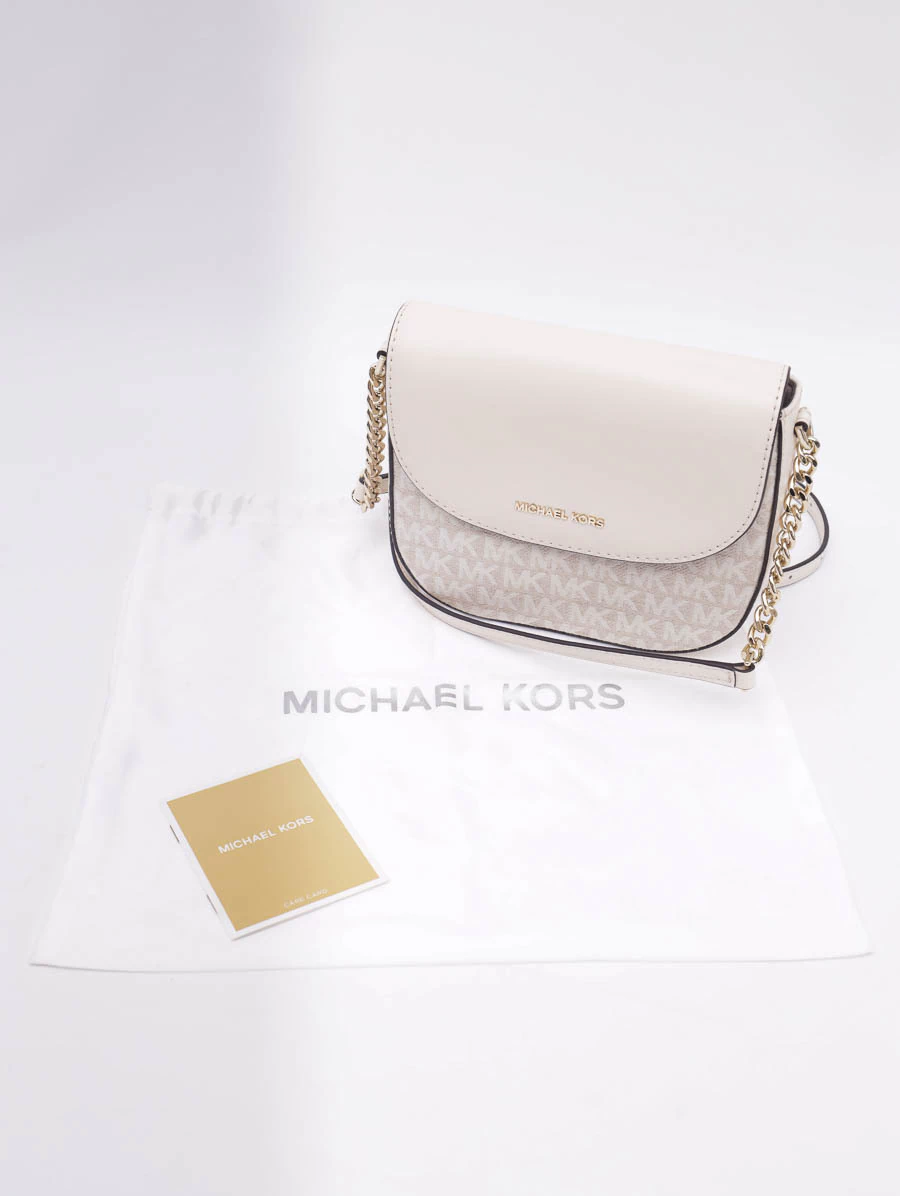 Bolsa Michael Kors Flap Monograma Crossbody produzida em tecido canvas monograma com detalhes em couro na cor off-white. Apresenta alça longa com detalhes em correntes, abertura por fecho magnético, um bolso externo, dois compartimentos internos e dois bolsos, um bolso aberto e um bolso com zíper.