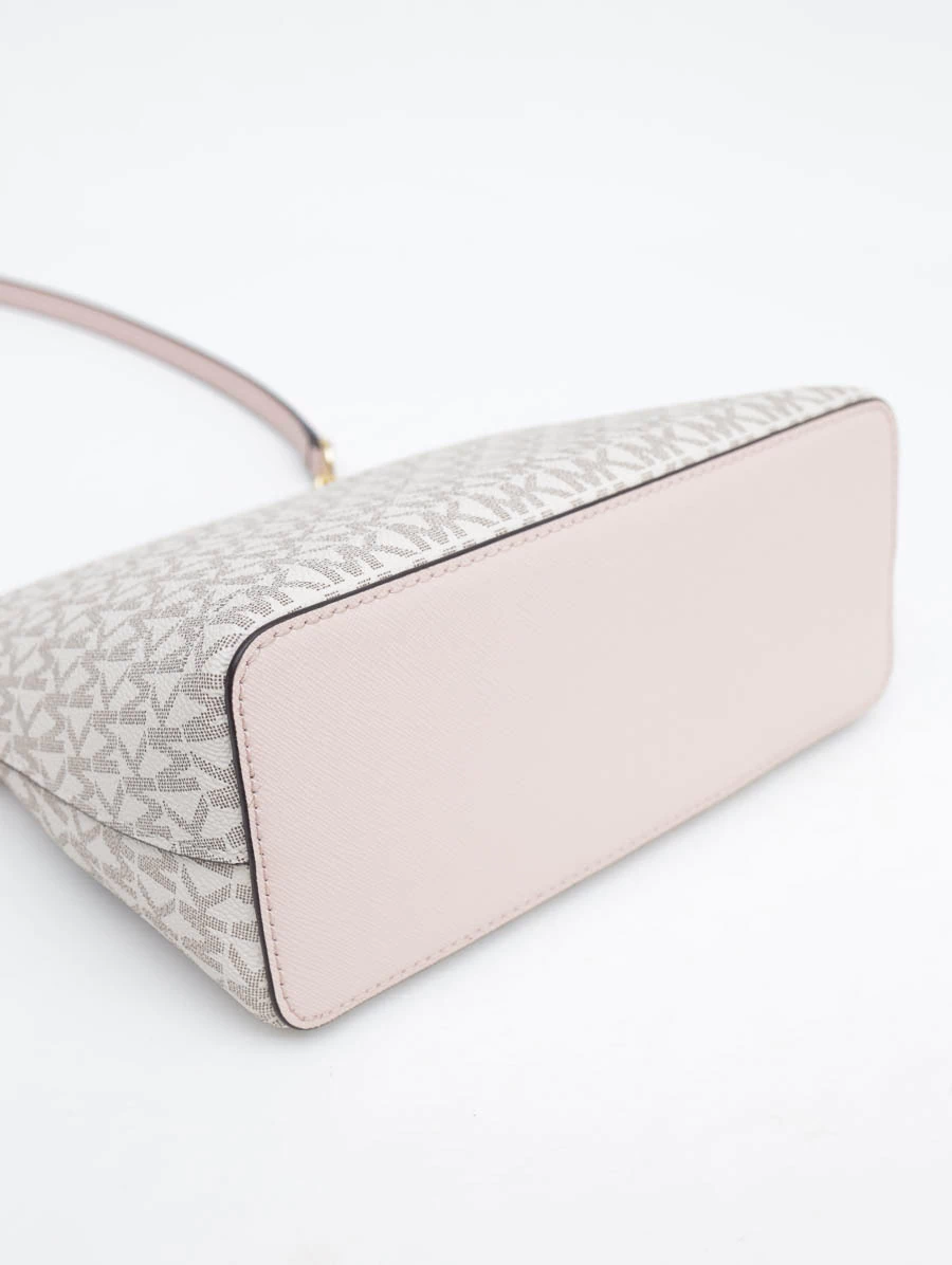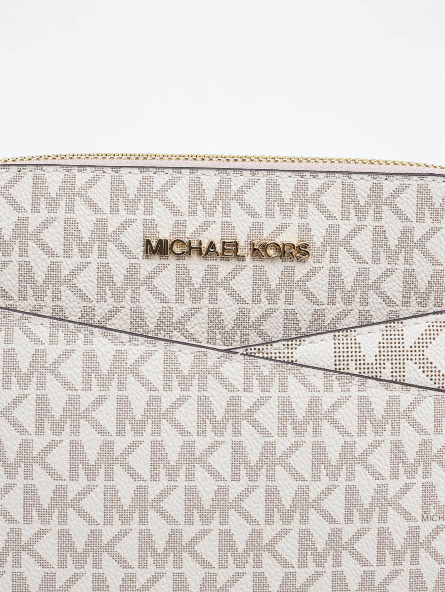 Bolsa Seminova Original Michael Kors Jet Set Crossbody produzida em canvas monograma, detalhes em rosa claro e ferragens douradas. Apresenta alça de ombro ajustável com detalhes em correntes, abertura superior com zíper, interior em nylon com um bolso interno lateral e um bolso externo.