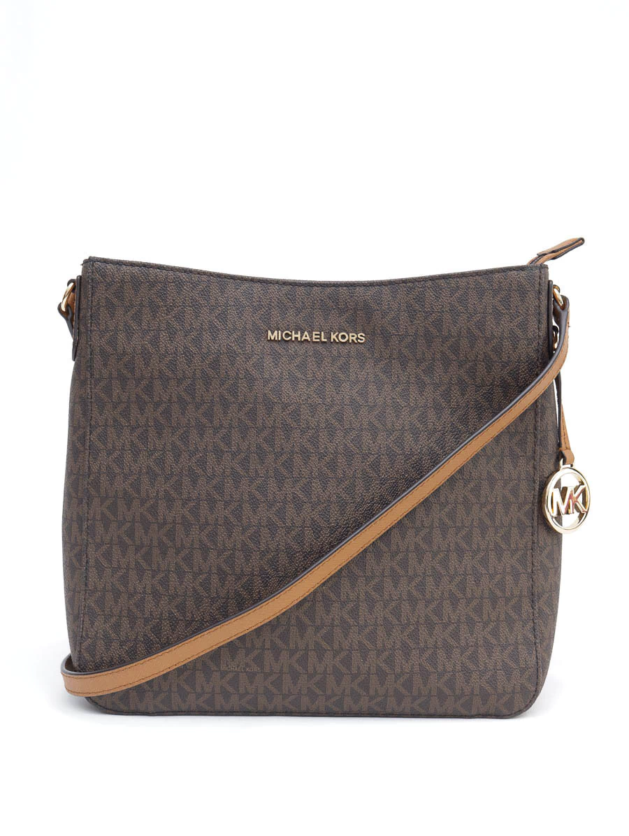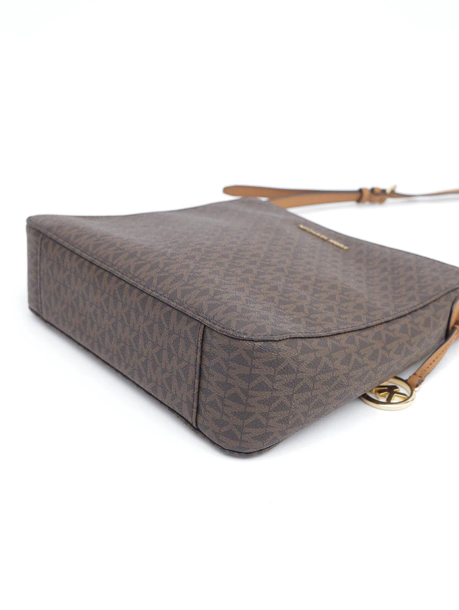 Bolsa Michael Kors Jet Set Tote produzida em canvas com com estampa MK e ferragens douradas. Apresenta alças longa ajustáveis, um prático bolso na parte de trás e interior em nylon com três bolsos.
