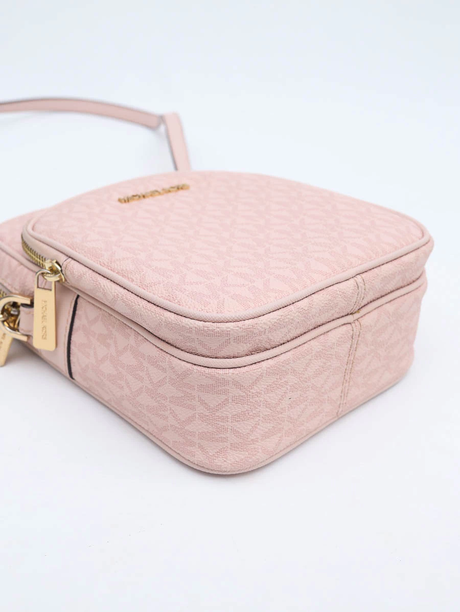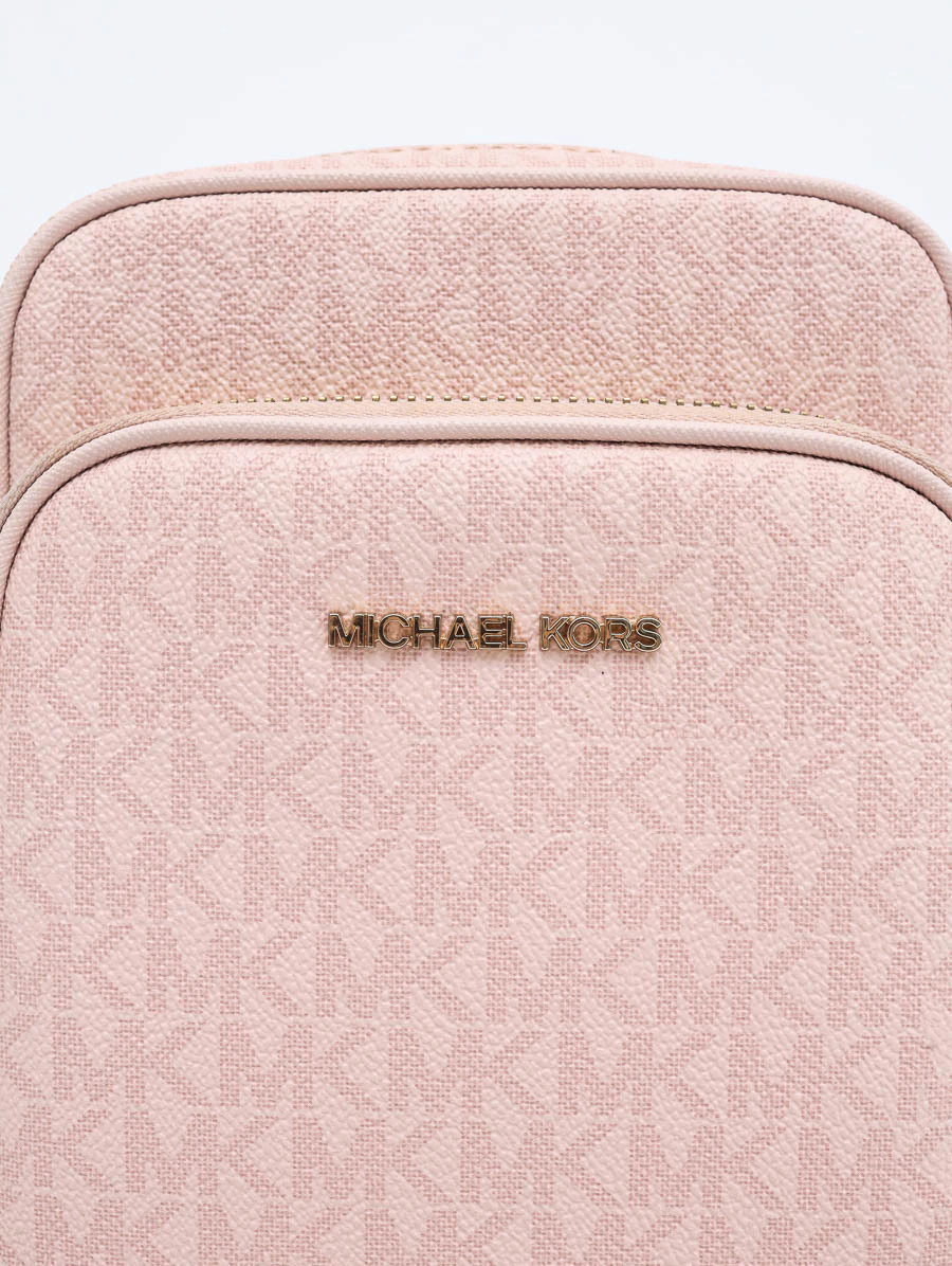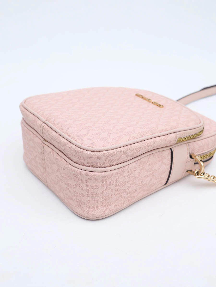 Bolsa Seminova Original Michael Kors Jet Set Travel Crossbody produzida em canvas monograma na cor rosa e ferragens douradas. Apresenta alça de ombro ajustável com detalhes em correntes, dois compartimentos externos com fechamento por zíper e um compartimento aberto, interior em nylon com um bolso maior e três bolsinhos menores.
