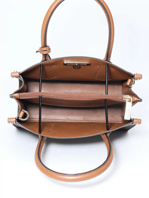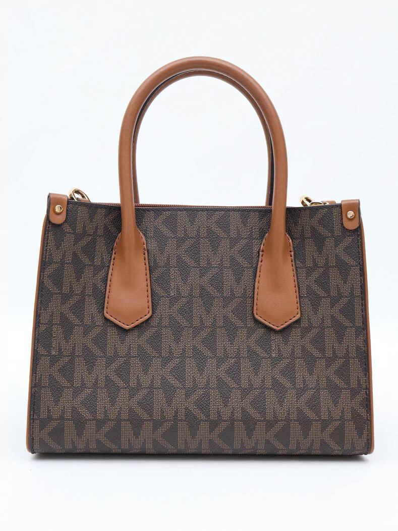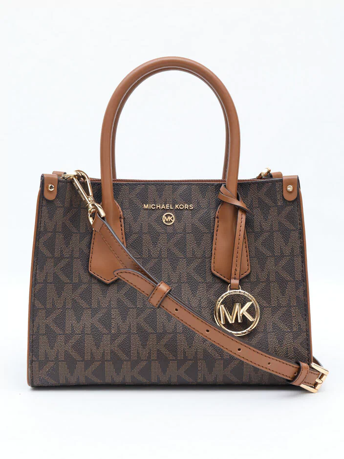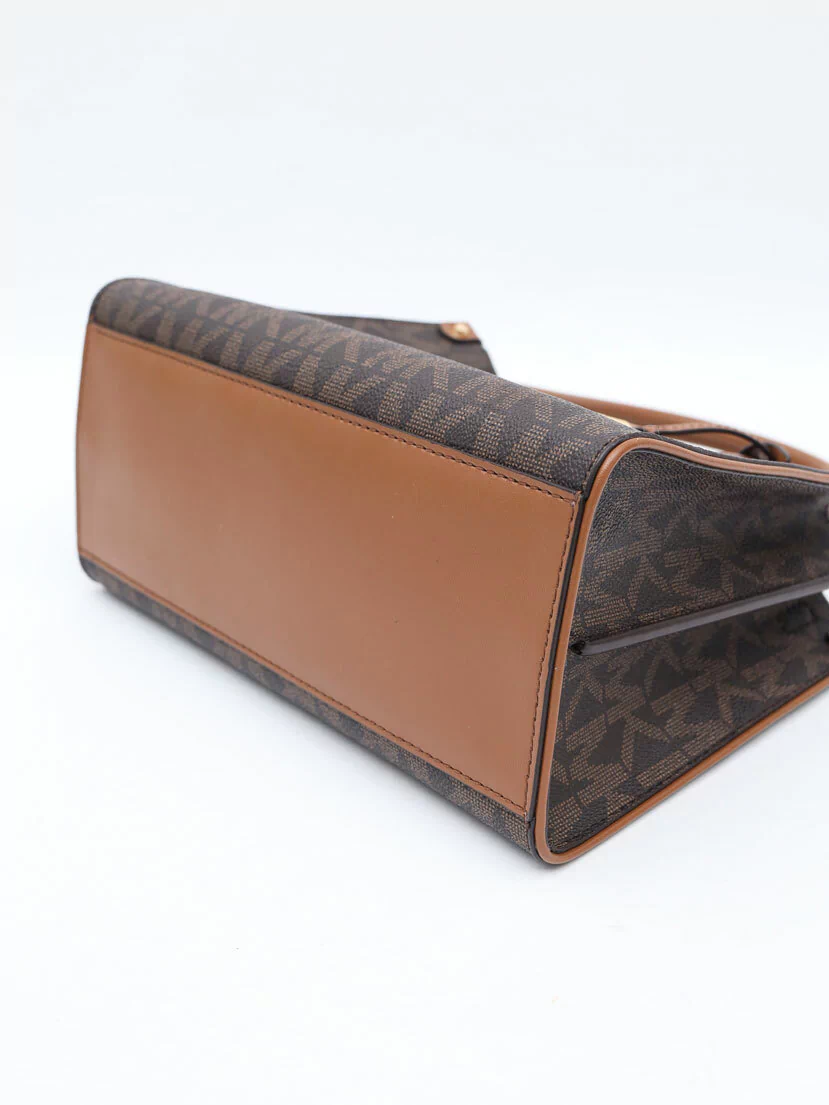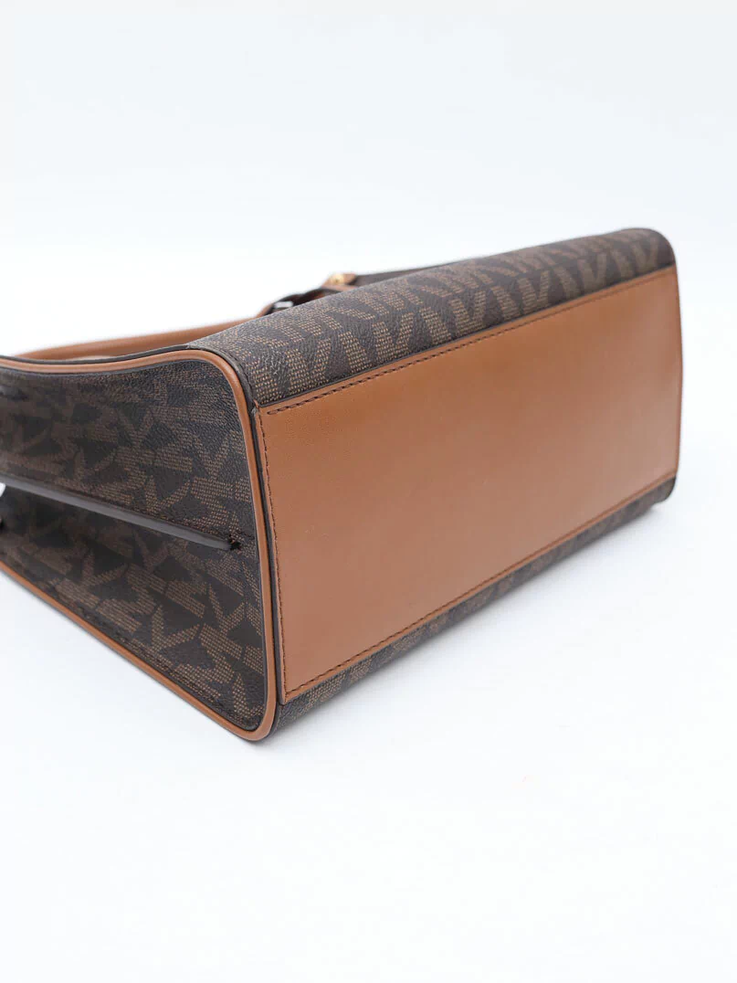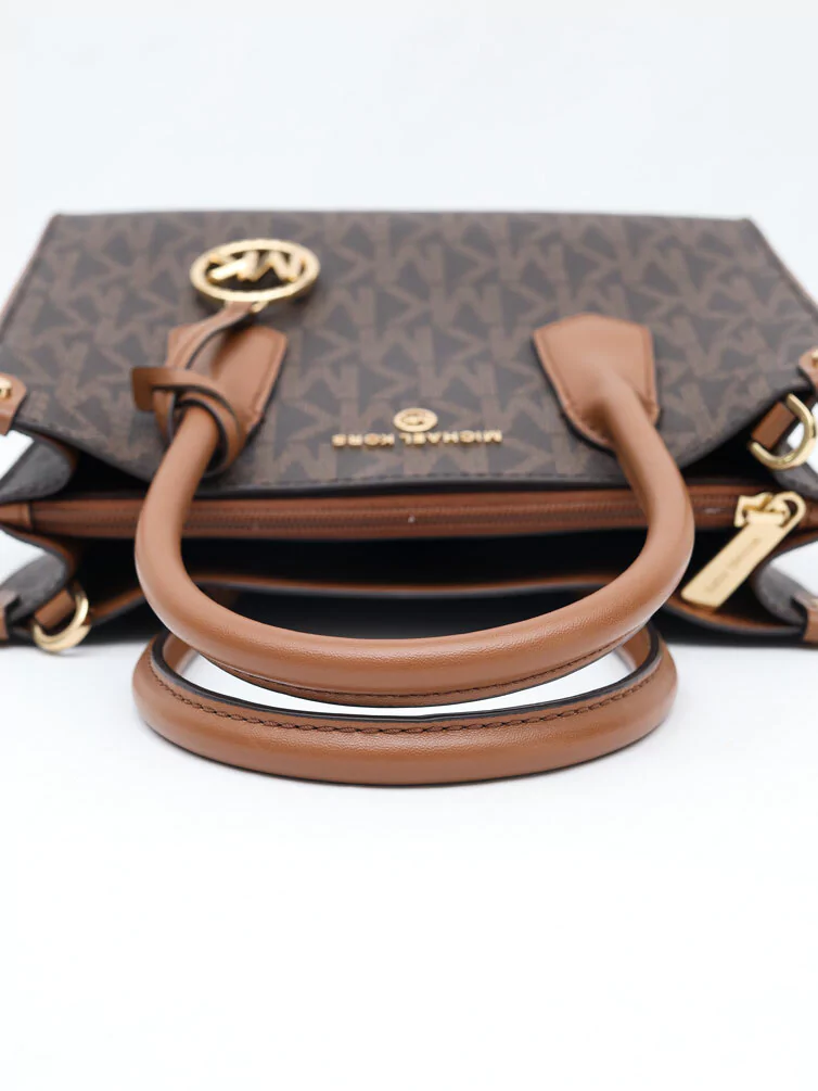 Bolsa Michael Kors JetSet Monograma Ebano é uma bolsa pequena com um visual lindo e elegante. Produzida em canvas com estampa MK, detalhes em couro marrom e metais dourados. Apresenta abertura superior com três compartimentos, sendo dois abertos e um com zíper. Bolsa com alças de mão, alça longa com ajuste de comprimento e um belíssimo pingente com iniciais da marca.