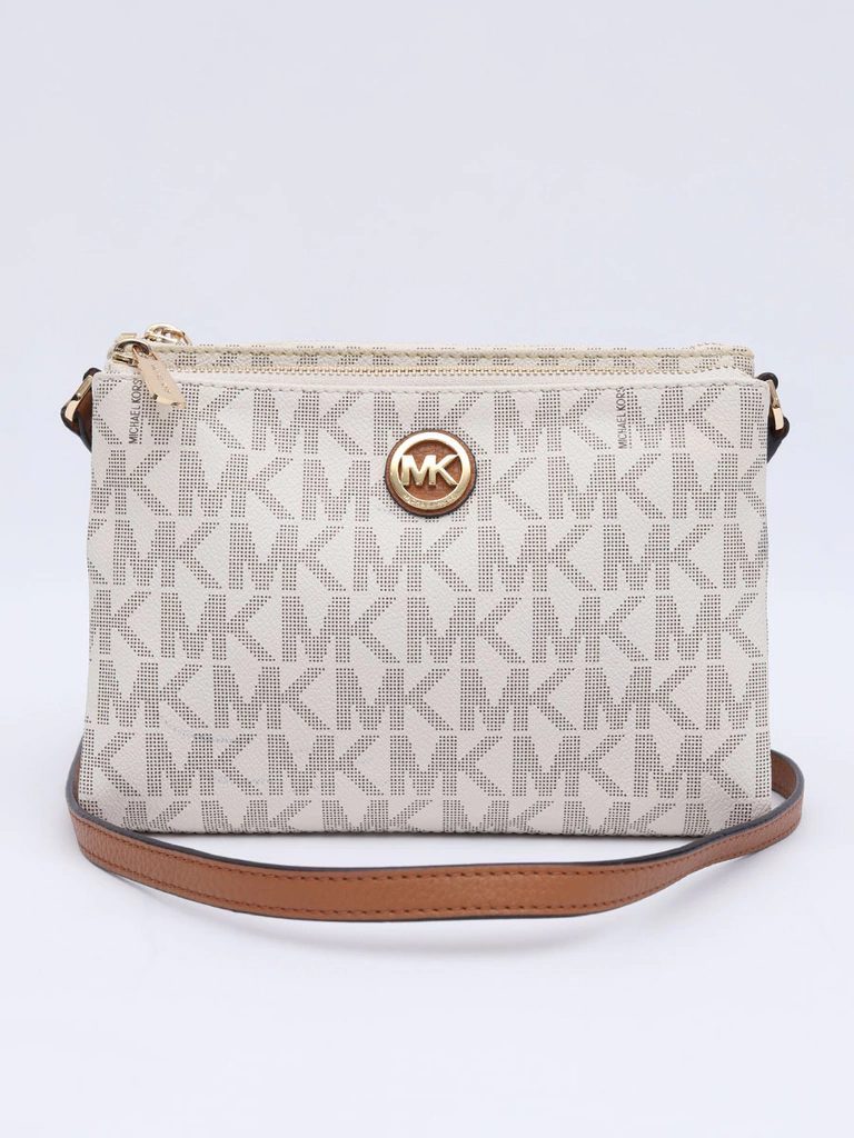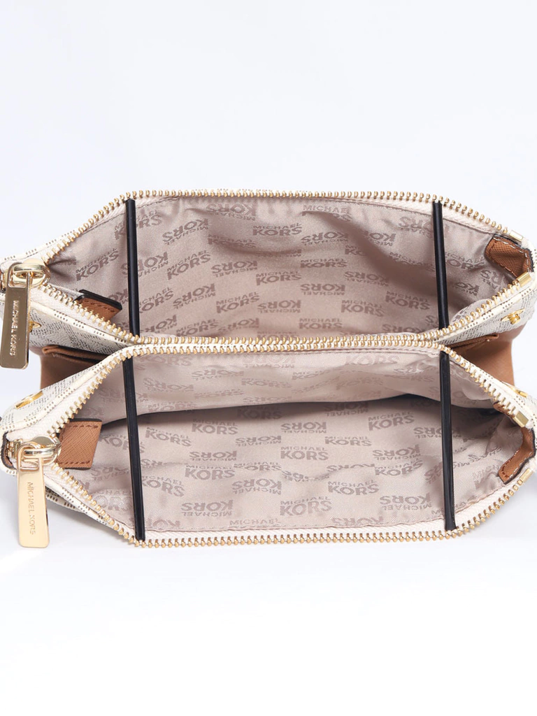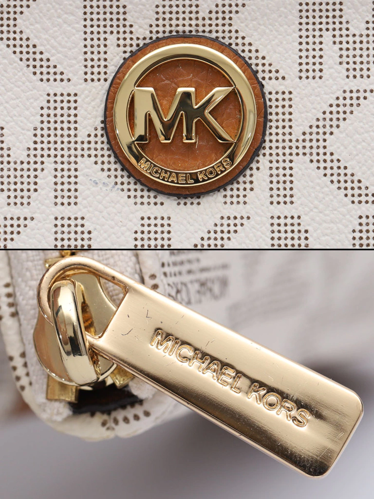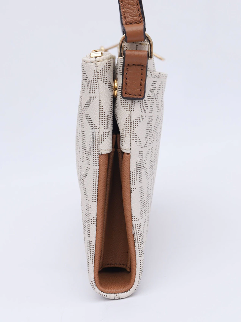 Bolsa Autêntica Michael Kors Medium Canvas Monogram produzida em material canvas off-white com estampa MK pontilhada em marrom, detalhes nas laterais e alça em couro marrom e metais dourados. Apresenta um lindo logo em metal na parte da frente, alça longa com ajuste de comprimento, 2 compartimentos na parte superior com zíper e um compartimento central com fechamento através de botões de pressão, espaços para cartões e documentos.