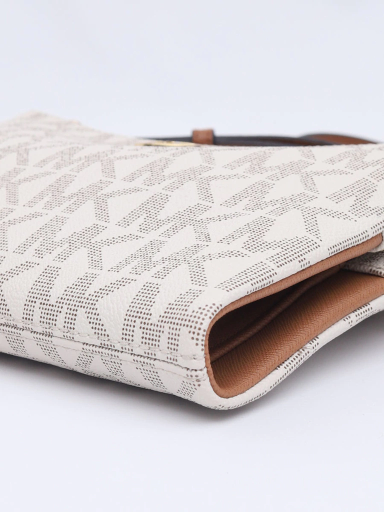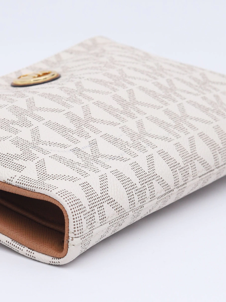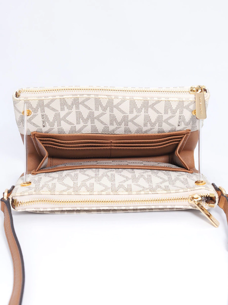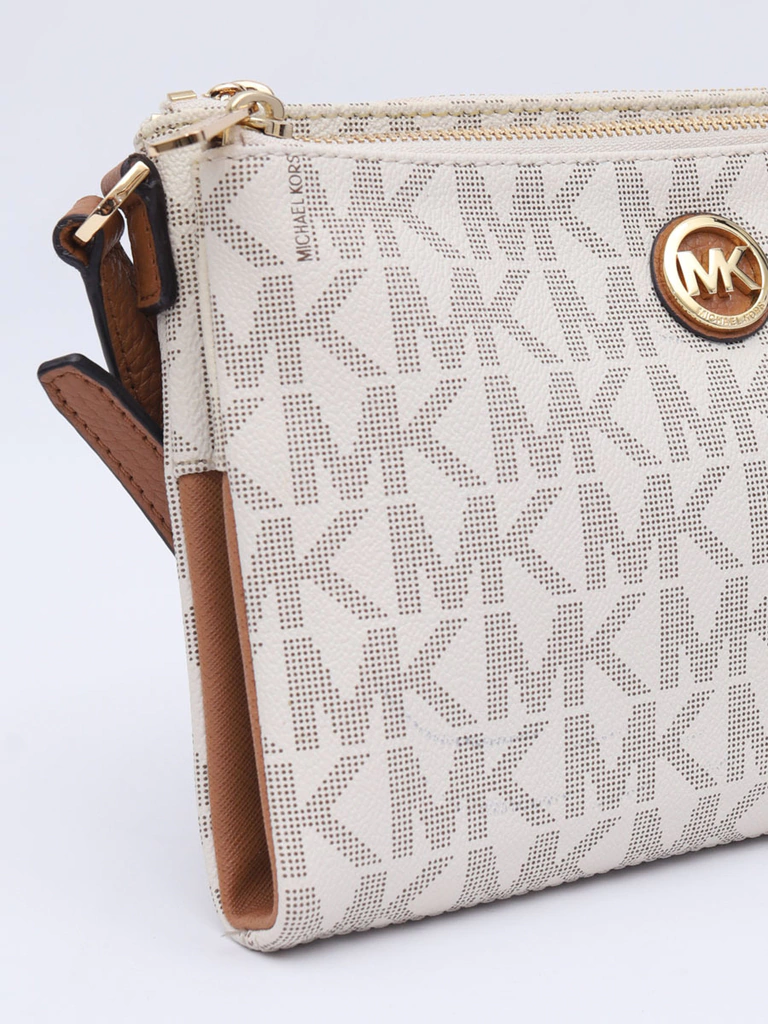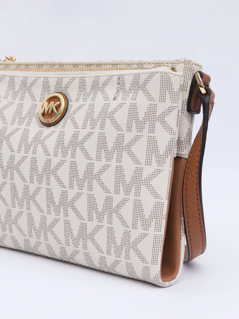 Bolsa Autêntica Michael Kors Medium Canvas Monogram produzida em material canvas off-white com estampa MK pontilhada em marrom, detalhes nas laterais e alça em couro marrom e metais dourados. Apresenta um lindo logo em metal na parte da frente, alça longa com ajuste de comprimento, 2 compartimentos na parte superior com zíper e um compartimento central com fechamento através de botões de pressão, espaços para cartões e documentos.