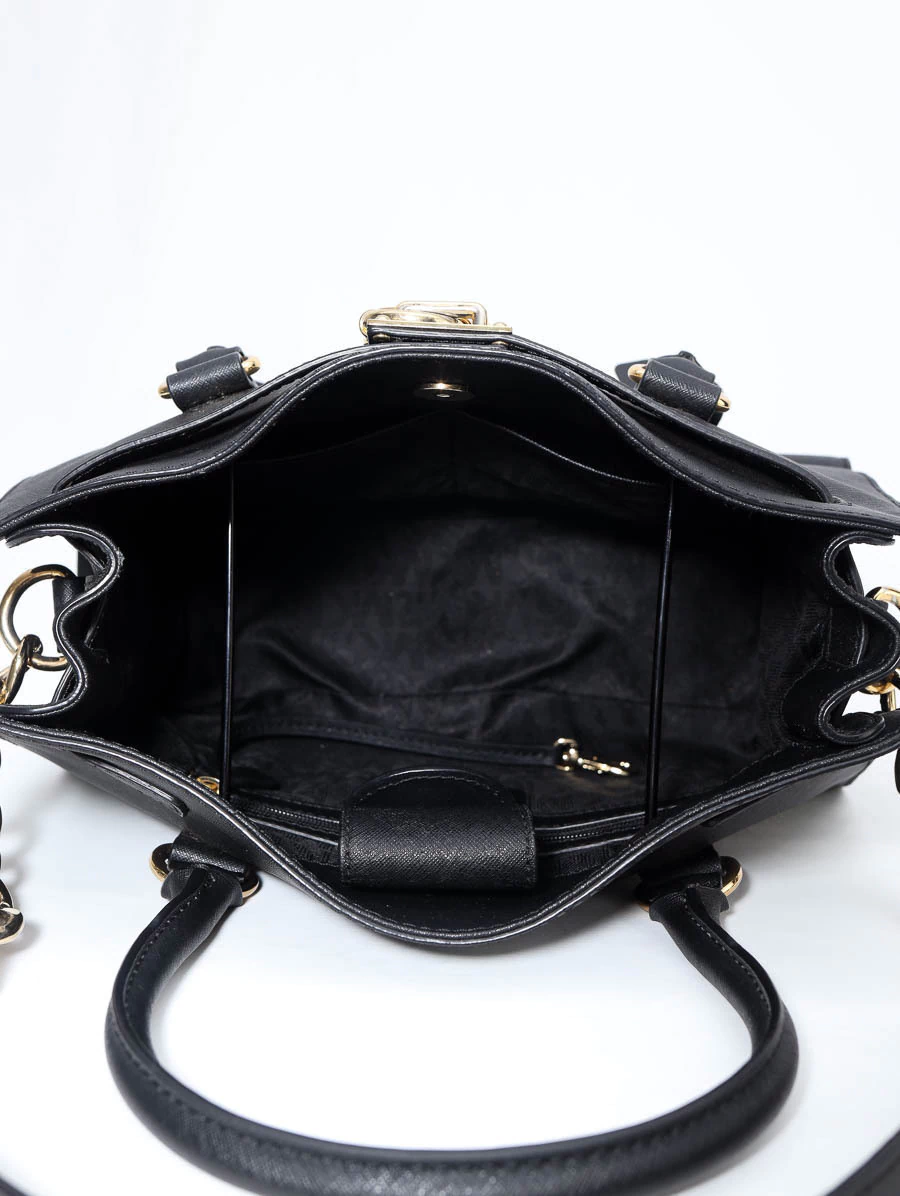 Bolsa Seminova Original Michael Kors Preta, confeccionada em couro texturizado e com metais dourados que dão um charme todo especial. Possui detalhe de cadeado na frente, alça de mão e alça de ombro com detalhes em corrente, perfeita para te acompanhar em qualquer ocasião. A abertura é com fecho magnético e o interior conta com três bolsos, sendo um com zíper para maior segurança.