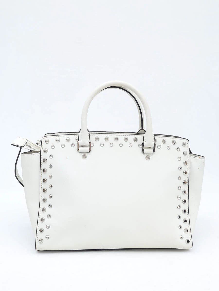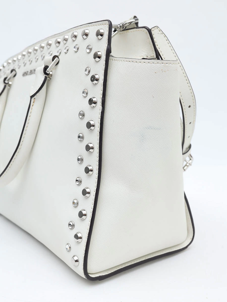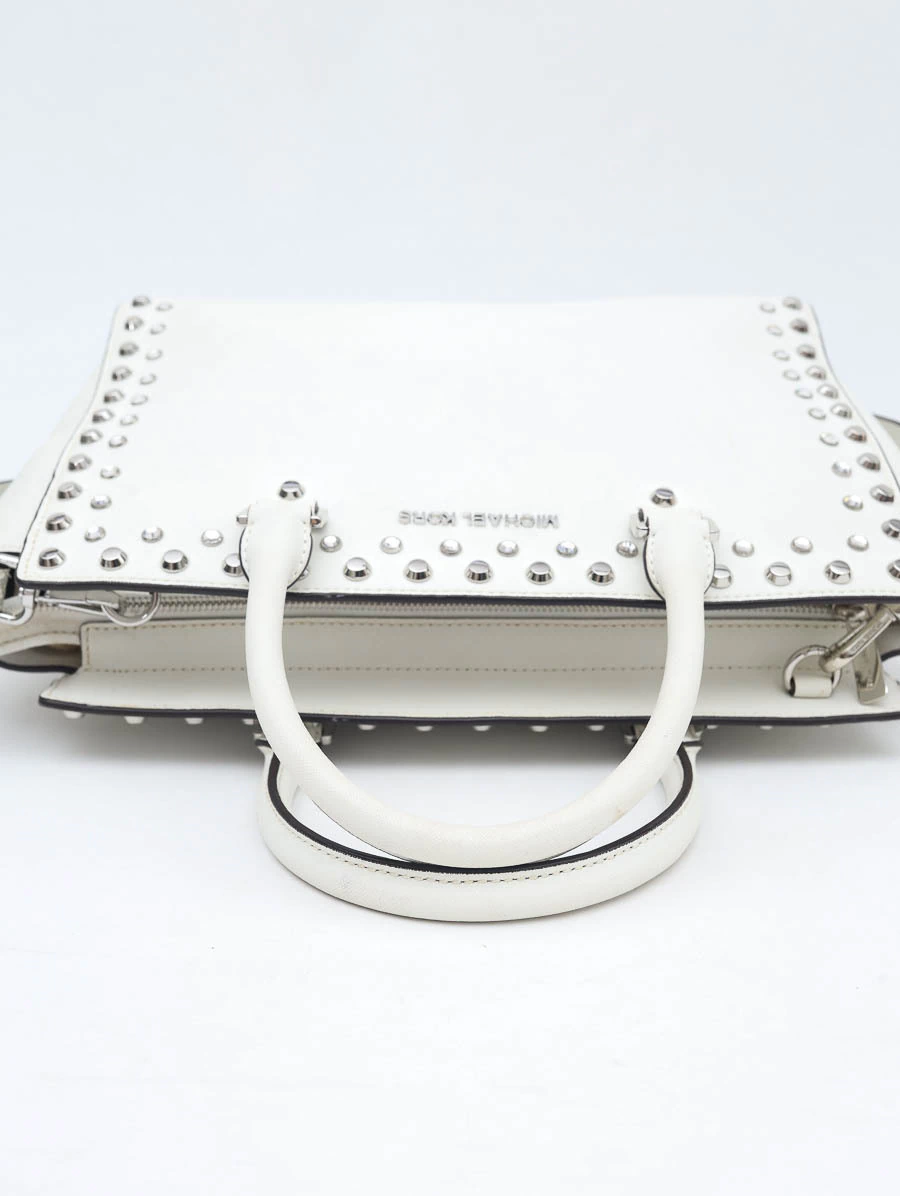 Bolsa original Michael Kors Studded Satchel em couro branco, com aplicação de studs prateados e design estruturado. Elegante e moderna, é perfeita para compor produções sofisticadas.