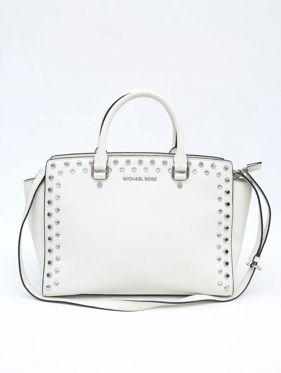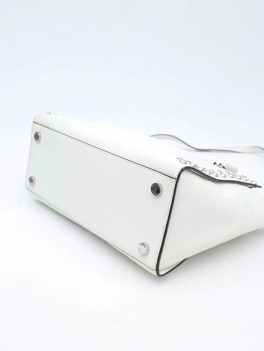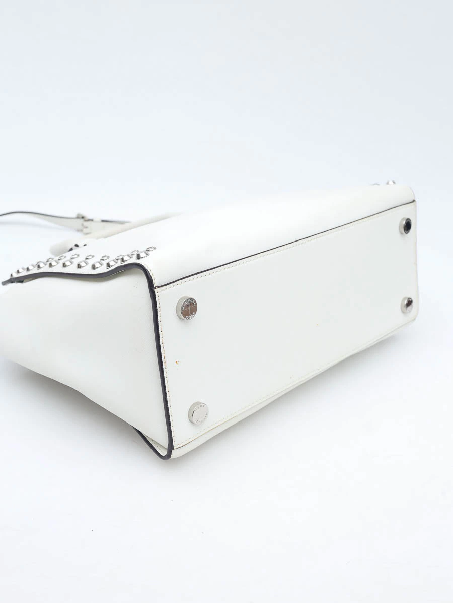 Bolsa original Michael Kors Studded Satchel em couro branco, com aplicação de studs prateados e design estruturado. Elegante e moderna, é perfeita para compor produções sofisticadas.