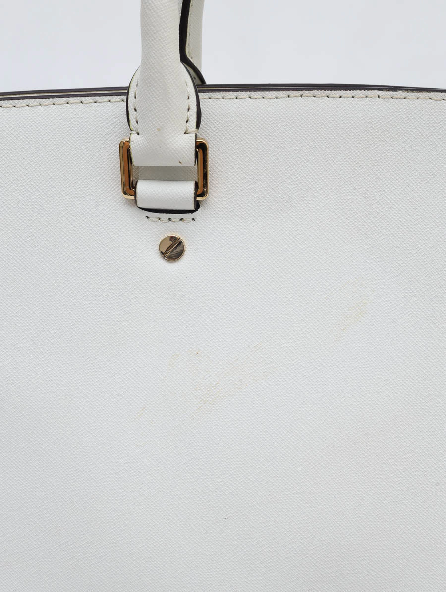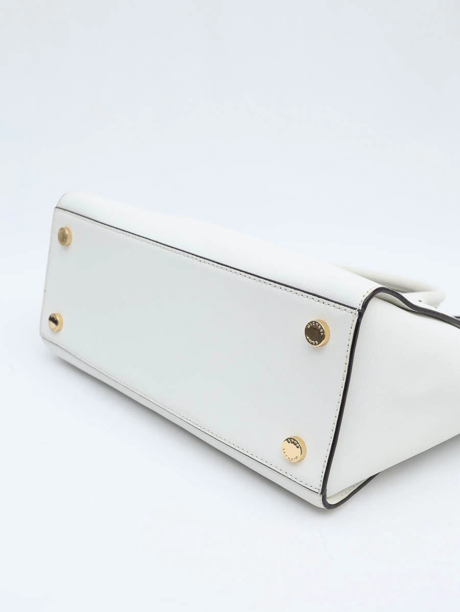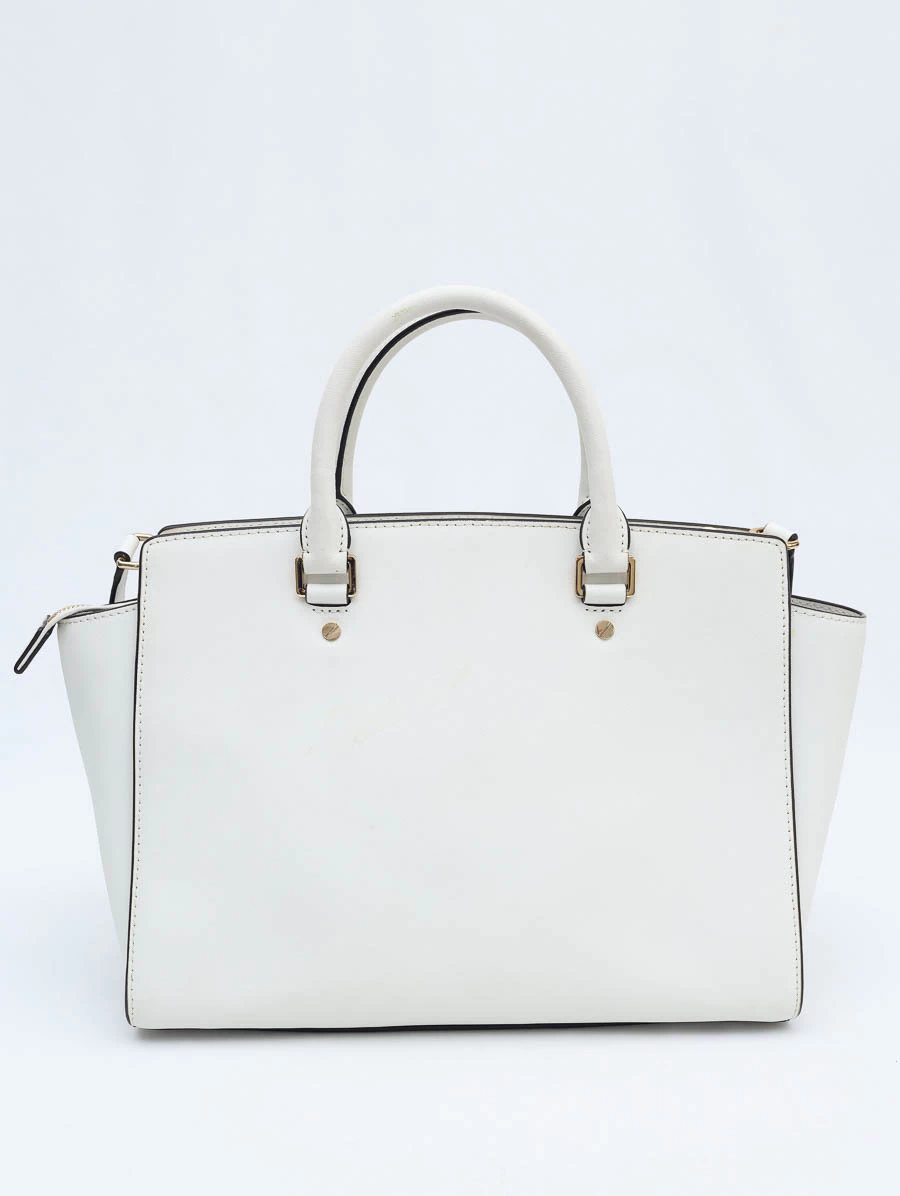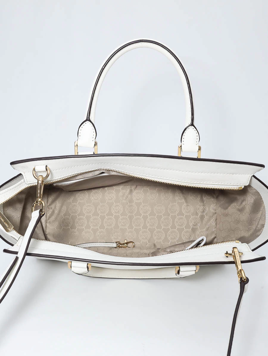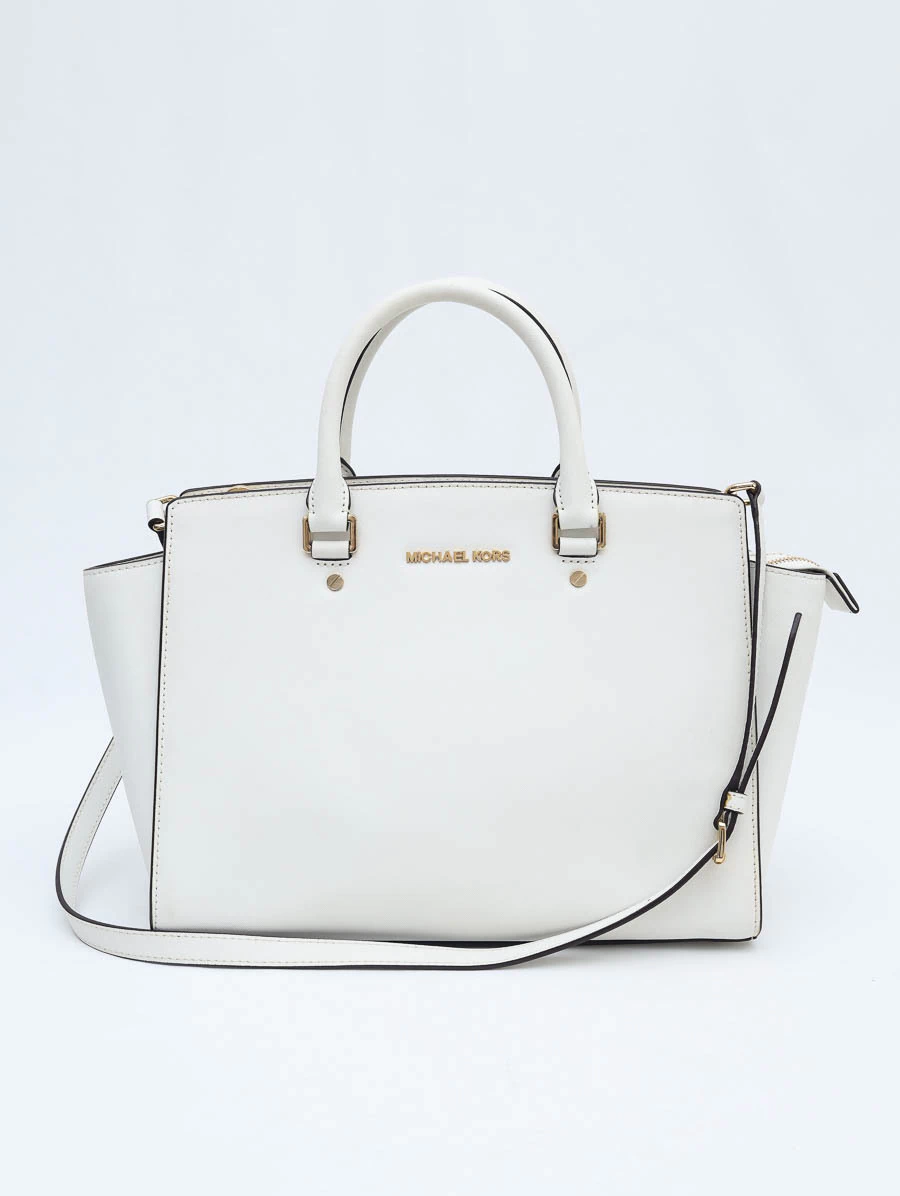 Bolsa Michael Kors Selma produzida em couro saffiano na cor branca e ferragens douradas. Apresenta uma alça longa removível e ajustável, duas alças de mão, fechamento por zíper, compartimento único com quatro bolsos internos, sendo um com fechamento por zíper.