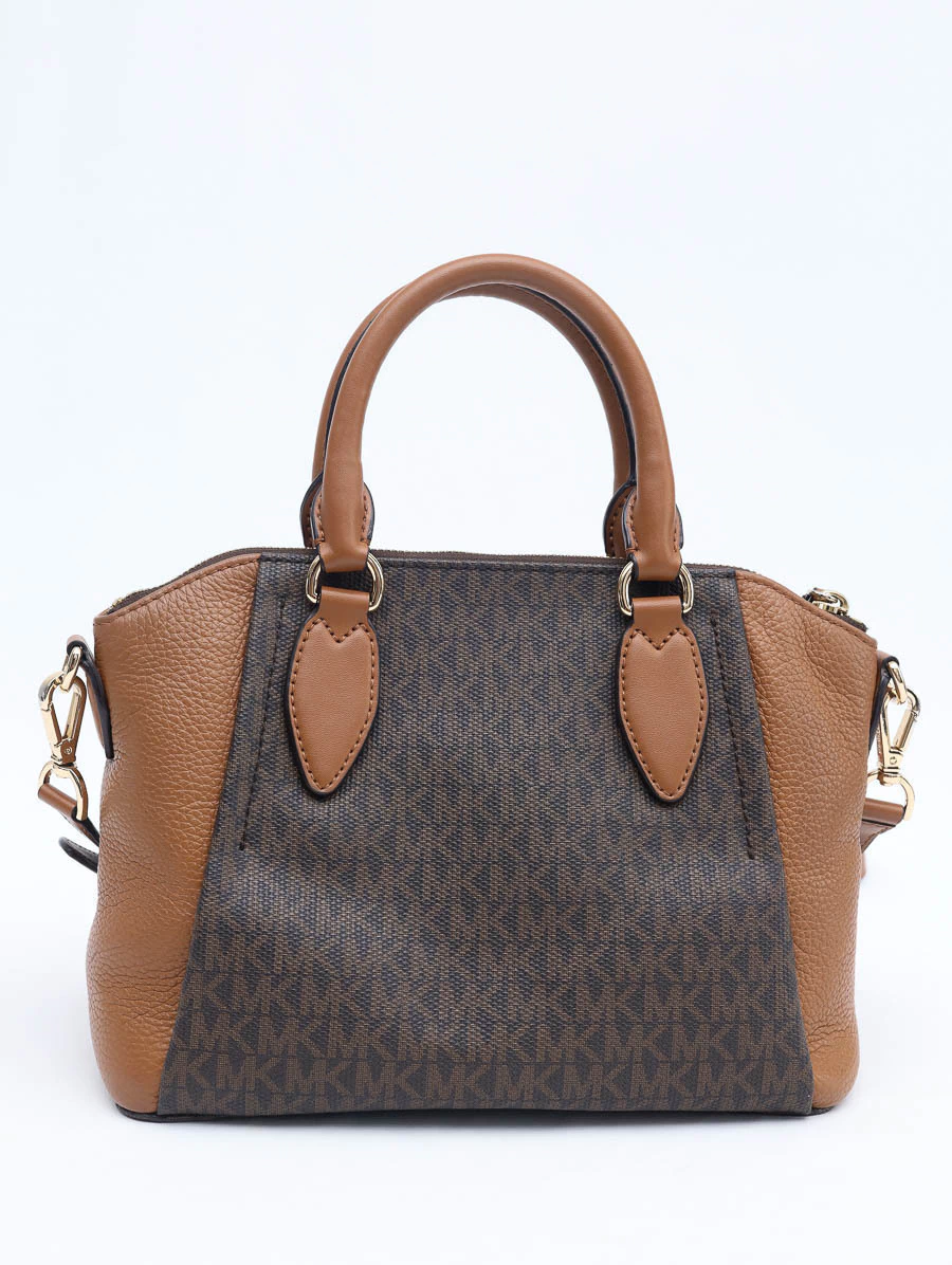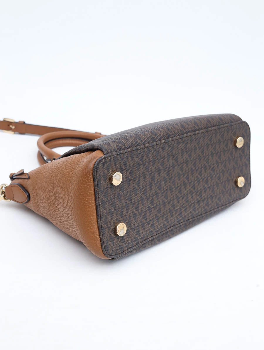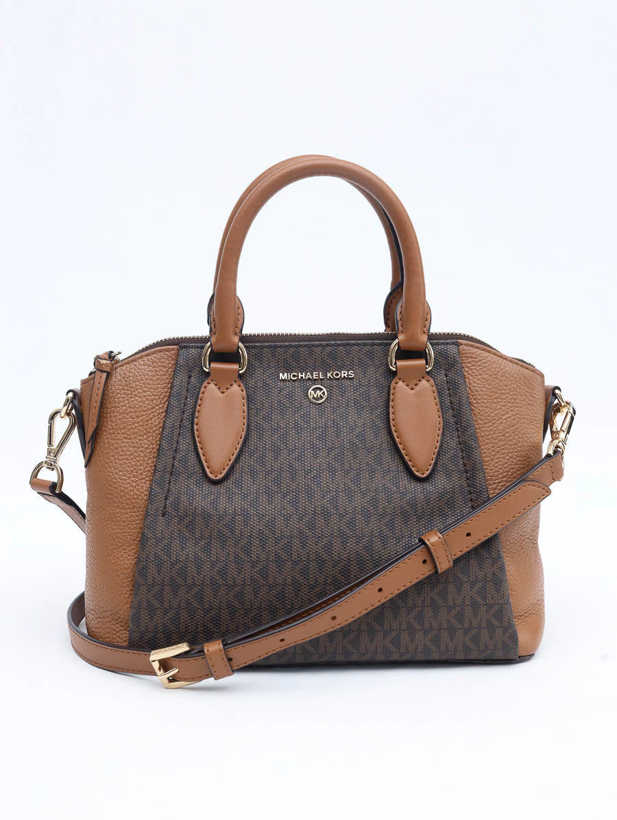 Bolsa Michael Kors Sienna, confeccionada em couro e canvas de alta qualidade na cor marrom, com design elegante e espaçoso. Ideal para o dia a dia, combina sofisticação e funcionalidade.