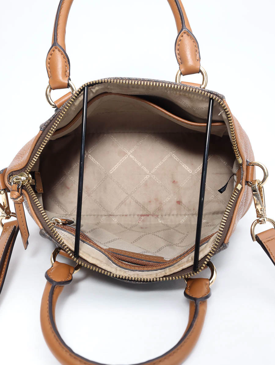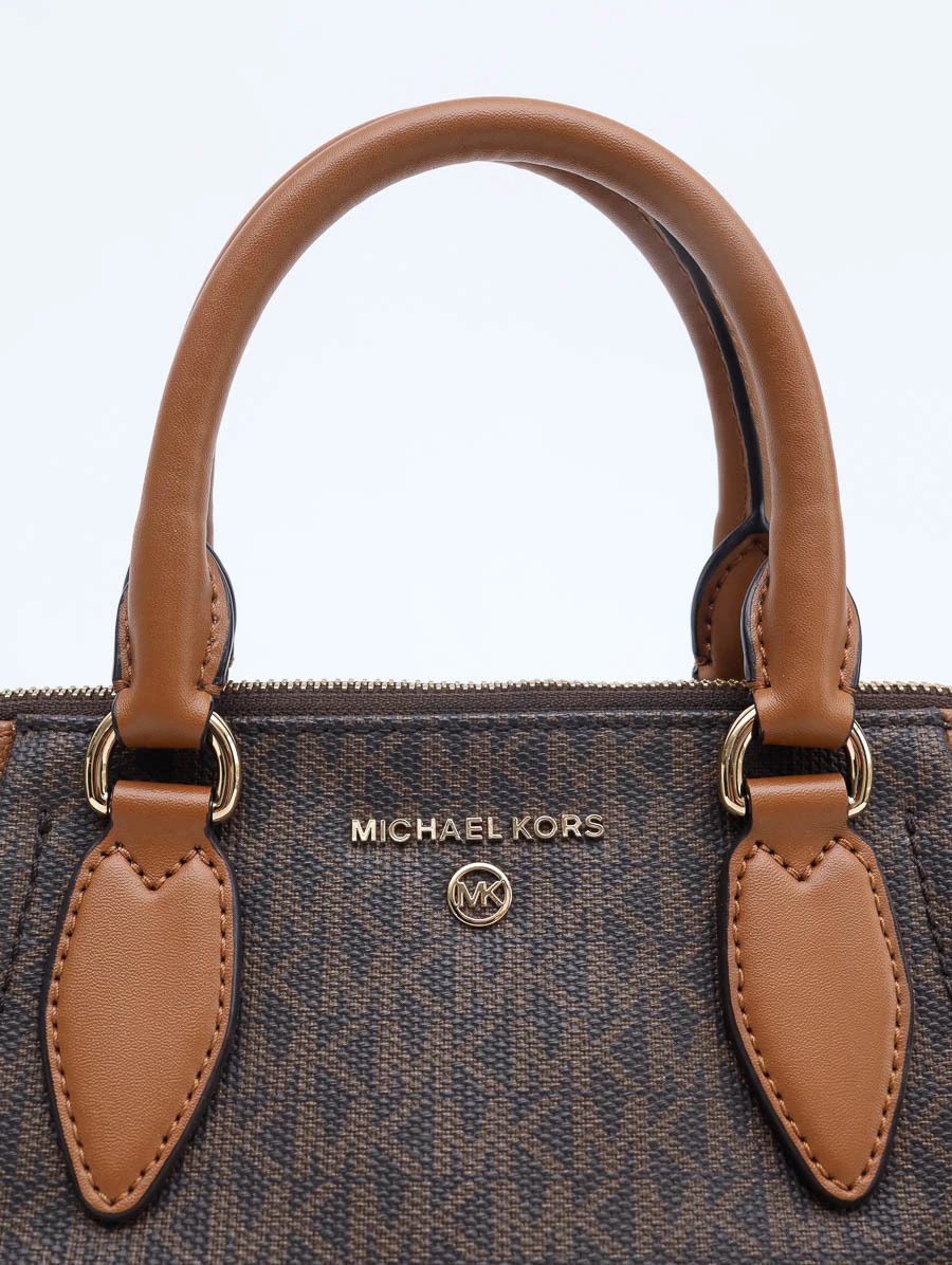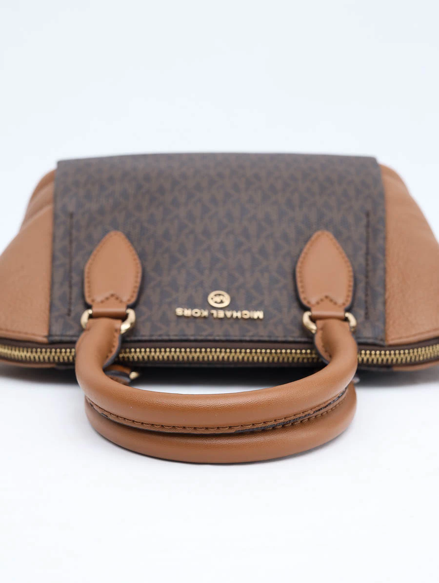 Bolsa Michael Kors Sienna, confeccionada em couro e canvas de alta qualidade na cor marrom, com design elegante e espaçoso. Ideal para o dia a dia, combina sofisticação e funcionalidade.