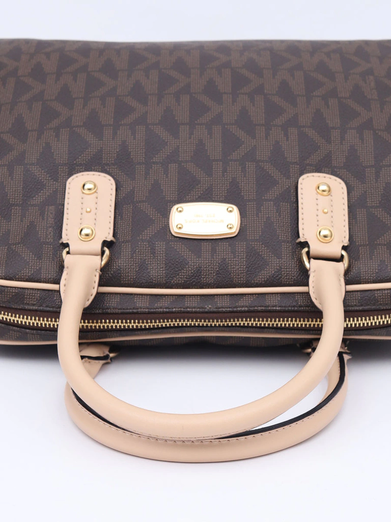 Bolsa Autêntica Michael Kors Signature Large produzida em canvas com estampa MK e detalhes em couro bege. Apresenta abertura superior com zíper, alça longa removível com ajuste de comprimento e interior super espaçoso em nylon com 5 bolsos internos.