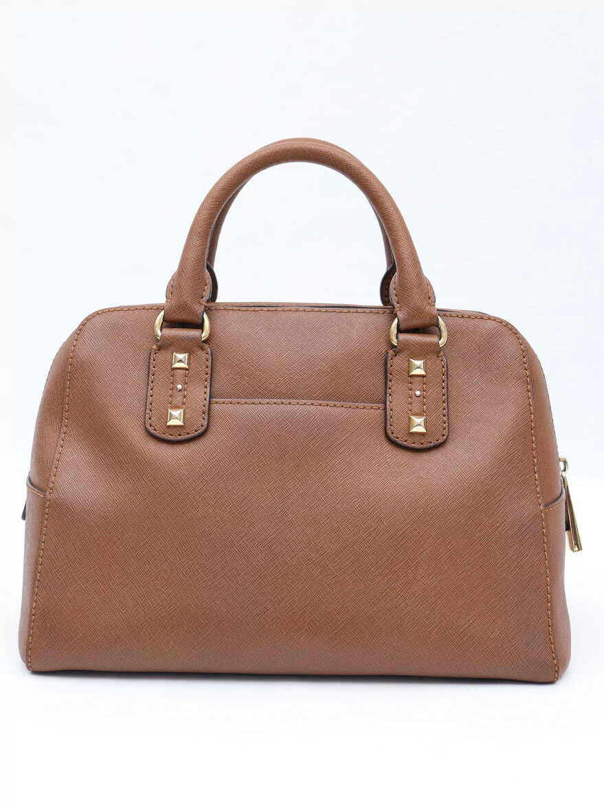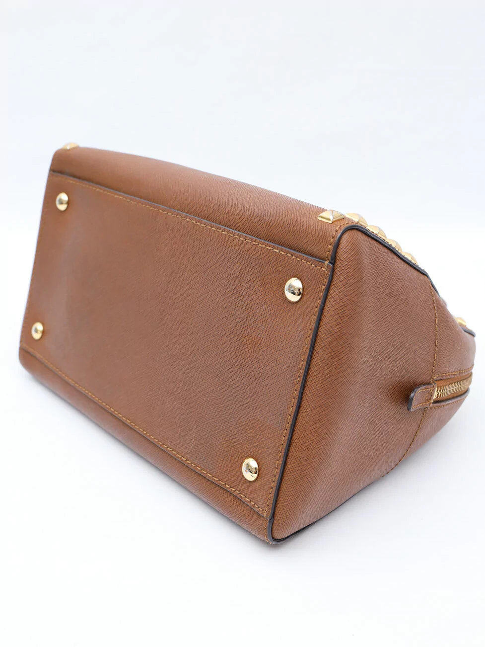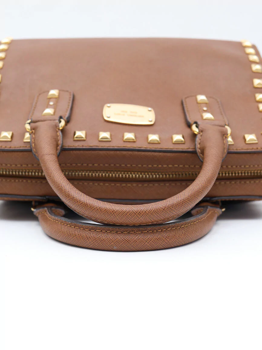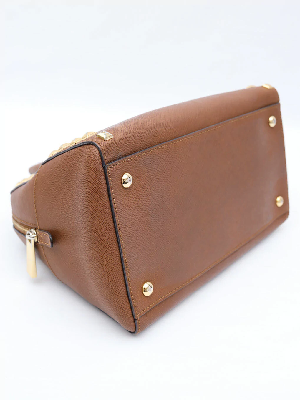 Bolsa Autêntica Michael Kors Spikes Crossbody produzida em couro Saffiano decorada com taxas douradas nas bordas, abertura superior com zíper, pequeno bolso externo na parte de trás da bolsa e alça longa removível com ajuste de comprimento. Apresenta interior em nylon com três bolsos.