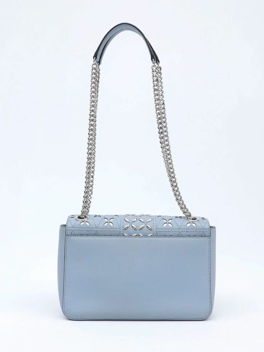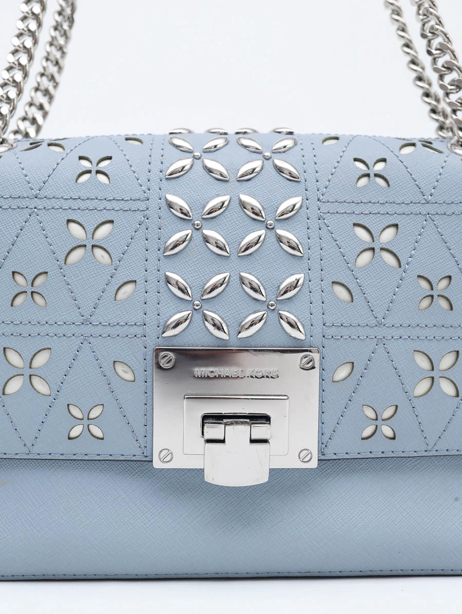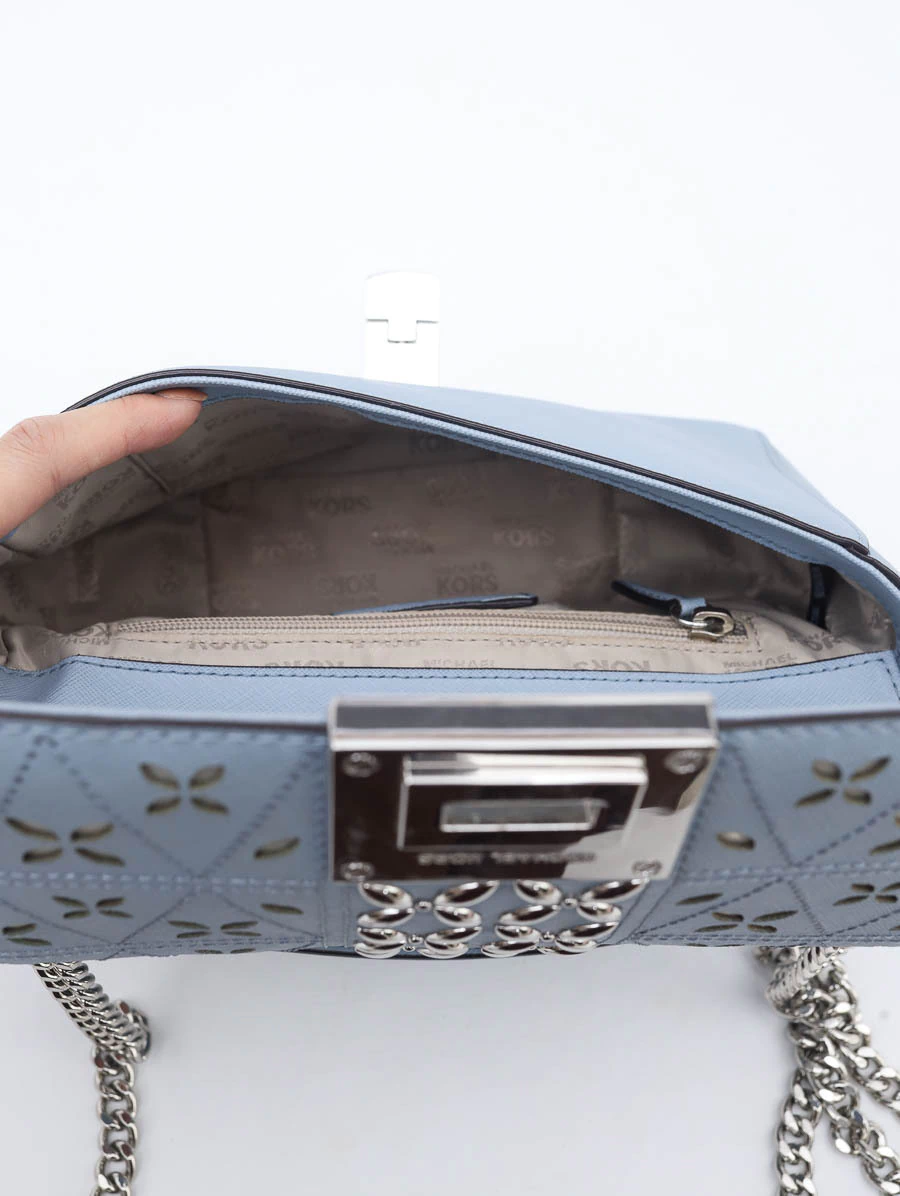 Bolsa Seminova Original Michael Kors Stud Azul, uma peça deslumbrante, produzida em couro saffiano na cor azul, que traz sofisticação a qualquer look. Com ferragens prateadas e uma alça crossbody com detalhes em corrente ajustável que se transforma em uma alça de ombro, oferecendo versatilidade para diferentes ocasiões, além de possuir detalhes vazados e em metais. Sua estrutura inclui um prático bolso externo traseiro e uma abertura frontal por fecho de encaixe, garantindo segurança e estilo. O interior possui compartimento único com dois bolsos laterais, sendo um com zíper, ideal para manter tudo organizado.