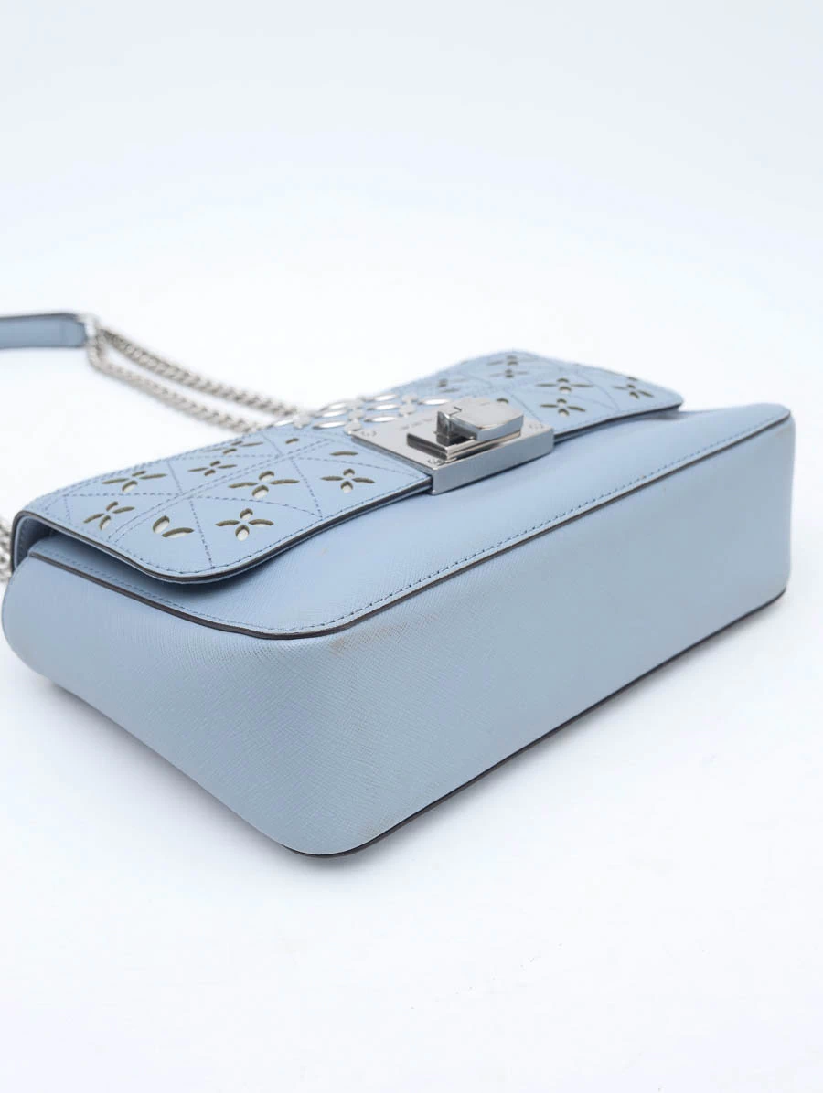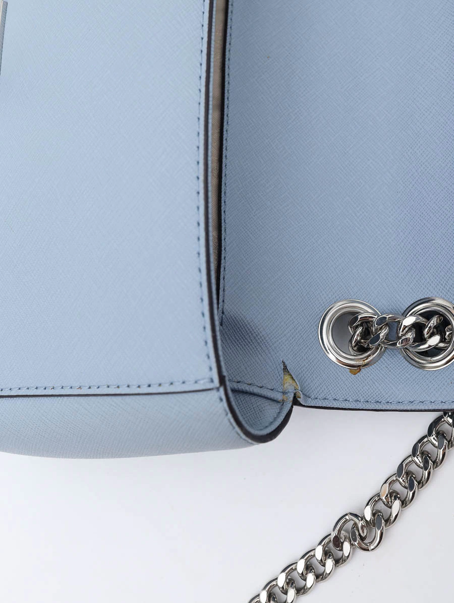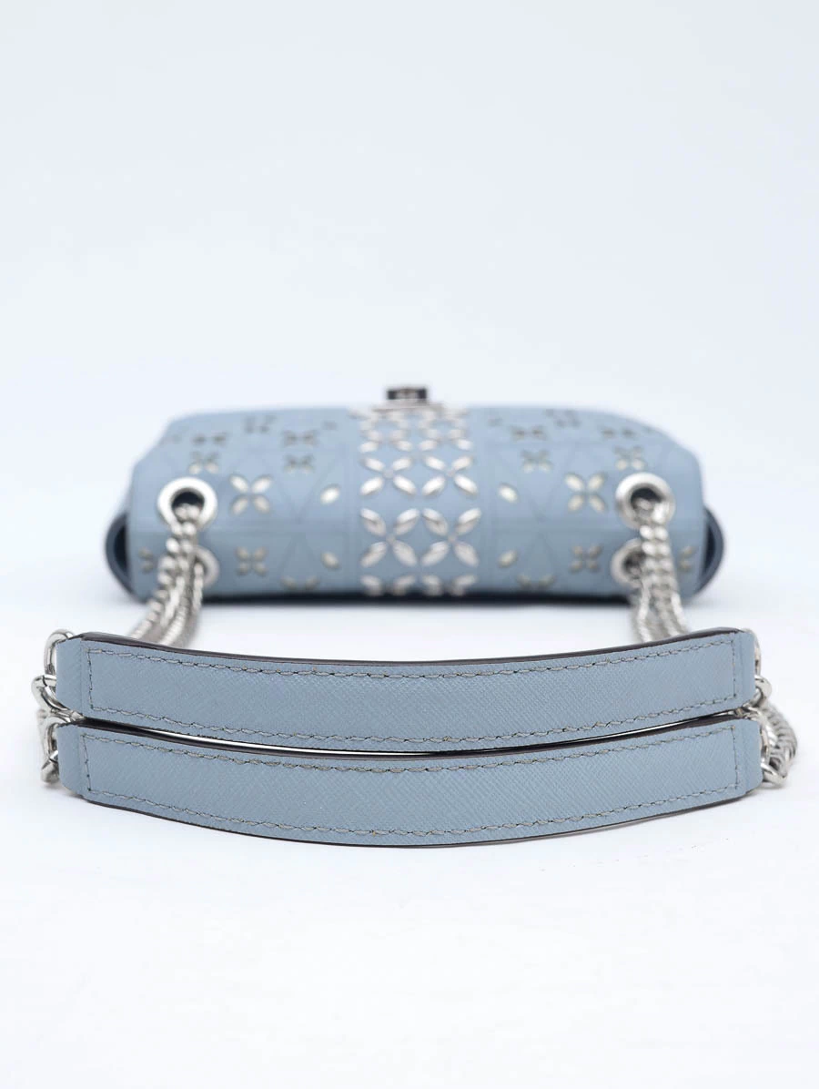 Bolsa Seminova Original Michael Kors Stud Azul, uma peça deslumbrante, produzida em couro saffiano na cor azul, que traz sofisticação a qualquer look. Com ferragens prateadas e uma alça crossbody com detalhes em corrente ajustável que se transforma em uma alça de ombro, oferecendo versatilidade para diferentes ocasiões, além de possuir detalhes vazados e em metais. Sua estrutura inclui um prático bolso externo traseiro e uma abertura frontal por fecho de encaixe, garantindo segurança e estilo. O interior possui compartimento único com dois bolsos laterais, sendo um com zíper, ideal para manter tudo organizado.
