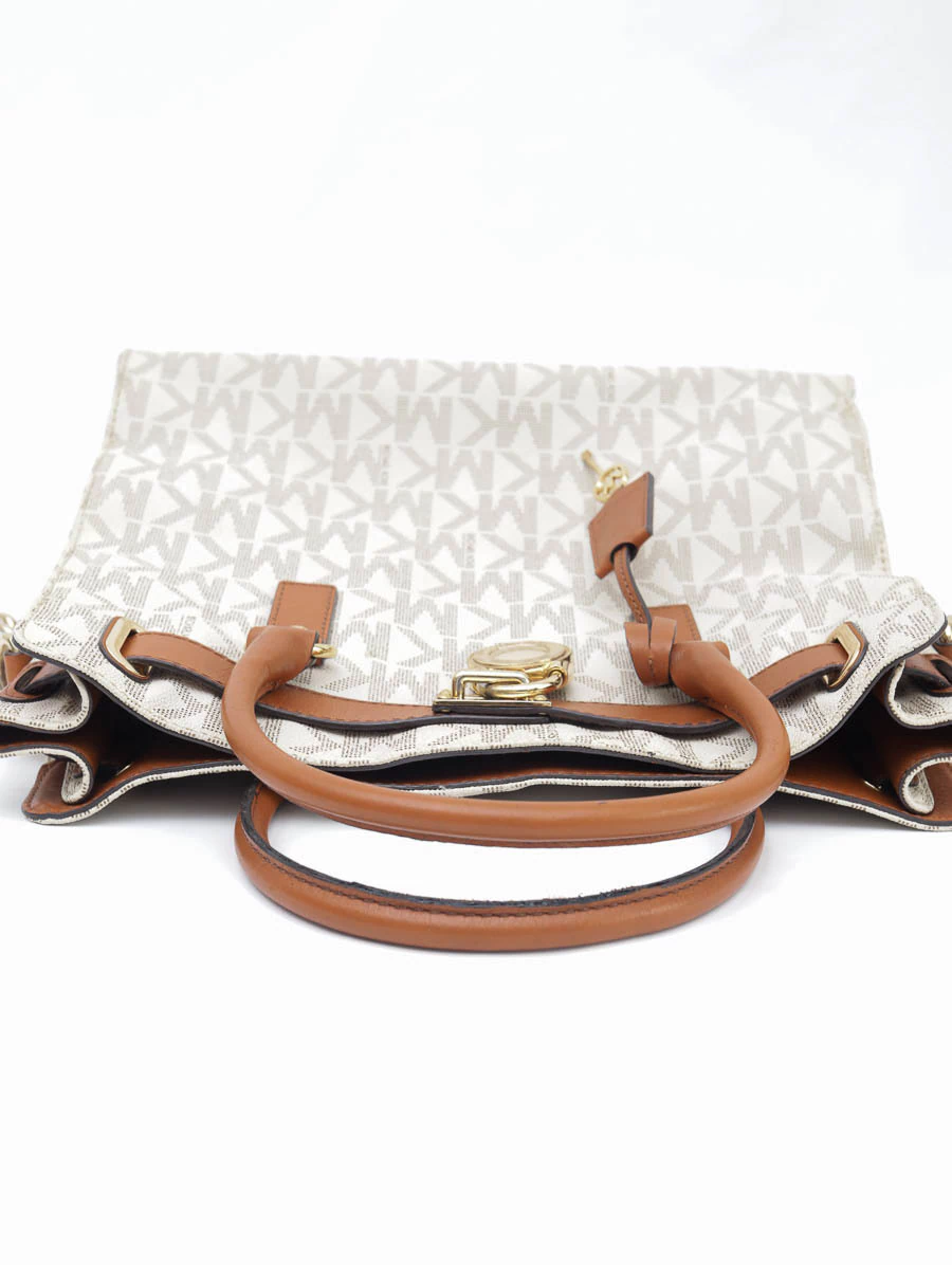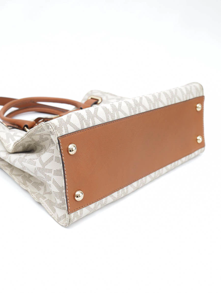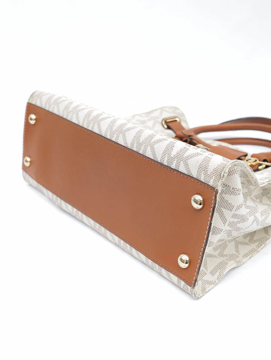 Bolsa Original Michael Kors Monograma produzida em canvas monograma, detalhes em couro marrom e ferragens douradas. Apresenta alças de mão, alça de ombro, abertura por fecho magnético, compartimento espaçoso com quatro bolsos abertos e um bolso com zíper.