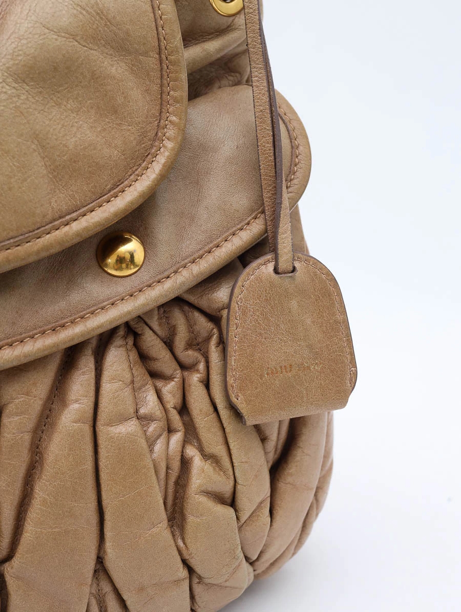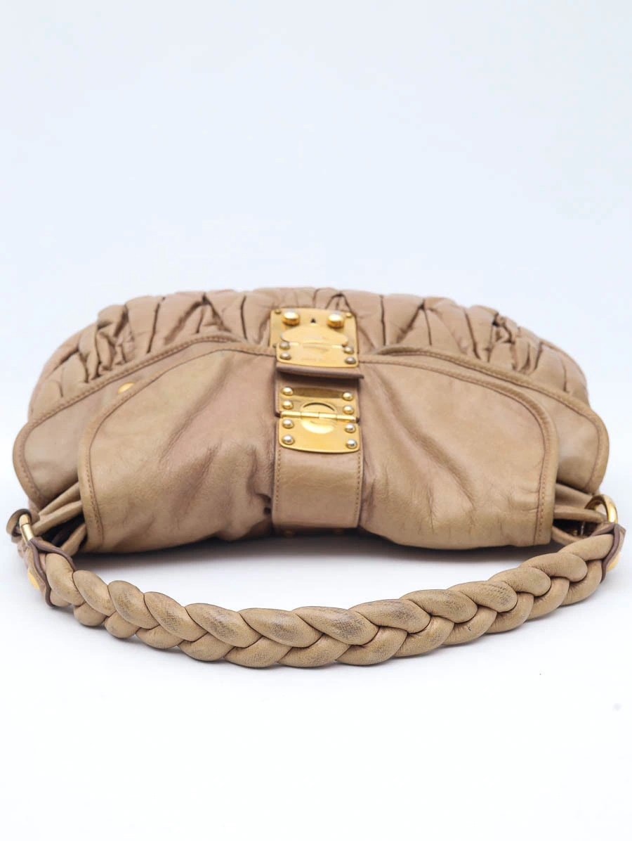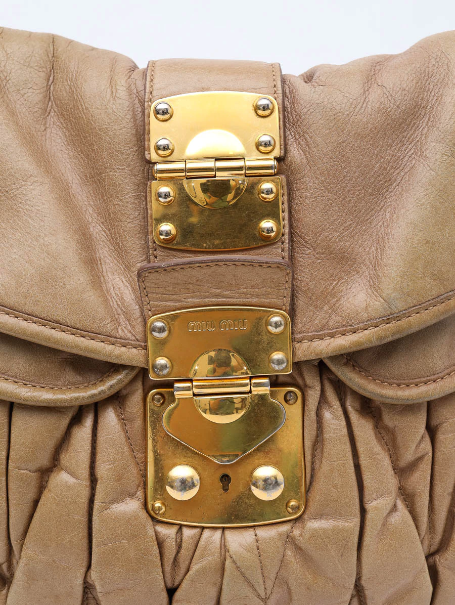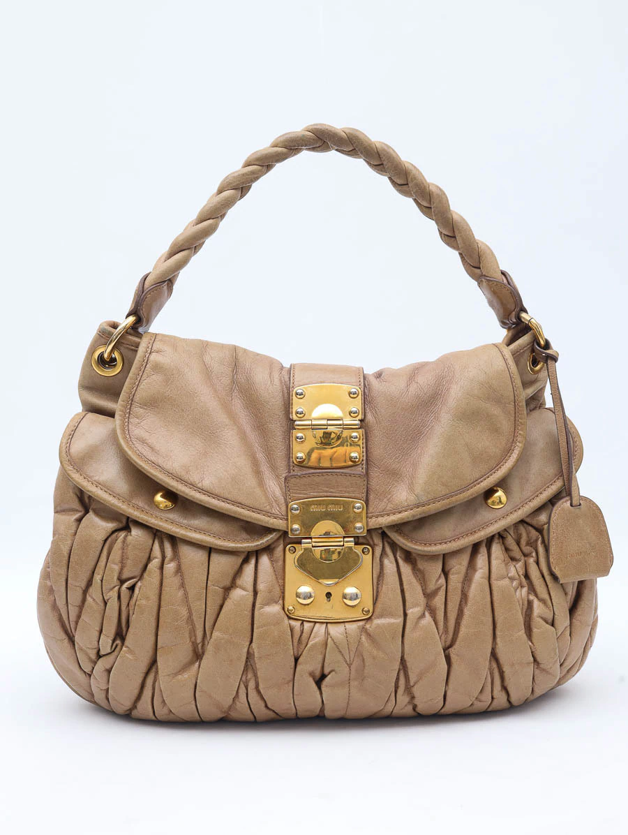 A Bolsa Original Miu Miu Coffer é um verdadeiro clássico da marca Miu Miu. Com seu design único e acabamento luxuoso, o modelo apresenta costuras no formato matelassê almofadadas e abas de abertura em couro liso e polido de vitelo na cor marrom. Apresenta uma alça de ombro em couro trançado e interior muito espaçoso.