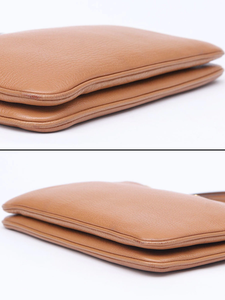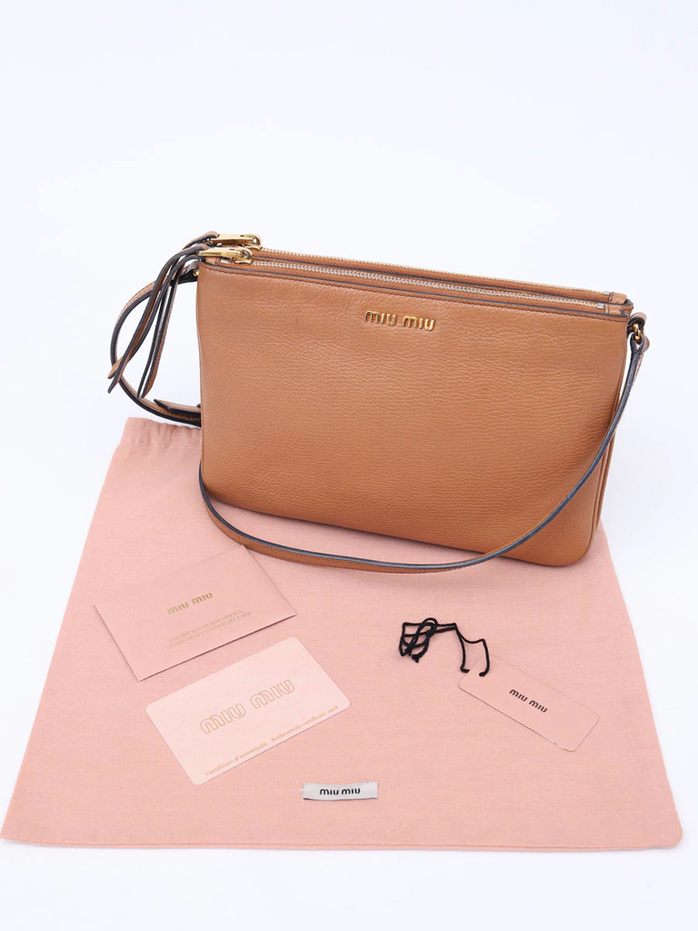 Bolsa Miu Miu Madras Naturale produzida com couro Miu Miu da região de Madras na cor caramelo e metais dourados. Apresenta alça longa crossbody com ajuste de comprimento e uma abertura superior com dois compartimentos separados com zíper. Seu interior luxuoso apresenta um bolso interno com zíper.