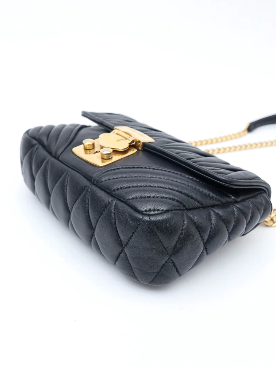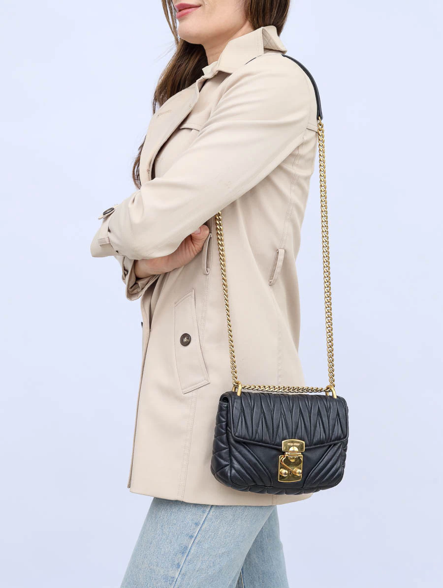 A Bolsa Miu Miu Nappa Biker é uma peça de estilo marcante e contemporâneo, confeccionada em couro nappa macio na cor preta, caracterizada por seu acabamento acolchoado com costuras que remetem ao universo do motociclismo — referência direta à inspiração "biker" da marca. O modelo apresenta metais dourados que conferem um toque sofisticado ao visual, com alça em correntes com detalhe em couro, possibilitando diferentes formas de uso: de forma dupla como alça de ombro ou esticada para uso como crossbody. O design é complementado por fecho de pressão aplicação do logotipo Miu Miu na parte frontal e detalhes metálicos que reforçam sua identidade urbana e luxuosa.