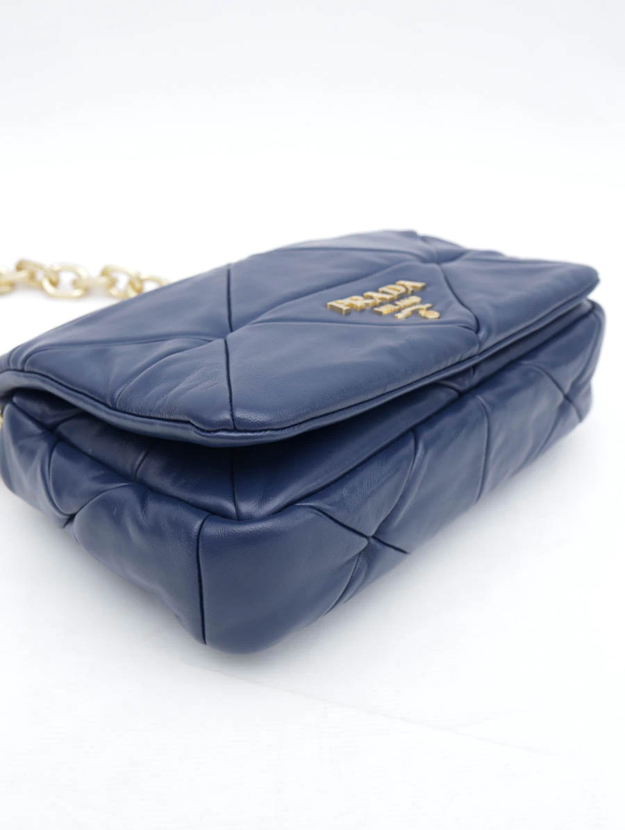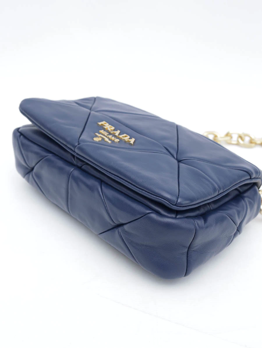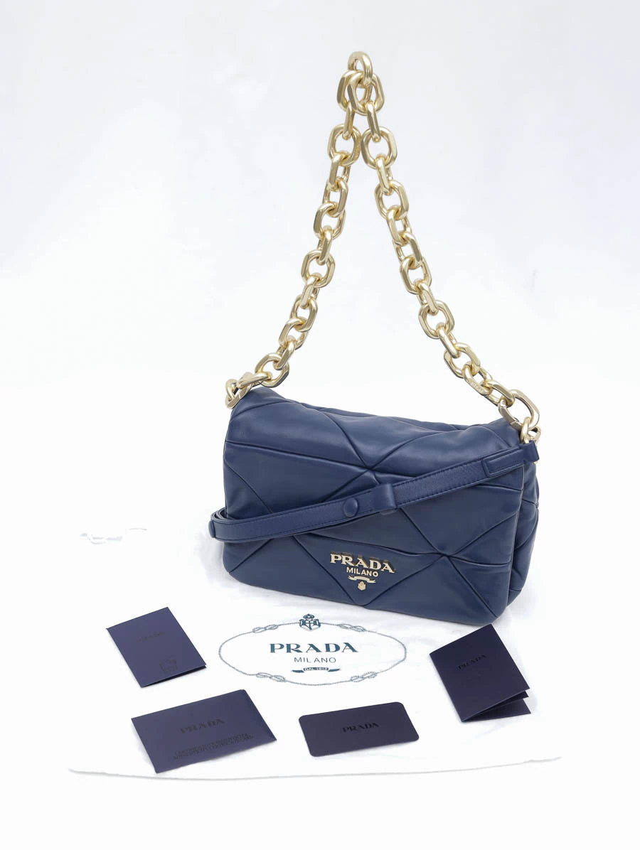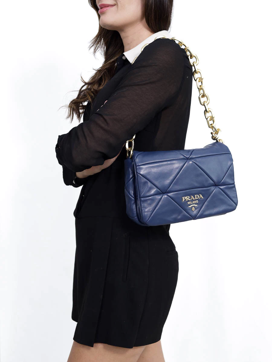 Bolsa Original Prada System em Nappa Patchproduzida em couro Prada Nappa na cor azul marinho e ferragens champanhe. Apresenta alças de ombro em correntes, alça longa removível com ajuste de comprimento, abertura flap com fecho oculto magnético, interior em couro e nylon com dois bolsos.